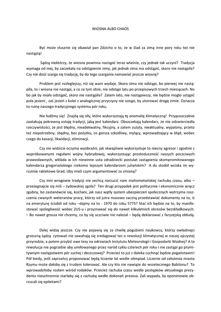 WIOSNA ALBO CHAOS Być może słusznie się obawiał pan Zdzicho o to, że w ślad za zimą inne pory roku też nie nastąpią! Sądzą niektórzy, że wiosna powinna nastąpić teraz właśnie, czy jednak tak uczyni? Tradycja wymaga od niej, by zaczekała na odstąpienie zimy, jak jednak zima ma odstąpić, skoro nie nastąpiła? Czy nie dość szarga się tradycję, by do tego szargania namawiać jeszcze wiosnę? Problem jest rozleglejszy, niż się wam wydaje. Skoro zima nie odstąpi, bo pierwej nie nastąpiła, to i wiosna nie nastąpi, a co za tym idzie, nie odstąpi latu po przepisowych trzech miesiącach. No bo jak by miała odstąpić, skoro nie nastąpiła? Zatem lato, nie nastąpiwszy, nie będzie mogło ustąpić pola jesieni , zaś jesień z kolei z analogicznej przyczyny nie ustąpi, by utorować drogę zimie. Oznacza to ruinę naszego tradycyjnego systemu pór roku. Nie łudźmy się! Znajdą się siły, które wykorzystają tę anomalię klimatyczną! Przypuszczalnie zaatakują pokrewną ostoję tradycji, jaką jest kalendarz. Obszczekają kalendarz, że nie odzwierciedla rzeczywistości, że jest błędny, nieadekwatny, fikcyjny, a zatem zużyty, nieaktualny, wypalony, przeto też niepotrzebny, zbędny, bez pożytku, co gorsza szkodliwy, mylący, wprowadzający w błąd, wobec czego do kasacji, likwidacji, eliminacji. Czy nie widzicie oczyma wyobraźni, jak skwapliwie wykorzystuje to niecny agresor i zgodnie z wypróbowanymi regułami wojny hybrydowej, wykorzystując prostoduszność naszych poczciwych prawosławnych, wkłada w ich niewinne usta zdradziecki postulat zastąpienia skompromitowanego kalendarza gregoriańskiego rzekomo lepszym kalendarzem juliańskim? A do stodół wciska im wyrzutnie rakietowe Grad, iżby mieli czym argumentować za zmianą? Czy inni wrogowie tradycji nie zechcą narzucić nam mahometańskiej rachuby czasu, albo – przeżegnajcie się mili – żydowskiej zgoła? Ten drugi przypadek jest politycznie i ekonomicznie wręcz zgubny, bo zastanówcie się, kochani, jak nasz wątły system ubezpieczeń społecznych wytrzyma roszczenia cwanych weteranów pracy, którzy od jutra masowo zaczną przedstawiać dokumenty na to, iż na emeryturę ściubili od roku –dajmy na to - 1970 do roku 5775? Stać ich będzie na to, by manifestować spolegliwość wobec ZUS-u i przyznawać się do nawet kilkuletnich okresów bezskładkowych. – Bo nawet grosza nie chcemy, co by się uczciwie nie należał – będą deklarować z faryzejską obłudą. Dalej widzę jeszcze. Czy nie pojawią się za chwilę pogubieni naukowcy, którzy owładnięci grzeszną żądzą cytowań nie zawahają się zredagować tez o rewolucji klimatycznej w naszej ojczystej przyrodzie, a potem przybić owe tezy na odrzwiach Instytutu Meteorologii i Gospodarki Wodnej? A ta rewolucja nie pogrzebie aby umiłowanego przez naród cyklu czterech pór roku i nie zastąpi go prymitywnym następstwem pór suchej i deszczowej? Przecież to już z daleka cuchnąć będzie pogaństwem! Pół biedy, jeśli zaprzańcy proponować będą liczenie lat wedle olimpiad. Liczenie od założenia miasta Rzymu może dałoby się z trudem tolerować. Ale czy kto nie nawiąże do wszetecznego Babilonu? To wprowadziłoby rozłam wśród rodaków. Przecież rachuba czasu wedle postępków aktualnego prezydenta nieuchronnie starłaby się z rachubą wedle dokonań prezesa. Zali wypada, by eponimowie obrzucali się epitetami? Pozostaje liczyć na niespodziewany atak zimy. Ponoć w marcu jak w garncu, a kwiecień to plecień. Niech wróci normalność. Pan Zdzicho wznosi za to toast w znanym wam lokalu „U Henia”. Znajoma z Nowej Soli niech też za to wychyli.