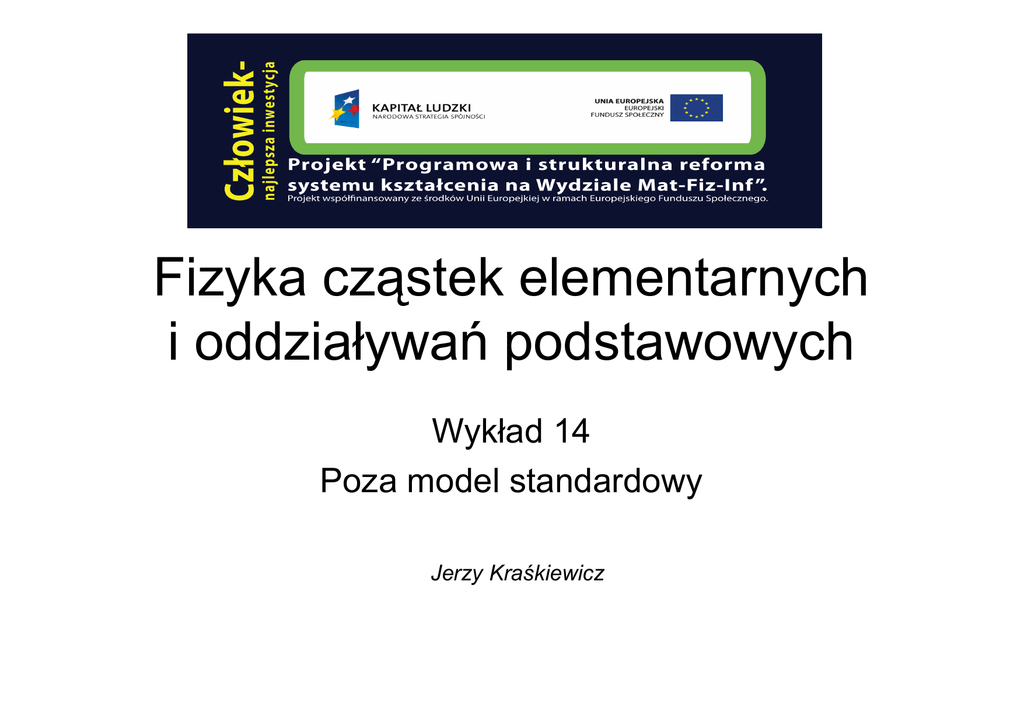 Fizyka cząstek elementarnych i oddziaływań podstawowych Wykład 14 Poza model standardowy Jerzy Kraśkiewicz Oscylacje neutrin W minimalnym MS neutrina są bezmasowe. Obecnie wykryto, Ŝe neutrina mają masę! Oscylacje pomiędzy zapachami neutrin (e.g. νe ↔ νµ ) wystąpią, jeśli 1) róŜne zapachy neutrin mają róŜną masę 2) słabe oddziaływania nie są diagonalne w bazie masy (jak dla kwarków) 2-zapachowe prawdopodobieństwo przejścia: Kąt mieszania RóŜnica mas [eV] 2 ∆m L 2 2 → = P(νµ νe ;L) sin 2θ sin ( 1.27 ) E Długość drogi [km] Energia [GeV] Neutrino Sytuacja eksperymentalna : Słoneczne ν: Zmiana zapachu z νe na νµ lub ντ Atmosferyczne ν: Znikanie νµ najprawdopododobniej na ντ Interpretacja danych w ramach MS: ∆m2 jest rzędu 10-4 - 10-3 eV2 (ale nie daje nam masy) kąty mieszania są większe niŜ w sektorze kwarkowym Program dla eksperymentów : Wiele eksperymentów ustawionych na obserwację ν słonecznych, atmosferycznych, kosmicznych, z Super Nowej Długo zasięgowe eksperymenty ⇒ ziemskie oscylacje ν ”Fabryki neutrin” Polepszenie pomiaru masy neutrina Otwarte pytania Model Standardowy Skąd pochodzi masa cząstek? Czy istnieje cząstka Higgsa? Dlaczego występują tylko 3 generacje? Jaką masę mają neutrina i dlaczego tak małą? Jaka jest natura łamania symetrii CP? Czy swobodny proton moŜe się rozpaść? Czy cząstki fundamentalne mają strukturę? Wielka unifikacja Czy siły unifikują się i przy jakiej energii? Dlaczego grawitacja jest tak odmienna? Czy grawitację moŜna połączyć z pozostałymi siłami? Czy istnieją nowe siły? Otwarte pytania Nowe symetrie i struktura czasoprzestrzeni Czy istnieje w przyrodzie supersymetria bozony-fermiony? Czy istnieją dodatkowe wymiary? supergrawitacja, struny? Jaka jest kwantowa teoria grawitacja? Otwarte pytania Dla r < R, grawitacja spełnia prawo Newtona w 4 + δ wymiarach: GS V (r) = δ +1 r Jeśli np. R ~ O(100 µm) and δ = 2 ⇒ Grawitacja mogłaby być widoczna w zderzeniach o energii rzędu TeV! Otwarte pytania Czy MS jest ostateczną teorią? • mechanizm Higgsa jest najsłabszą częścią MS: -- mechanizm “ad hoc” -- problem dopasowania poprawek radiacyjnych H H Jeśli chcemy, aby teoria obowiązywała aŜ do 1015 GeV, wtedy musimy mieć gigantyczne kasowania między poprawkami do masy wyŜszych rzędów oraz masą najniŜszego rzędu w celu uzyskania masy cząstki Higgsa nie większej od 1 TeV Symetria SU(5) Grupy U(1), SU(2) i SU(3) są podgrupami ogólniejszej grupy SU(5) 1974 – Georgi, Glashow Podstawowe reprezentacje 5 i 10 zawierają zarówno leptony i kwarki jednej generacji ν e − e d r db d g 0 + −e −d r − db − dg e+ 0 − ur dr ur 0 db ub ug − ub − ug − ug − ub 0 − ur dg ug ub ur 0 Symetria SU(5) 24 bozony cechowania: foton, W+, W-, Z0, 8 gluonów 6 leptokwarków Q=− 1 3 (Yr, Yb, Yg) 4 (Xr, Xb, Xg) 3 6 antyleptokwarków Q=− Leptokwarki zamieniają leptony w kwarki i vice versa Rozpad protonu w SU(5) Leptokwarki nie zachowują liczby leptonowej L, ale zachowują L-B Mogą zajść procesy rozpadu: e+ u p → e +π + X 0 d d u d u Y p →ν e + π + νe d u d u SU(5) przewiduje czas Ŝycia τ = 1030±1 lat Eksperyment (Super Kamiokande) ogranicza: τ > 5.4 ⋅1033 lat Model SU(5) wykluczony! Supersymetria SUSY KaŜdy bozon ma supersymetrycznego partnera fermionowego KaŜdy fermion ma supersymetrycznego partnera bozonowego Cząstki i ich superpartnerzy mają takie same masy i stałe sprzęŜenia Masy cząstek SUSY > 100 GeV Dotychczas nie znaleziono supersymetrycznych partnerów zwykłych cząstek Nowa multiplikatywna, zachowana liczba kwantowa R R(cząstka) = +1, R(supercząstka) = –1 wniosek 1 – produkcja supercząstek tylko parami ~ ~ a + b→ a+ b R = (+1) ⋅ (+1) = (−1) ⋅ (−1) wniosek 2 – najlŜejsza cząstka SUSY (LSP) powinna być stabilna Supersymetria Grawitacja Grawitacja Grawiton Wielka Unifikacja spin=2 Grawitono Wielka Unifikacja spin=3/2 Silne Kwark Silne Gluon 1/2 Gluino 1 1/2 Elektrosłabe W, Z Higgs Lepton 1/2 1 0 Super Elektrosłabe Foton 1 Skwark Fotino 1/2 Wino Zino Higgsino 1/2 Slepton 0 Supersymetria Hipotezy: LSP jest kandydatem na cząstki Ciemnej Materii LSP powstały w trakcie Wielkiego Wybuchu i wypełniają współczesny Wszechświat LSP oddziałują tylko grawitacyjnie (brak oznak w innych oddziaływaniach) Kandydatem na LSP są: grawitino i neutralino (superpozycja fotina, zina i higgsina) MSSM Najpopularniejszym modelem z sypersymetrią jest Minimalny Supersymetryczny Model Standardowy BieŜące stałe sprzęŜenia SM MSSM Energia [GeV] Brak unifikacji przy duŜych energiach – brak zbiegania się do punktu Energia [GeV] Stałe sprzęŜenia zbiegają się w skali GUT (teoria wielkiej unifikacji) Unifikacja sił Elektryczność Elektromagnetyzm Maxwell Oddziaływania elektrosłabe Magnetyzm Model Standardowy Weinberg Siły jądrowe słabe Fermi Siły jądrowe silne Rutheford EW Wielka unifikacja SUSY QCD Yukawa Super struny? Galileusz Ziemska Newton Grawitacja Einstain Niebieska Kepler Grawitacja kwantowa?