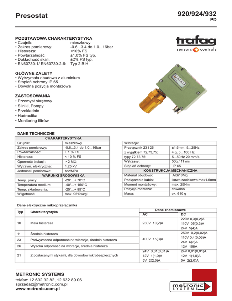 920/924/932 Presostat PD PODSTAWOWA CHARAKTERYSTYKA • Czujnik: mieszkowy • Zakres pomiarowy: -0.6...3.4 do 1.0...16bar • Histereza: <10% FS • Powtarzalnoœæ: ±1.0% FS typ. • Dok³adnoœæ skali: ±2% FS typ. • EN60730-1/ EN60730-2-6: Typ 2.B.H G£ÓWNE ZALETY • Wytrzyma³a obudowa z aluminium • Stopieñ ochrony IP 65 • Dowolna pozycja monta¿owa ZASTOSOWANIA • Przemys³ okrêtowy • Silniki, Pompy • Przek³adnie • Hudraulika • Monitoring filtrów DANE TECHNICZNE CHARAKTERYSTYKA Czujnik: mieszkowy Zakres pomiarowy: -0.6...3.4 do 1.0...16bar Powtarzalnoœæ: ± 1 % FS Histereza: < 10 % FS Opornoœæ izolacji : > 2 MW Wytrzym. elektryczna: 1.25 kV Jednostki pomiarowe: bar/MPa WARUNKI ŒRODOWISKA Temp. pracy: -20°...+ 70°C Temperatura medium: -40°...+ 150°C Temp. sk³adowania: -25°...+ 85°C Wilgotnoœæ: max. 95%wzgl. g Wibracje: Prze³¹cznik 23 i 26 ±1.6mm, 5...25Hz z wyj¹tkiem 72,73,75: 4 g, 5...100 Hz typy 72,73,75: 5...50Hz 20 mm/s. Wstrz¹sy: 50g / 11 ms Stopieñ ochrony: IP 65 KONSTRUKCJA MECHANICZNA Materia³ obudowy: AlSi10Mg Pod³¹czenie kabla: listwa zaciskowa max1.5mm Moment monta¿owy: max. 25Nm Pozycja monta¿u: dowolna Masa: ok. 610 g Dane elektryczne mikroprze³¹cznika Typ Charakterystyka 10 Ma³a histereza 11 Œrednia histereza 23 Podwy¿szona odpornoœæ na wibracje, œrednia histereza 26 Wysoka odpornoœæ na wibracje, œrednia histereza 21 Z poz³acanymi stykami, dla obwodów iskrobezpiecznych METRONIC SYSTEMS tel/fax: 12 632 32 82, 12 632 89 06 [email protected] www.metronic.com.pl Dane znamionowe DC 220V 0,3(0,2)A 250V 10(2)A 110V 05(0,3)A 24V 5(4)A 250V 0,2(0,02)A 110V 0,4(0,03)A 400V 15(3)A 24V 6(2)A 12V 158A 24V 0,01(0,01)A 24V 0,01(0,01)A 12V 1(1,0)A 12V 1(1,0)A 5V 2(2,0)A 5V 2(2,0)A AC 920/924/932 Presostat PD Histereza (bar) 74 -0,6...3,4 Zakres (bar) 76 0...4,0 ~0,08 ~0,16 ~0,25 10 11/21/23 26 Mikroprze³¹cznik 77 0...6,0 78 1...10 79 1...16 ~0,1 ~0,4 ~0,5 INFORMACJE DO ZAMÓWIENIA Warianty kodu XXX. XX XX. XXX. XX. XX... Z wziernikiem i œrub¹ regul. 920 Bez wziernika, ze œrub¹ regul. 924 Z wziernikiem i pokrêt³em regul. 932 Mikroprze³¹cznik Ma³a histereza 10 Œrednia histereza 11 Zwiêkszona odpornoœæ na wibracje 23 Wysoka odpornoœæ na wibracje 26 Poz³acane styki 21 Zakres [bar] Ciœnienie max [bar] Ciœnienie rozrywaj¹ce [bar] -0,6 … 3.4 12 26 74 0.0 … 4.0 12 26 76 0.0 … 6.0 12 26 77 1.0 … 10.0 24 36 78 1.0 … 16.0 24 36 79 Czujnik Materia\ Mieszek: br¹z Obudowa: mosi¹dz niklowany Mieszek: br¹z Obudowa: mosi¹dz 1) G 1/8”f G 1/4”f Gwint 1) G 1/2 ”m 2) 1) G 1/8”f G 1/4”f 1) G 1/2 ”m 2) Mieszek: 1.4435 Czêœci w kontakcie z medium: 1.4435 Obudowa: mosi¹dz niklowany G 1/8”f 1) G 1/4”f 1) G 1/2 ”m 74 931 930 932 981 980 982 831 830 832 76, 77 933 937 934 983 987 984 833 837 834 78, 79 935 938 936 985 988 986 935 838 836 Zakres 1) ¿eñski 2) 2) mêski Monta Bezpoœrednio 00 Za pomoc¹ wspornika monta¿owego 31 Akcesoria Plomba (zabezp. przed manipulacj¹) 16 Gwintowana d³awnica kablowa PG 16 32 Gwintowana d³awnica kablowa M 24 x 1.5 (DIN8280) 27 Gwintowana d³awnica kablowa M 18 x 1.5 (DIN8280) 40 Z³¹czka/adapter G1/8”mêski – G1/4” mêski; mosi¹dz A6 Z³¹czka/adapter G1/8”mêski – G1/4” mêski; mosi¹dz niklowany B6 Z³¹czka/adapter G1/8”mêski – G1/4” mêski; stal nierdzewna 1.4435 D6 Z³¹czka/adapter G1/8”mêski – G1/4” ¿eñski; mosi¹dz A5 Z³¹czka/adapter G1/8”mêski – G1/4” ¿eñski; mosi¹dz niklowany B5 Z³¹czka/adapter G1/8”mêski – G1/4” ¿eñski; stal nierdzewna 1.4435 D5 METRONIC SYSTEMS tel/fax: 12 632 32 82, 12 632 89 06 [email protected] www.metronic.com.pl