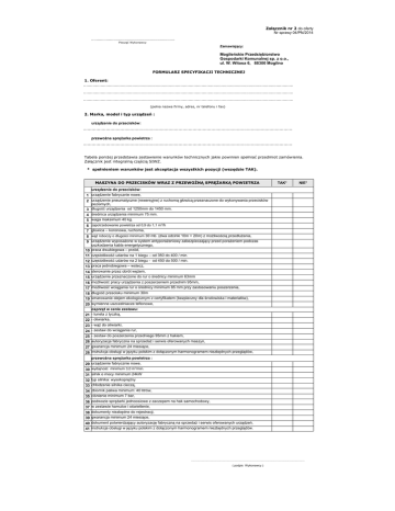 Załącznik nr 2 do oferty Nr sprawy 04/PN/2014 .................................................................... Pieczęć Wykonawcy Zamawiający: Mogileńskie Przedsiębiorstwo Gospodarki Komunalnej sp. z o.o., ul. W. Witosa 6, 88300 Mogilno FORMULARZ SPECYFIKACJI TECHNICZNEJ 1. Oferent: ................................................................................................................................................................ ................................................................................................................................................................ ................................................................................................................................................................ (pełna nazwa firmy, adres, nr telefonu i fax) 2. Marka, model i typ urządzeń : urządzenie do przecisków: ................................................................................................................................................................ przewoźna sprężarka powietrza : ................................................................................................................................................................ Tabela poniżej przedstawia zestawienie warunków technicznych jakie powinien spełniać przedmiot zamówienia. Załącznik jest integralną częścią SIWZ. * spełnieniem warunków jest akceptacja wszystkich pozycji (wszędzie TAK). MASZYNA DO PRZECISKÓW WRAZ Z PRZEWOŹNĄ SPRĘŻARKĄ POWIETRZA TAK* NIE* urządzenie do przecisków: 1 urządzenie fabrycznie nowe, 2 urządzenie pneumatyczne (rewersyjne) z ruchomą głowicą przeznaczone do wykonywania przecisków poziomych, 3 długość urządzenia od 1250mm do 1450 mm. 4 średnica urządzenia minimum 75 mm. 5 waga maksimum 40 kg. 6 zapotrzebowanie powietrza od 0,9 do 1,1 m3/h 7 głowica – koronowa, ruchoma, 8 wąż roboczy o długości minimum 30 mb. (dwa odcinki 10m + 20m) z możliwością przedłużenia, 9 urządzenie wyposażone w system antyporażeniowy zabezpieczający przed porażeniem podczas uszkodzenia kabla energetycznego, 10 praca dwubiegowa – przód, 11 częstotliwość udarów na 1 biegu – od 350 do 400 / min. 12 częstotliwość udarów na 2 biegu - od 450 do 500 / min. 13 praca jednobiegowa – wstecz, 14 sterowanie przez obrót wężem, 15 urządzenie przeznaczone do rur o średnicy minimum 63mm 16 możliwość pracy urządzenia z poszerzeniem przednim 95mm, 17 możliwość wciągania rur o średnicy minimum 85 mm przy zastosowaniu poszerzenia, 18 długość przecisku minimum 30m 19 smarowanie olejem ekologicznym z certyfikatem (bezpieczny dla środowiska i materiałów), 20 wymienne uszczelniacze teflonowe, osprzęt w cenie zestawu: 21 - luneta z tyczką, 22 - oliwiarka, 23 - wąż do oliwiarki, 24 - zestaw do wciągania rur, 25 - zestaw do poszerzenia przedniego 95mm z hakiem, 26 autoryzacja fabryczna na sprzedaż i serwis oferowanych maszyn, 27 gwarancja minimum 24 miesiące, 28 instrukcja obsługi w języku polskim z dołączonym harmonogramem niezbędnych przeglądów, przewoźna sprężarka powietrza : 29 urządzenie fabrycznie nowe, 3 30 wydajność minimum 3,0 m /min. 31 silnik o mocy minimum 24kW 32 typ silnika: wysokoprężny 33 chłodzenie silnika cieczą, 34 zbiornik paliwa minimum: 40 litrów, 35 ciśnienie minimum 7 bar, 36 podwozie sprężarki jednoosiowe z zaczepem na hak samochodowy, 37 w zestawie hamulce i oświetlenie, 38 dokumenty niezbędne do rejestracji, 39 gwarancja minimum 24 miesiące, 40 dokument potwierdzający autoryzację fabryczną na sprzedaż i serwis oferowanych urządzeń, 41 instrukcja obsługi w języku polskim z dołączonym harmonogramem niezbędnych przeglądów. ................................................................................................................................... ( podpis Wykonawcy )