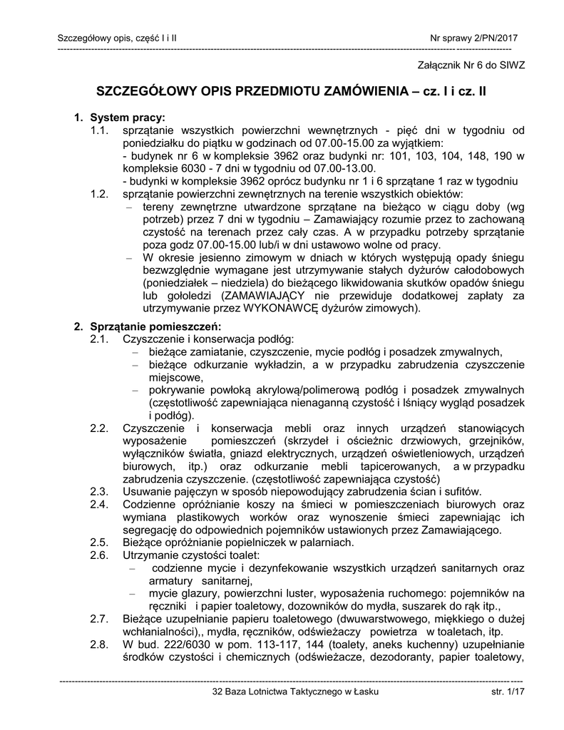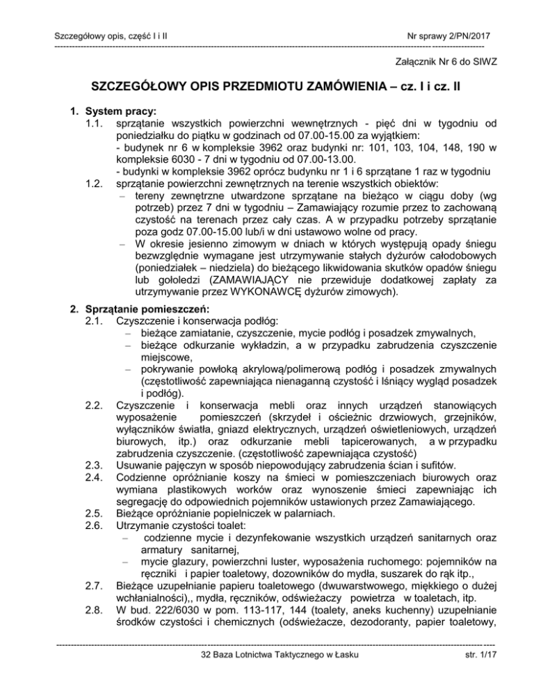 Szczegółowy opis, część I i II Nr sprawy 2/PN/2017 ---------------------------------------------------------------------------------------------------------------------------------- ------------------ Załącznik Nr 6 do SIWZ SZCZEGÓŁOWY OPIS PRZEDMIOTU ZAMÓWIENIA – cz. I i cz. II 1. System pracy: 1.1. sprzątanie wszystkich powierzchni wewnętrznych - pięć dni w tygodniu od poniedziałku do piątku w godzinach od 07.00-15.00 za wyjątkiem: - budynek nr 6 w kompleksie 3962 oraz budynki nr: 101, 103, 104, 148, 190 w kompleksie 6030 - 7 dni w tygodniu od 07.00-13.00. - budynki w kompleksie 3962 oprócz budynku nr 1 i 6 sprzątane 1 raz w tygodniu 1.2. sprzątanie powierzchni zewnętrznych na terenie wszystkich obiektów: – tereny zewnętrzne utwardzone sprzątane na bieżąco w ciągu doby (wg potrzeb) przez 7 dni w tygodniu – Zamawiający rozumie przez to zachowaną czystość na terenach przez cały czas. A w przypadku potrzeby sprzątanie poza godz 07.00-15.00 lub/i w dni ustawowo wolne od pracy. – W okresie jesienno zimowym w dniach w których występują opady śniegu bezwzględnie wymagane jest utrzymywanie stałych dyżurów całodobowych (poniedziałek – niedziela) do bieżącego likwidowania skutków opadów śniegu lub gołoledzi (ZAMAWIAJĄCY nie przewiduje dodatkowej zapłaty za utrzymywanie przez WYKONAWCĘ dyżurów zimowych). 2. Sprzątanie pomieszczeń: 2.1. Czyszczenie i konserwacja podłóg: – bieżące zamiatanie, czyszczenie, mycie podłóg i posadzek zmywalnych, – bieżące odkurzanie wykładzin, a w przypadku zabrudzenia czyszczenie miejscowe, – pokrywanie powłoką akrylową/polimerową podłóg i posadzek zmywalnych (częstotliwość zapewniająca nienaganną czystość i lśniący wygląd posadzek i podłóg). 2.2. Czyszczenie i konserwacja mebli oraz innych urządzeń stanowiących wyposażenie pomieszczeń (skrzydeł i ościeżnic drzwiowych, grzejników, wyłączników światła, gniazd elektrycznych, urządzeń oświetleniowych, urządzeń biurowych, itp.) oraz odkurzanie mebli tapicerowanych, a w przypadku zabrudzenia czyszczenie. (częstotliwość zapewniająca czystość) 2.3. Usuwanie pajęczyn w sposób niepowodujący zabrudzenia ścian i sufitów. 2.4. Codzienne opróżnianie koszy na śmieci w pomieszczeniach biurowych oraz wymiana plastikowych worków oraz wynoszenie śmieci zapewniając ich segregację do odpowiednich pojemników ustawionych przez Zamawiającego. 2.5. Bieżące opróżnianie popielniczek w palarniach. 2.6. Utrzymanie czystości toalet: – codzienne mycie i dezynfekowanie wszystkich urządzeń sanitarnych oraz armatury sanitarnej, – mycie glazury, powierzchni luster, wyposażenia ruchomego: pojemników na ręczniki i papier toaletowy, dozowników do mydła, suszarek do rąk itp., 2.7. Bieżące uzupełnianie papieru toaletowego (dwuwarstwowego, miękkiego o dużej wchłanialności),, mydła, ręczników, odświeżaczy powietrza w toaletach, itp. 2.8. W bud. 222/6030 w pom. 113-117, 144 (toalety, aneks kuchenny) uzupełnianie środków czystości i chemicznych (odświeżacze, dezodoranty, papier toaletowy, --------------------------------------------------------------------------------------------------------------------------------------------------- ---32 Baza Lotnictwa Taktycznego w Łasku str. 1/17 Szczegółowy opis, część I i II Nr sprawy 2/PN/2017 ---------------------------------------------------------------------------------------------------------------------------------- ------------------ ręczniki papierowe) o wysokim standardzie. W uzgodnieniu z Zamawiającym bieżąca kontrola czystości w/w pomieszczeń i natychmiastowe działanie naprawcze w przypadku wykrycia nieprawidłowości (brak papieru, brak odświeżonego zapachu, inne) 2.9. Utrzymanie w czystości wejść do budynków w tym: poręczy drewnianych i metalowych konstrukcji balustrad i krat, drzwi oraz znajdujących się przy wejściach tablic informacyjnych, wycieraczek. 2.10. Utrzymanie w stałej czystości ścian, podłóg, sufitów i drzwi znajdujących się w budynku. 2.11. Mycie okien i ram okiennych, parapetów wewnętrznych i zewnętrznych, w terminach zgłoszonych przez Zamawiającego na całej powierzchni biurowej objętej sprzątaniem (zgodnie z opracowanym harmonogramem na wykonywanie czynności okresowych). Zamawiający zwraca uwagę na konieczność mycia okien, żaluzji zewnętrznych na wysokości (stosowanie zabezpieczenia) w szczególności okien i dachu – świetlika- wykonanego z pakietów szybowych. W tym celu Wykonawca we własnym zakresie w uzgodnieniu z Zamawiającym winien przygotować się do wykonania w/w prac (użycie podnośnika, rusztowanie lub inne). Okna w bud. 9; 36; 37/2617 – klatki schodowe; oraz bud. 100/2617 - hala sportowa duża i mała sala też konieczny podnośnik od zewnątrz a wewnątrz rusztowania. 2.12. Szczegółowy opis i częstotliwość wykonywanych czynności utrzymania porządku w obiektach kubaturowych: WYKONYWANE CODZIENNIE zakres czynności pomieszczenia korytarze, hole, pomieszczenia biurowe klatki schodowe, toalety, WC zamiatanie, mycie i odkurzanie podłóg (rodzaj zabiegu musi być dostosowany do rodzaju podłogi), czyszczenie listew przypodłogowych i ochronnych, mycie poręczy i balustrad, ścieranie kurzu z parapetów, opróżnianie i czyszczenie koszy na śmieci oraz wyposażanie ich w worki foliowe na śmieci (worki foliowe zabezpiecza wykonawca); Wykonawca uzupełnia pojemniki w przeciągu miesiąca od zawarcia umowy na mydło w płynie, na papier toaletowy oraz ręczniki we wszystkich pomieszczeniach wc, w których nie ma pojemników, wymiany bieżące stosownie do potrzeb czyszczenie glazury i terakoty łazienkowej, czyszczenie armatury łazienkowej, usuwanie rdzy i kamienia z urządzeń sanitarnych, czyszczenie luster wiszących, zabezpieczenie w papier toaletowy (dwuwarstwowy), ręczniki papierowe jednorazowego użytku (dwuwarstwowe), mydło, środki zapachowe i de