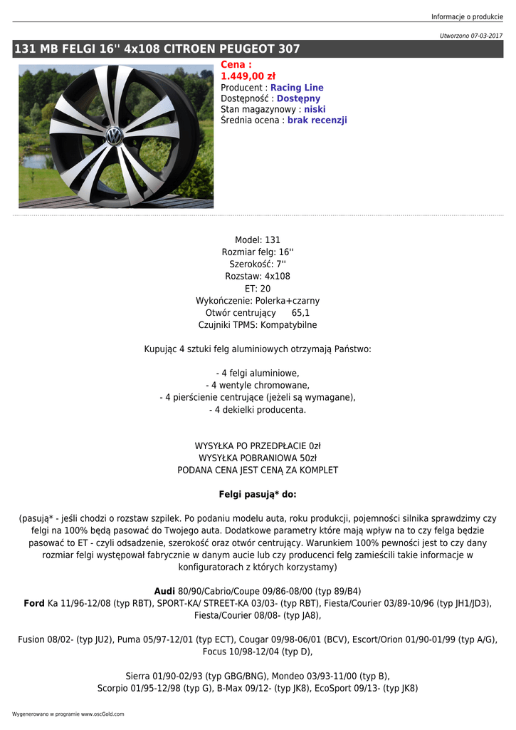 Informacje o produkcie Utworzono 07-03-2017 131 MB FELGI 16'' 4x108 CITROEN PEUGEOT 307 Cena : 1.449,00 zł Producent : Racing Line Dostępność : Dostępny Stan magazynowy : niski Średnia ocena : brak recenzji Model: 131 Rozmiar felg: 16'' Szerokość: 7'' Rozstaw: 4x108 ET: 20 Wykończenie: Polerka+czarny Otwór centrujący 65,1 Czujniki TPMS: Kompatybilne Kupując 4 sztuki felg aluminiowych otrzymają Państwo: - 4 felgi aluminiowe, - 4 wentyle chromowane, - 4 pierścienie centrujące (jeżeli są wymagane), - 4 dekielki producenta. WYSYŁKA PO PRZEDPŁACIE 0zł WYSYŁKA POBRANIOWA 50zł PODANA CENA JEST CENĄ ZA KOMPLET Felgi pasują* do: (pasują* - jeśli chodzi o rozstaw szpilek. Po podaniu modelu auta, roku produkcji, pojemności silnika sprawdzimy czy felgi na 100% będą pasować do Twojego auta. Dodatkowe parametry które mają wpływ na to czy felga będzie pasować to ET - czyli odsadzenie, szerokość oraz otwór centrujący. Warunkiem 100% pewności jest to czy dany rozmiar felgi występował fabrycznie w danym aucie lub czy producenci felg zamieścili takie informacje w konfiguratorach z których korzystamy) Audi 80/90/Cabrio/Coupe 09/86-08/00 (typ 89/B4) Ford Ka 11/96-12/08 (typ RBT), SPORT-KA/ STREET-KA 03/03- (typ RBT), Fiesta/Courier 03/89-10/96 (typ JH1/JD3), Fiesta/Courier 08/08- (typ JA8), Fusion 08/02- (typ JU2), Puma 05/97-12/01 (typ ECT), Cougar 09/98-06/01 (BCV), Escort/Orion 01/90-01/99 (typ A/G), Focus 10/98-12/04 (typ D), Sierra 01/90-02/93 (typ GBG/BNG), Mondeo 03/93-11/00 (typ B), Scorpio 01/95-12/98 (typ G), B-Max 09/12- (typ JK8), EcoSport 09/13- (typ JK8) Wygenerowano w programie www.oscGold.com Mazda 121 96-03, 2 03-07, Tata Indica/Vista 01/10Volvo 850 09/91-08/93 (typ LS-LW) Zgodnie z Kodeksem PWP art.156 ust 3, emblematy widoczne na felgach mają charakter wyłącznie informacyjny i nie należy się tym sugerować, że jest to produkt oryginalny danego producenta samochodu. Alufelgi dobieramy wg parametrów katalogowych producentów. W przypadku niektórych modeli aut lub felg zachodzi konieczność zastosowania dystansów, śrub/nakrętek ampułkowych. Ponieważ, zawsze może zajść taka sytuacja w której katalog/konfigurator wprowadzi w błąd sprzedawcę zaleca się przed montażem opon przyłożyć felgę na piastę i sprawdzić czy felga nigdzie nie będzie obcierać. Po założeniu opon zwrot felg będzie nie możliwy.
