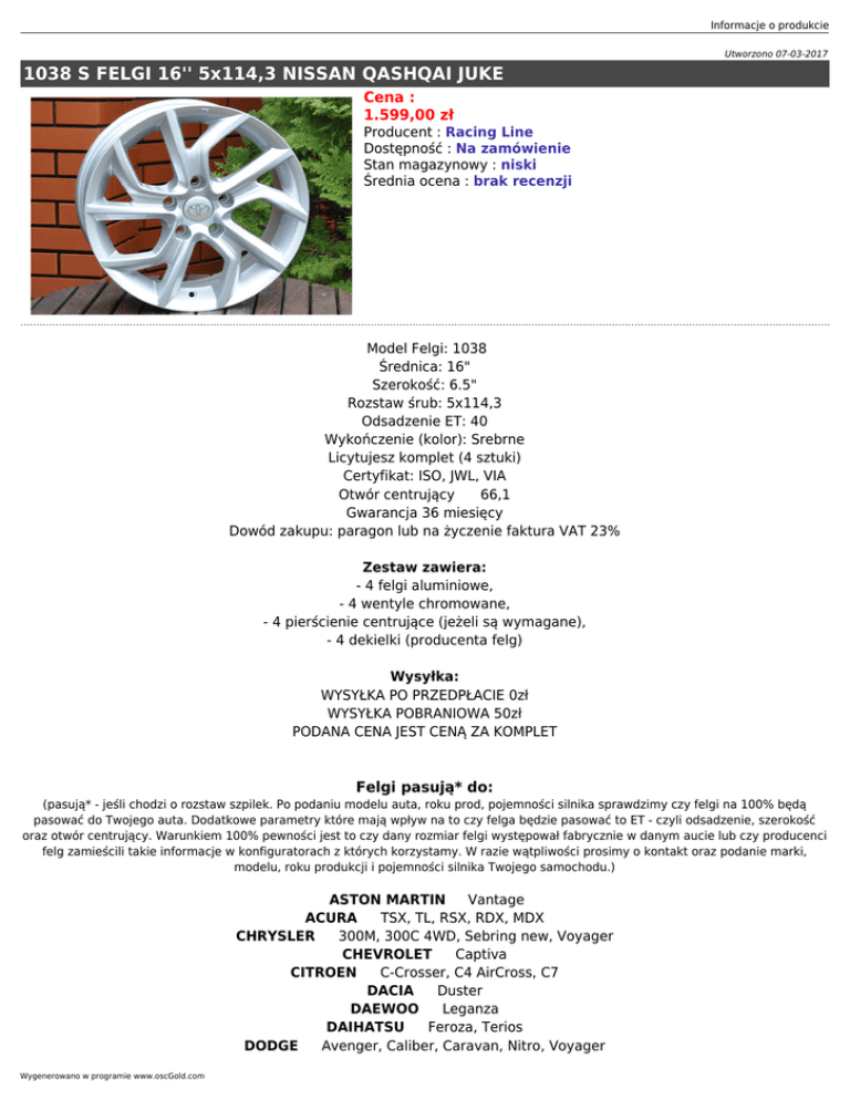 Informacje o produkcie Utworzono 07-03-2017 1038 S FELGI 16'' 5x114,3 NISSAN QASHQAI JUKE Cena : 1.599,00 zł Producent : Racing Line Dostępność : Na zamówienie Stan magazynowy : niski Średnia ocena : brak recenzji Model Felgi: 1038 Średnica: 16" Szerokość: 6.5" Rozstaw śrub: 5x114,3 Odsadzenie ET: 40 Wykończenie (kolor): Srebrne Licytujesz komplet (4 sztuki) Certyfikat: ISO, JWL, VIA Otwór centrujący 66,1 Gwarancja 36 miesięcy Dowód zakupu: paragon lub na życzenie faktura VAT 23% Zestaw zawiera: - 4 felgi aluminiowe, - 4 wentyle chromowane, - 4 pierścienie centrujące (jeżeli są wymagane), - 4 dekielki (producenta felg) Wysyłka: WYSYŁKA PO PRZEDPŁACIE 0zł WYSYŁKA POBRANIOWA 50zł PODANA CENA JEST CENĄ ZA KOMPLET Felgi pasują* do: (pasują* - jeśli chodzi o rozstaw szpilek. Po podaniu modelu auta, roku prod, pojemności silnika sprawdzimy czy felgi na 100% będą pasować do Twojego auta. Dodatkowe parametry które mają wpływ na to czy felga będzie pasować to ET - czyli odsadzenie, szerokość oraz otwór centrujący. Warunkiem 100% pewności jest to czy dany rozmiar felgi występował fabrycznie w danym aucie lub czy producenci felg zamieścili takie informacje w konfiguratorach z których korzystamy. W razie wątpliwości prosimy o kontakt oraz podanie marki, modelu, roku produkcji i pojemności silnika Twojego samochodu.) ASTON MARTIN Vantage ACURA TSX, TL, RSX, RDX, MDX CHRYSLER 300M, 300C 4WD, Sebring new, Voyager CHEVROLET Captiva CITROEN C-Crosser, C4 AirCross, C7 DACIA Duster DAEWOO Leganza DAIHATSU Feroza, Terios DODGE Avenger, Caliber, Caravan, Nitro, Voyager Wygenerowano w programie www.oscGold.com FIAT Sedici FORD Escape, Maverick, Probe HONDA Accord (>03), Accord Coupe (>98) + Type R, Civic, Civic Sport (>04) + TypeR, Civic Tourer (2014-), CR-V, CR-Z, HR-V, FR-V, Integra Type-R, NSX, S200, Odyssey, Prelude (4WS, BB6, BB8) (97-02), Shuttle, Stream HYUNDAI Coupe Tiburon (>02), Elantra, Genesis Coupe, Grandeur, I30, I30 Coupe, I40, IX20, IX35, IX35 Facelift, IX55, Santa Fe, Grand Santa Fe, Sonata new, Trajet, Tucson, XG25/XG30, Veloster INFINITI FX35, FX45, EX35, G35, G37, I30, M35, M45, Q45, Q50 JEEP Grand Cherokee (92-99), Patriot, Compass KIA Carnival, Carens, Ceed, Ceed SW, Magentis new, Opirus, Optima, Pro Ceed, Sedeona, Soul, Sorento II (09-), Sorento III, Sprotage II, Sportage III, Venga LANCIA Flavia LAND ROVER Freelander LEXUS GS 300/430 (>98), IS 200/300 (>98), IS250, IS220d, LS 400, LS 430, RX300, SC 430 MAZDA 3, 5, 6, CX5, CX7, CX9, 323 F (>00), 626 (97-03), MPV, MX-6, Premacy, RX8, Tribute, Xedos 6, Xedos 9 MITSUBISHI ASX, Eclipse (D20, D30), Grandis, Lancer neu, Outlander, Pajero Pinin, Sigma, Space Gear NISSAN 200SX (97-00), 350Z, Almera Tino, Altima, e-NV200, Juke, Maxima (95-00), Maxima QX (>00), Murano, Primera (02-), Qashqai, Primastar (15-), Pulsar, X-Trail, Opel Antara, Cascada, Sintra, Vivaro B PEUGEOT 4007, 4008, RENAULT Fluence, Koleos, Laguna III, Latitute, Megane III(cabrio), Scenic III, Grand Scenic III, Trafic III SUBARU Impreza STI, Tribeca SUZUKI Grand Vitara new, Kizashi, Swift Sport, SX 4 TOYOTA Auris, Auris Touring Sports, Avensis Verso, Camry (>96), Corolla Verso new, Hiace, Picnic (XM1), Previa, Prius+, RAV4, Supra, Verso Zgodnie z Kodeksem PWP art.156 ust 3, emblematy widoczne na felgach mają charakter wyłącznie informacyjny i nie należy się tym sugerować, że jest to produkt oryginalny danego producenta samochodu. Alufelgi dobieramy wg parametrów katalogowych producentów. W przypadku niektórych modeli aut lub felg zachodzi konieczność zastosowania dystansów, śrub/nakrętek ampułkowych. Ponieważ, zawsze może zajść taka sytuacja w której katalog/konfigurator wprowadzi w błąd sprzedawcę zaleca się przed montażem opon przyłożyć felgę na piastę i sprawdzić czy felga nigdzie nie będzie obcierać. Po założeniu opon zwrot felg będzie nie możliwy.