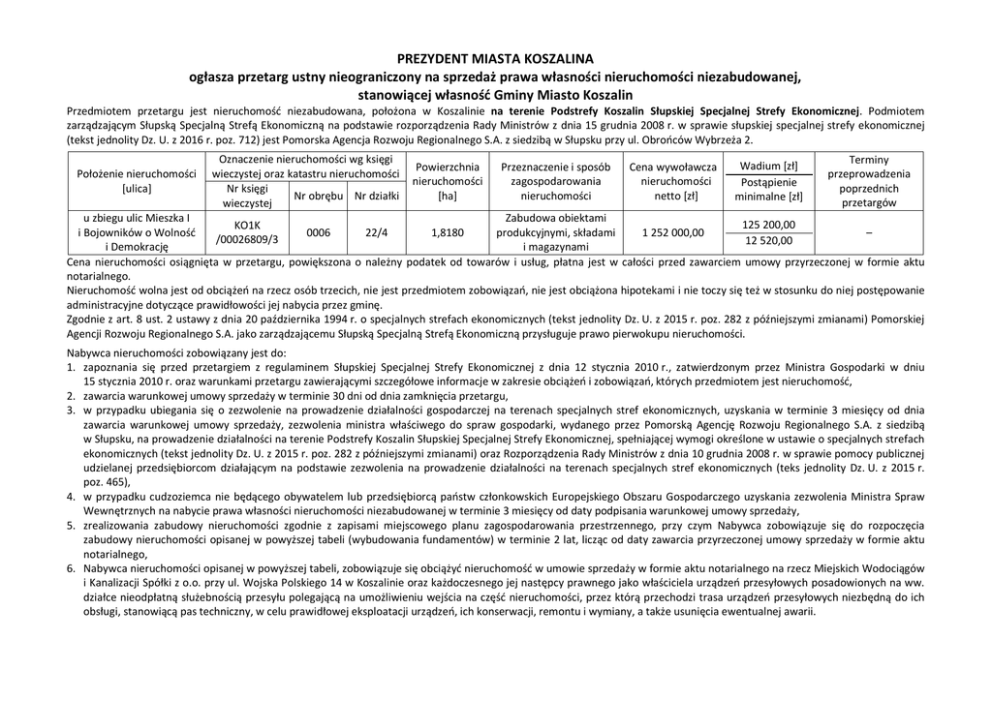 PREZYDENT MIASTA KOSZALINA ogłasza przetarg ustny nieograniczony na sprzedaż prawa własności nieruchomości niezabudowanej, stanowiącej własność Gminy Miasto Koszalin Przedmiotem przetargu jest nieruchomość niezabudowana, położona w Koszalinie na terenie Podstrefy Koszalin Słupskiej Specjalnej Strefy Ekonomicznej. Podmiotem zarządzającym Słupską Specjalną Strefą Ekonomiczną na podstawie rozporządzenia Rady Ministrów z dnia 15 grudnia 2008 r. w sprawie słupskiej specjalnej strefy ekonomicznej (tekst jednolity Dz. U. z 2016 r. poz. 712) jest Pomorska Agencja Rozwoju Regionalnego S.A. z siedzibą w Słupsku przy ul. Obrońców Wybrzeża 2. Położenie nieruchomości [ulica] Oznaczenie nieruchomości wg księgi wieczystej oraz katastru nieruchomości Nr księgi Nr obrębu Nr działki wieczystej Powierzchnia nieruchomości [ha] Przeznaczenie i sposób zagospodarowania nieruchomości Cena wywoławcza nieruchomości netto [zł] Wadium [zł] Postąpienie minimalne [zł] Terminy przeprowadzenia poprzednich przetargów u zbiegu ulic Mieszka I Zabudowa obiektami 125 200,00 KO1K i Bojowników o Wolność 0006 22/4 1,8180 produkcyjnymi, składami 1 252 000,00 – /00026809/3 12 520,00 i Demokrację i magazynami Cena nieruchomości osiągnięta w przetargu, powiększona o należny podatek od towarów i usług, płatna jest w całości przed zawarciem umowy przyrzeczonej w formie aktu notarialnego. Nieruchomość wolna jest od obciążeń na rzecz osób trzecich, nie jest przedmiotem zobowiązań, nie jest obciążona hipotekami i nie toczy się też w stosunku do niej postępowanie administracyjne dotyczące prawidłowości jej nabycia przez gminę. Zgodnie z art. 8 ust. 2 ustawy z dnia 20 października 1994 r. o specjalnych strefach ekonomicznych (tekst jednolity Dz. U. z 2015 r. poz. 282 z późniejszymi zmianami) Pomorskiej Agencji Rozwoju Regionalnego S.A. jako zarządzającemu Słupską Specjalną Strefą Ekonomiczną przysługuje prawo pierwokupu nieruchomości. Nabywca nieruchomości zobowiązany jest do: 1. zapoznania się przed przetargiem z regulaminem Słupskiej Specjalnej Strefy Ekonomicznej z dnia 12 stycznia 2010 r., zatwierdzonym przez Ministra Gospodarki w dniu 15 stycznia 2010 r. oraz warunkami przetargu zawierającymi szczegółowe informacje w zakresie obciążeń i zobowiązań, których przedmiotem jest nieruchomość, 2. zawarcia warunkowej umowy sprzedaży w terminie 30 dni od dnia zamknięcia przetargu, 3. w przypadku ubiegania się o zezwolenie na prowadzenie działalności gospodarczej na terenach specjalnych stref ekonomicznych, uzyskania w terminie 3 miesięcy od dnia zawarcia warunkowej umowy sprzedaży, zezwolenia ministra właściwego do spraw gospodarki, wydanego przez Pomorską Agencję Rozwoju Regionalnego S.A. z siedzibą w Słupsku, na prowadzenie działalności na terenie Podstrefy Koszalin Słupskiej Specjalnej Strefy Ekonomicznej, spełniającej wymogi określone w ustawie o specjalnych strefach ekonomicznych (tekst jednolity Dz. U. z 2015 r. poz. 282 z późniejszymi zmianami) oraz Rozporządzenia Rady Ministrów z dnia 10 grudnia 2008 r. w sprawie pomocy publicznej udzielanej przedsiębiorcom działającym na podstawie zezwolenia na prowadzenie działalności na terenach specjalnych stref ekonomicznych (teks jednolity Dz. U. z 2015 r. poz. 465), 4. w przypadku cudzoziemca nie będącego obywatelem lub przedsiębiorcą państw członkowskich Europejskiego Obszaru Gospodarczego uzyskania zezwolenia Ministra Spraw Wewnętrznych na nabycie prawa własności nieruchomości niezabudowanej w terminie 3 miesięcy od daty podpisania warunkowej umowy sprzedaży, 5. zrealizowania zabudowy nieruchomości zgodnie z zapisami miejscowego planu zagospodarowania przestrzennego, przy czym Nabywca zobowiązuje się do rozpoczęcia zabudowy nieruchomości opisanej w powyższej tabeli (wybudowania fundamentów) w terminie 2 lat, licząc od daty zawarcia przyrzeczonej umowy sprzedaży w formie aktu notarialnego, 6. Nabywca nieruchomości opisanej w powyższej tabeli, zobowiązuje się obciążyć nieruchomość w umowie sprzedaży w formie aktu notarialnego na rzecz Miejskich Wodociągów i Kanalizacji Spółki z o.o. przy ul. Wojska Polskiego 14 w Koszalinie oraz każdoczesnego jej następcy prawnego jako właściciela urządzeń przesyłowych posadowionych na ww. działce nieodpłatną służebnością przesyłu polegającą na umożliwieniu wejścia na część nieruchomości, przez którą przechodzi trasa urządzeń przesyłowych niezbędną do ich obsługi, stanowiącą pas techniczny, w celu prawidłowej eksploatacji urządzeń, ich konserwacji, remontu i wymiany, a także usunięcia ewentualnej awarii. Przetarg zostanie przeprowadzony w dniu 24 listopada 2016 r. o godz. 10:00, w siedzibie Urzędu Miejskiego w Koszalinie, Rynek Staromiejski 6-7, sala klubowa B (niski parter). Warunkiem przystąpienia do przetargu jest wniesienie wadium z zaznaczeniem położenia nieruchomości, najpóźniej do dnia 17 listopada 2016 r. włącznie, przelewem bankowym środków pieniężnych lub gotówką na rachunek bankowy Urzędu Miejskiego w Koszalinie mBank S.A. Oddział Korporacyjny w Koszalinie, ul. Okrzei 3: 41 1140 1137 0000 2444 4400 1003. Za datę wniesienia wadium uważa się datę wpływu środków pieniężnych na rachunek Urzędu Miejskiego w Koszalinie. Wadium osoby wygrywającej przetarg zalicza się na poczet ceny nabycia nieruchomości. Pozostałym uczestnikom przetargu wadium zostanie zwrócone po przetargu, nie później niż przed upływem 3 dni od dnia zamknięcia przetargu. Wadium ulega przepadkowi na rzecz Miasta, jeżeli osoba ustalona jako Nabywca nieruchomości nie przystąpi bez usprawiedliwienia do zawarcia umów w formie aktu notarialnego w miejscu i terminie podanych w zawiadomieniu. Warunkiem udziału w przetargu jest wniesienie wadium w wysokości i terminie wyznaczonych w ogłoszeniu o przetargu oraz okazanie komisji przetargowej przed o