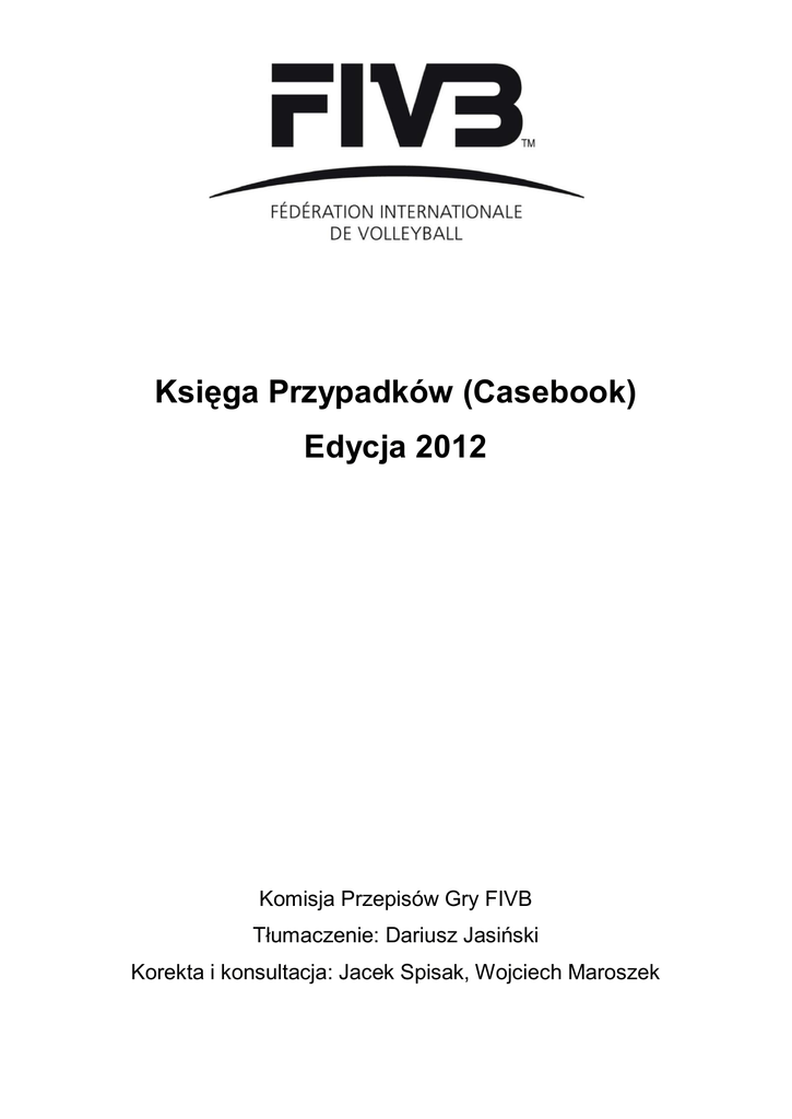 Księga Przypadków (Casebook) Edycja 2012 Komisja Przepisów Gry FIVB Tłumaczenie: Dariusz Jasiński Korekta i konsultacja: Jacek Spisak, Wojciech Maroszek Spis treści Słowo wstępne ......................................................................................................................................................... 3 Część I: Teoretyczne podstawy stosowania Przepisów Gry ................................................................................ 3 Część II: Przypadki .................................................................................................................................................. 5 ROZDZIAŁ 1: UCZESTNICY GRY ..................................................................................................................................... 5 ROZDZIAŁ 2: STRUKTURA GRY ...................................................................................................................................... 7 ROZDZIAŁ 3: PRZEBIEG GRY .......................................................................................................................................... 9 ROZDZIAŁ 4: PRZERWY I OPÓŹNIENIA ....................................................................................................................... 17 ROZDZIAŁ 5: ZAWODNIK LIBERO ................................................................................................................................. 24 ROZDZIAŁ 6: NIEWŁAŚCIWE ZACHOWANIE ............................................................................................................... 31 ROZDZIAŁ 7: SĘDZIOWIE I ICH UPRAWNIENIA .......................................................................................................... 33 ROZDZIAŁ 8: SZCZEGÓLNE PRZYPADKI..................................................................................................................... 36 Aneks ...................................................................................................................................................................... 39 2 Słowo wstępne Piłka siatkowa to wspaniała gra – wystarczy zapytań miliony ludzi, którzy w nią grają, ją oglądają, analizują I sędziują. Przez ostatnie lata intensywnie promowana i rozwijana, stała się jednym z najpopularniejszych sportów. Zwiększenie prędkości gry, więcej emocji i dynamicznych akcji, dobry wizerunek sportu i świetne wyniki oglądalności w telewizji stanowią bodziec do dalszego rozwijania siatkówki i trafiania z nią do coraz to nowych odbiorców. Powyższe stwierdzenia są podstawą dla dokonywanych zmian w Przepisach Gry. Równie ważne jak sam ich tekst jest zdolność do prawidłowego i jednolitego stosowania Przepisów Gry na całym świecie. Księga Przypadków – Casebook jest zbiorem sytuacji, jakie miały miejsce na meczach piłki siatkowej, opatrzonych oficjalną interpretacją zatwierdzoną przez Komisję Przepisów Gry FIVB i opartą o najnowszą edycję Przepisów Gry. Te interpretacje wyjaśniają znaczenie poszczególnych przepisów i ich ducha, oraz stanowią obowiązkową linię postępowania na zawodach FIVB. Poprzez Casebook najtrudniejsze w ocenie sytuacje meczowe zostały opisane i służą unifikacji sposobu postępowania na zawodach. Mamy więc nadzieję, że także najnowsza edycja Księgi Przypadków będzie cennym narzędziem dla zawodników, trenerów i szczególnie dla sędziów, aby każdy znał rozstrzygnięcie dla opisanych sytuacji, niezależnie od osoby sędziego, czy poziomu rozgrywek. Obecne wydanie Księgi Przypadków zostało opracowane przez Klausa Fezera na podstawie wcześniejszego dzieła Yoshiharu Nishiwaki, wykorzystującego pierwotny układ dokumentu, stworzony przez dra Jima Colemana. Szczególne podziękowania kierujemy do pozostałych członków Komisji Przepisów Gry FIVB oraz Prezydenta Komisji Sędziowskiej FIVB Gavriela Krausa wraz z innymi kolegami z jego Komisji, Aktualna edycja Księgi Przypadków opiera się na Przepisach Gry zatwierdzonych przez Kongres FIVB w 2012 roku. Sandy Steel Prezydent Komisji Przepisów Gry FIVB Część I: Teoretyczne podstawy stosowania Przepisów Gry Sędzia jest tą osobą, który wprowadza przepisy gry w Życie. Aby właściwie zastosować przepisy sędziowie muszą doskonale znać przepisy i stosować je w sposób odpowiedni i stanowczy. Lecz najważniejszą rzeczą jest znać podstawowe zasady formułowania przepisów. Jeśli tego zabraknie, nigdy właściwie nie zrozumieją przepisów, a co za tym idzie będą mieli duże trudności dobrze je stosować. Nawet gdy sytuacja, która nastąpi nie jest ściśle określona w przepisach, sędzia jest w stanie podjąć prawidłowe decyzje. Przepis 23.2.3 stwierdza, Że sędzia jest upoważniony do decydowania w każdej sytuacji dotyczącej gry włączając te, które nie są zapisane w przepisach Może się tak stać tylko na podstawie pełnego poznania fundamentalnych zasad zastosowania przepisów. W celu prawidłowej interpretacji przepisów, sędziowie muszą mieć kompletną wiedzę o następujących funkcjach oraz teoretycznych założeniach zastosowania przepisów: 1/ Funkcja przepisów Naturalnie, jeśli chce się właściwie stosować przepisy, trzeba znać jakie są ich funkcje. Generalnie Przepisy jako całość spełniają następujące zadania: A/ Charakterystyka gry Przepisy nadają specyfikę siatkówce i odróżniają ją od innych sportów. a/ przepisy określają właściwe warunki oraz wyposażenie używane podczas gry, powierzchnię boiska , jego rozmiary oraz dane dotyczące siatki, piłki itp. b/ przepisy regulują ilość uczestników, zawodników biorących udział w grze, ich pozycje, kolejność rotacji itp. c/ przepisy ustanawiają metody gry, jak utrzymać piłkę w grze, przestrzeń przejścia oraz jak zdobyć punkt, wygrać set i mecz B/ Określenie właściwej techniki Wiele przepisów daje jasną definicję i wyra