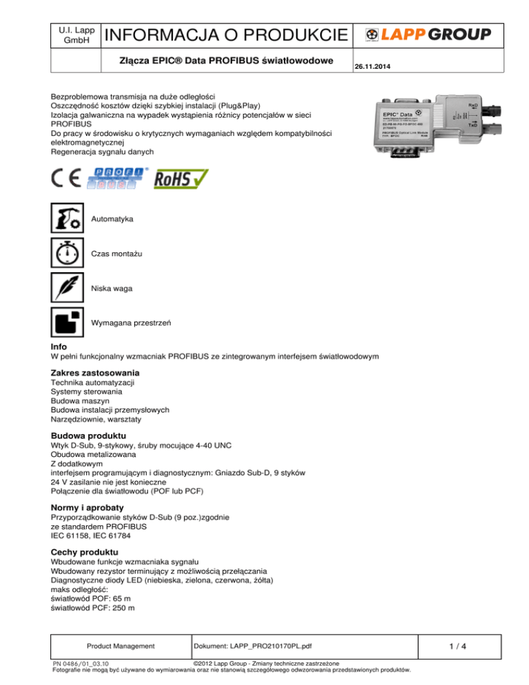 U.I. Lapp GmbH INFORMACJA O PRODUKCIE Złącza EPIC® Data PROFIBUS światłowodowe 26.11.2014 Bezproblemowa transmisja na duże odległości Oszczędność kosztów dzięki szybkiej instalacji (Plug&Play) Izolacja galwaniczna na wypadek wystąpienia różnicy potencjałów w sieci PROFIBUS Do pracy w środowisku o krytycznych wymaganiach względem kompatybilności elektromagnetycznej Regeneracja sygnału danych Automatyka Czas montażu Niska waga Wymagana przestrzeń Info W pełni funkcjonalny wzmacniak PROFIBUS ze zintegrowanym interfejsem światłowodowym Zakres zastosowania Technika automatyzacji Systemy sterowania Budowa maszyn Budowa instalacji przemysłowych Narzędziownie, warsztaty Budowa produktu Wtyk D-Sub, 9-stykowy, śruby mocujące 4-40 UNC Obudowa metalizowana Z dodatkowym interfejsem programującym i diagnostycznym: Gniazdo Sub-D, 9 styków 24 V zasilanie nie jest konieczne Połączenie dla światłowodu (POF lub PCF) Normy i aprobaty Przyporządkowanie styków D-Sub (9 poz.) zgodnie ze standardem PROFIBUS IEC 61158, IEC 61784 Cechy produktu Wbudowane funkcje wzmacniaka sygnału Wbudowany rezystor terminujący z możliwością przełączania Diagnostyczne diody LED (niebieska, zielona, czerwona, żółta) maks odległość: światłowód POF: 65 m światłowód PCF: 250 m Product Management Dokument: LAPP_PRO210170PL.pdf ©2012 Lapp Group - Zmiany techniczne zastrzeżone PN 0486/01_03.10 Fotografie nie mogą być używane do wymiarowania oraz nie stanowią szczegółowego odwzorowania przedstawionych produktów. 1/4 U.I. Lapp GmbH INFORMACJA O PRODUKCIE Złącza EPIC® Data PROFIBUS światłowodowe 26.11.2014 Wskazówka PG = interfejs programujący (= 2. D-Sub) Właściwe złącza światłowodowe (POF) w komplecie Fotografie nie mogą być używane do wymiarowania oraz nie stanowią szczegółowego odwzorowania przedstawionych produktów. Szczegółowe informacje można znaleźć w specyfikacji technicznej lub procedurach instalacji (www.lappautomation.com). Uwaga: Dla pojedynczego łącza światłowodowego wymagane są 2 moduły. Dane techniczne Wymiary: 60 mm x 40 mm x 17 mm (długość x szerokość x wysokość) Rezystor terminujący: Rezystor zintegrowany, podłączany przy pomocy przełącznika suwakowego Waga: Około 40 g Odprowadzenie kabla: 90° Interfejsy: Połączenie: Gniazdo D-Sub, 9 styków Przewód FO: - Światłowód polimerowy (POF), 650 nm - Światłowód szklano-polimerowy (PCF), 650 nm właściwe typy złączy: SMA, BFOC(ST) i HFBR Stopień ochrony: IP 20 Pobór prądu: około 100mA Prędkość transmisji: Maks. 12 Mbit/s Stopień zanieczyszczenia: 2 Napięcie zasilające: +5,0 V DC (zasilanie z zacisku) Dopuszczalne warunki otoczenia: Temperatura robocza: od 0°C do +60°C Temperatura podczas transportu i magazynowania: od -25°C do +75°C Product Management Dokument: LAPP_PRO210170PL.pdf ©2012 Lapp Group - Zmiany techniczne zastrzeżone PN 0486/01_03.10 Fotografie nie mogą być używane do wymiarowania oraz nie stanowią szczegółowego odwzorowania przedstawionych produktów. 2/4 Powered by TCPDF (www.tcpdf.org) Odprowadzenie kabla Diagnostyczne diody LED Liczba sztuk w opakowaniu 21700568 ED-PB-90-PG-FO-HFBR-650 90° tak tak 1 tak tak 1 tak tak 1 Moduł światłowodowy dla złącz EPIC® Data PROFIBUS — złącze SMA 21700569 ED-PB-90-PG-FO-SMA-650 90° 21700570 ED-PB-90-PG-FOBFOC-650 90° Dokument: LAPP_PRO210170PL.pdf Złącza EPIC® Data PROFIBUS światłowodowe Moduł światłowodowy dla złącz EPIC® Data PROFIBUS — złącze BFOC(ST) INFORMACJA O PRODUKCIE PG U.I. Lapp GmbH Oznaczenie wyrobu Moduł światłowodowy dla złącz EPIC® Data PROFIBUS — złącze HFBR Product Management 26.11.2014 ©2012 Lapp Group - Zmiany techniczne zastrzeżone PN 0486/01_03.10 Fotografie nie mogą być używane do wymiarowania oraz nie stanowią szczegółowego odwzorowania przedstawionych produktów. Numer artykułu 3/4 Powered by TCPDF (www.tcpdf.org) U.I. Lapp GmbH INFORMACJA O PRODUKCIE Złącza EPIC® Data PROFIBUS światłowodowe Product Management 26.11.2014 Dokument: LAPP_PRO210170PL.pdf ©2012 Lapp Group - Zmiany techniczne zastrzeżone PN 0486/01_03.10 Fotografie nie mogą być używane do wymiarowania oraz nie stanowią szczegółowego odwzorowania przedstawionych produktów. 4/4