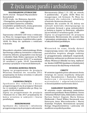 Z życia naszej parafii i archidiecezji KALENDARIUMLITURGICZNE 20.09,wtorek-SwiętychMęczennikó w Koreań skich 21.09,ś roda-ś w.Mateusza,Apostoła iEwangelisty,patronaksięgowych, pracownikó wkantoró w,celnikó w, urzędnikó wpodatkowych,straż ygranicznej 23.09,piątek-ś w.PiozPietralciny LSO Zapraszamyczłonkó wLSOwrazzrodzicami na Mszę ś w. inaugurującą rok formacji LSO wIczwartekmiesiąca,6paź dziernikaogodz. 18.00. Po Mszy ś w. spotkanie z rodzicami wkoś ciele. JKS Wszystkichczłonkó wJadwiż ań skiegoKlubu Sportowego:piłkarzy,tenisistó wzrodzicami, treneró w,kibicó w,sympatykó worazZarząd, i członkó w Rady Klubu zapraszam na Mszę ś w.inaugurującąsezon2016/17wniedzielę, 25 wrześ nia o godz. 10.45. Zawodnikó w prosimyoprzybycie wbarwachklubowych. WCZESNAKOMUNIAŚWIĘTA Zapisy na przygotowanie do przyjęcia Wczesnej Komunii ś w. rocznika 2011 przyjmujemydokoń cawrześ niawzakrystii ibiurzepara ialnym. IKOMUNIAŚWIĘTA S p o t k a n i e d l a r o d z i c ó w i d z i e c i przygotowującychsiędoprzyjęciaIKomunii ś w. w niedzielę 2 paź dziernika po Mszy ś w. ogodz.10.45wkoś ciele. Zapisy na przygotowanie do przyjęcia IKomuniiś w.wroku2017przyjmujemydo koń ca wrześ nia w zakrystii i biurze para ialnym. BIERZMOWANIE Spotkanie dla rodzicó w i młodzież y przygotowującejsiędoprzyjęciasakramentu Bierzmowania (klasy I, II i III) we wtorek, 4 paź dziernika. O godz. 18.00. Msza ś w. inaugurująca rok formacji. Po Mszy ś w. s p o t ka n i e d l a ro d z i c ó w i m ł o d z i e ż y wkoś ciele.Koniecznaobecnoś ć. Spotkanie dla ucznió w kl. III, któ rzy nie zaliczyli materiału obowiązującego na II poziomie formacji z grup animatorskich p.Justyny,p.Joannyip.Katarzynyodbędzie sięwewtorek27wrześ niaogodz.19.00 Zapisy na przygotowanie do przyjęcia Sakramentu Bierzmowania dla ucznió w klas I gimnazjum przyjmujemy do koń ca wrześ nia wzakrystiiibiurzepara ialnym. CARITAS W r z e s i e ń t o c z a s , k i e d y d z i e c i rozpoczynają nowy rok szkolny. Caritas para ialna wspiera ubogie rodziny w przygotowaniu szkolnych wyprawek. Będziemywdzięcznizazłoż onenatencel o iary.Moż najeskładać natacę,wpłacać nakontoCARITAS(podanewbiuletynie) orazwrzucać doskarbonywkoś ciele. CHRZTY Wostatnimtygodniuprzezsakramentchrztu ś więtego do naszej wspó lnoty dołączyli Oskar Barankiewicz i Radosław Ranke. R o d z i c o m i c h r z e s t n y m ż y c z y m y w y t r w a ł o ś c i i o d p o w i e d z i a l n o ś c i wchrześ cijań skimwychowaniudzieci. SAKRAMENTMAŁŻEŃSTWA W ostatnim czasie sakrament małż eń stwa zawarlinasipara ianie:RomaE|lż bietaSurma iSebastianMichałCejba;AleksandraLisieckai Bartosz Robert Stępień ; Marta Helena Płotkowiak i Paweł Wiktor Kaczmarek oraz Katarzyna Anna Wieczorkowska i Maciej Stanisłąw Przybyła. Nowoż eń com ż yczymy Boż ego błogosławień stwa i polecamy ich modlitwiewszystkichpara ian.