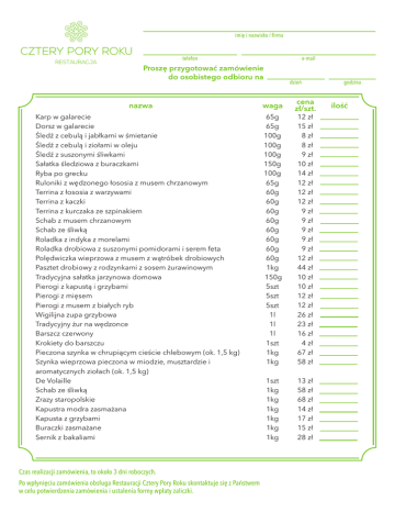 imię i nazwisko / firma telefon e-mail Proszę przygotować zamówienie do osobistego odbioru na nazwa Karp w galarecie Dorsz w galarecie Śledź z cebulą i jabłkami w śmietanie Śledź z cebulą i ziołami w oleju Śledź z suszonymi śliwkami Sałatka śledziowa z buraczkami Ryba po grecku Ruloniki z wędzonego łososia z musem chrzanowym Terrina z łososia z warzywami Terrina z kaczki Terrina z kurczaka ze szpinakiem Schab z musem chrzanowym Schab ze śliwką Roladka z indyka z morelami Roladka drobiowa z suszonymi pomidorami i serem feta Polędwiczka wieprzowa z musem z wątróbek drobiowych Pasztet drobiowy z rodzynkami z sosem żurawinowym Tradycyjna sałatka jarzynowa domowa Pierogi z kapustą i grzybami Pierogi z mięsem Pierogi z musem z białych ryb Wigilijna zupa grzybowa Tradycyjny żur na wędzonce Barszcz czerwony Krokiety do barszczu Pieczona szynka w chrupiącym cieście chlebowym (ok. 1,5 kg) Szynka wieprzowa pieczona w miodzie, musztardzie i aromatycznych ziołach (ok. 1,5 kg) De Volaille Schab ze śliwką Zrazy staropolskie Kapustra modra zasmażana Kapusta z grzybami Buraczki zasmażane Sernik z bakaliami Czas realizacji zamówienia, to około 3 dni roboczych. Po wpłynięciu zamówienia obsługa Restauracji Cztery Pory Roku skontaktuje się z Państwem w celu potwierdzenia zamówienia i ustalenia formy wpłaty zaliczki. dzień waga 65g 65g 100g 100g 100g 150g 100g 65g 60g 60g 60g 60g 60g 60g 60g 60g 1kg 150g 5szt 5szt 5szt 1l 1l 1l 1szt 1kg 1kg 1szt 1kg 1kg 1kg 1kg 1kg 1kg cena zł/szt. 12 zł 15 zł 8 zł 8 zł 9 zł 10 zł 14 zł 12 zł 12 zł 12 zł 9 zł 9 zł 9 zł 9 zł 9 zł 12 zł 44 zł 10 zł 10 zł 12 zł 12 zł 26 zł 23 zł 16 zł 4 zł 67 zł 58 zł 13 zł 58 zł 68 zł 14 zł 17 zł 15 zł 28 zł godzina ilość