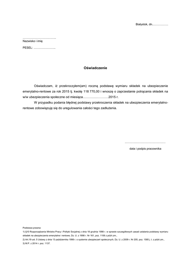 Białystok, dn.……………. …………………………….. Nazwisko i imię PESEL: ………………….. Oświadczenie Oświadczam, iż przekroczyłem(am) roczną podstawę wymiaru składek na ubezpieczenie emerytalno-rentowe za rok 2015 tj. kwotę 118 770,00 i wnoszę o zaprzestanie potrącania składek na w/w ubezpieczenia społeczne od miesiąca……………………2015 r. W przypadku podania błędnej podstawy przekroczenia składek na ubezpieczenia emerytalnorentowe zobowiązuję się do uregulowania całości tego zadłużenia. ..………..………………………… data i podpis pracownika Podstawa prawna: 1) §10 Rozporządzenia Ministra Pracy i Polityki Socjalnej z dnia 18 grudnia 1998 r. w sprawie szczegółowych zasad ustalania podstawy wymiaru składek na ubezpieczenia emerytalne i rentowe, Dz. U. z 1998 r. Nr 161, poz. 1106 z późń.zm., 2) Art.19 ust. 5 Ustawy z dnia 13 października 1998 r. o systemie ubezpieczeń społecznych, Dz. U. z 2009 r. Nr 205, poz. 1585 j. t. z późń.zm., 3) M.P. z 2014 r. poz. 1137.