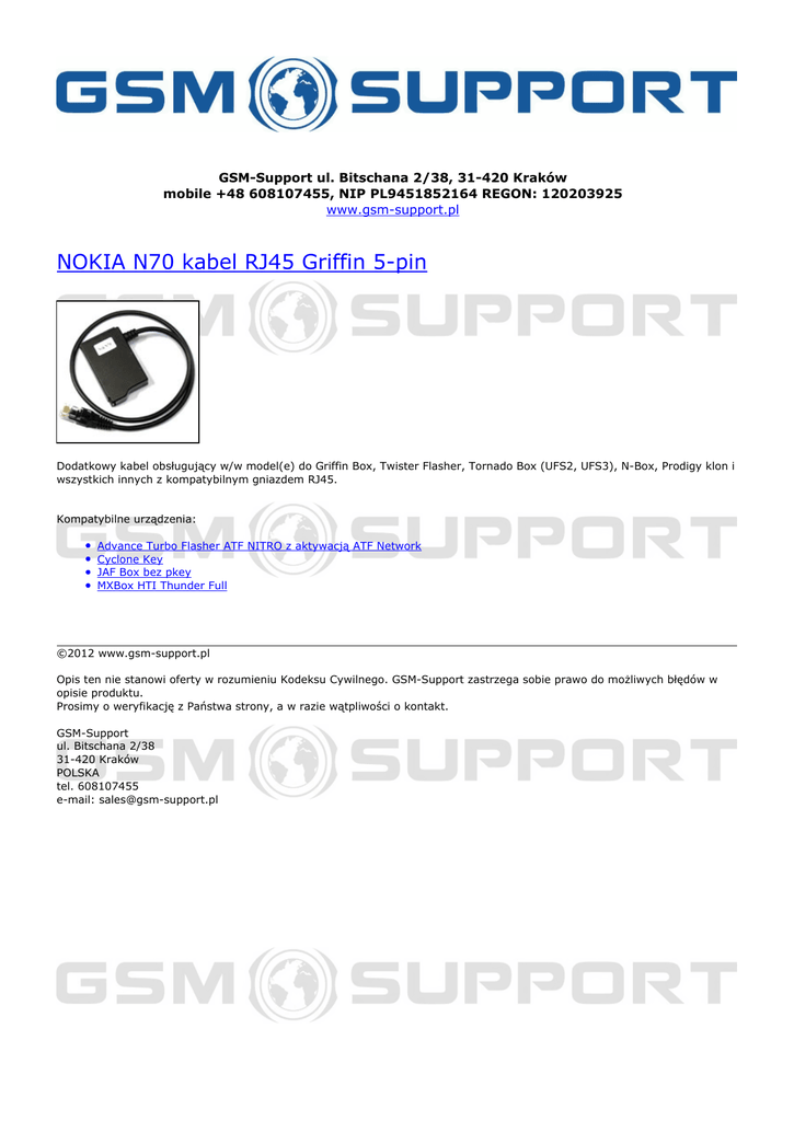 GSM-Support ul. Bitschana 2/38, 31-420 Kraków mobile +48 608107455, NIP PL9451852164 REGON: 120203925 www.gsm-support.pl NOKIA N70 kabel RJ45 Griffin 5-pin Dodatkowy kabel obsługujący w/w model(e) do Griffin Box, Twister Flasher, Tornado Box (UFS2, UFS3), N-Box, Prodigy klon i wszystkich innych z kompatybilnym gniazdem RJ45. Kompatybilne urządzenia: Advance Turbo Flasher ATF NITRO z aktywacją ATF Network Cyclone Key JAF Box bez pkey MXBox HTI Thunder Full ©2012 www.gsm-support.pl Opis ten nie stanowi oferty w rozumieniu Kodeksu Cywilnego. GSM-Support zastrzega sobie prawo do możliwych błędów w opisie produktu. Prosimy o weryfikację z Państwa strony, a w razie wątpliwości o kontakt. GSM-Support ul. Bitschana 2/38 31-420 Kraków POLSKA tel. 608107455 e-mail: [email protected] Powered by TCPDF (www.tcpdf.org)