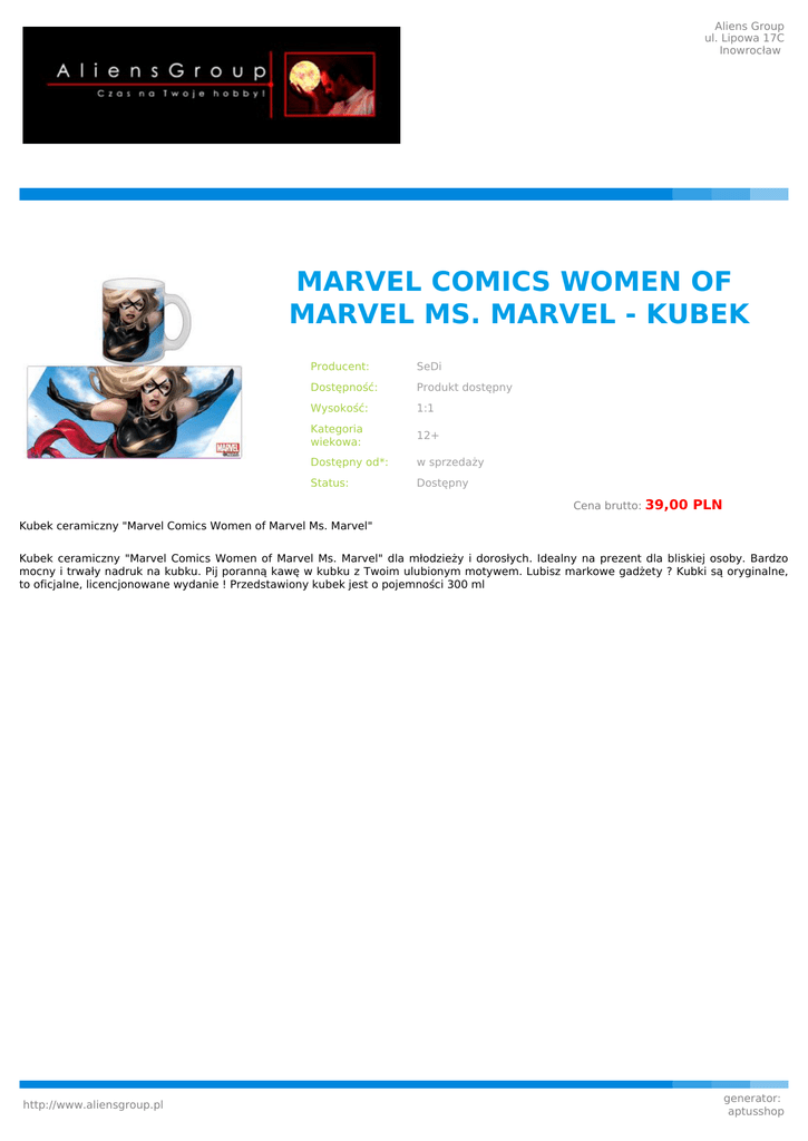 Aliens Group ul. Lipowa 17C Inowrocław MARVEL COMICS WOMEN OF MARVEL MS. MARVEL - KUBEK Producent: SeDi Dostępność: Produkt dostępny Wysokość: 1:1 Kategoria wiekowa: 12+ Dostępny od*: w sprzedaży Status: Dostępny Cena brutto: 39,00 PLN Kubek ceramiczny "Marvel Comics Women of Marvel Ms. Marvel" Kubek ceramiczny "Marvel Comics Women of Marvel Ms. Marvel" dla młodzieży i dorosłych. Idealny na prezent dla bliskiej osoby. Bardzo mocny i trwały nadruk na kubku. Pij poranną kawę w kubku z Twoim ulubionym motywem. Lubisz markowe gadżety ? Kubki są oryginalne, to oficjalne, licencjonowane wydanie ! Przedstawiony kubek jest o pojemności 300 ml http://www.aliensgroup.pl generator: aptusshop