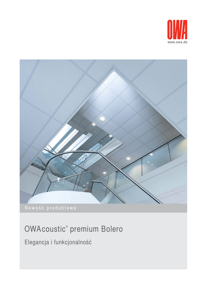 www.owa.de Nowość produktowa ® OWA coustic premium Bolero Elegancja i funkcjonalność Elegancja i funkcjonalność ® OWA coustic premium Bolero Pod delikatną w swojej strukturze fakturą kryje się siła nowej generacji produktów: OWAcoustic ® premium Bolero – elegancja, doskonała akustyka i ochrona ogniowa www.owa.de Moc w nowej odsłonie Niewiele płyt sufitowych, charakteryzujących się wysoką absorpcją dźwięku, skrywa swoją moc za tak finezyjną zewnętrzną powłoką. OWAcoustic ® premium Bolero łączy w sobie optycznie gładką, posiadającą jednak drobną fakturę o charakterze tynku szlachetnego, powierzchnię z doskonałymi wartościami absorpcji dźwięku = 0,85. Życie, praca, komfort Nowoczesne, komfortowe biura, “przyjazne“ sale szkolne, miejsca spotkań – z OWAcoustic ® premium Bolero stworzycie Państwo, pasujący do tych pomieszczeń, system sufitowy. Płyty te nadają się nie tylko do wymagających akustycznie pomieszczeń w biurowcach czy szkołach, świetnie sprawdzają się również w korytarzach, recepcjach czy holach. OWAconsult® poleca ® OWAcoustic premium Bolero: Perła projektów akustycznych Rynek oczekuje skutecznego produktu w “rozsądnej“ cenie, łączącego jednocześnie doskonałe walory estetyczne. Wychodząc naprzeciw tym wymaganiom stworzyliśmy nową płytę sufitową z wełny mineralnej OWAcoustic ® premium Bolero – płyta z warstwą flizeliny, o gładkiej optyce i dobrych parametrach odbicia światła. OWAcoustic ® premium Bolero – Dane techniczne Materiał płyta z wełny mineralnej wykończona welonem szklanym Klasa materiału budowlanego A2-s1,d0 wg EN 13501-1 Grubość ok. 15 mm Kolor biały Odbicie światła ok. 84 (ISO 7724-2, ISO 7724-3) Absorpcja dźwięku α w = 0,85 / NRC = 0,85 Odporność na wilgoć do 95 % RH Odporność ogniowa* do F 90 (DIN 4102) do REI 90 (EN 13501-2) *zależnie od systemu, stropu i innych elementów OWAline wymiary rastra wymiary w mm S3 S 15 S 15b 600 x 600 625 x 625 • • • 600 x 1200 625 x 1250 • • Odenwald Faserplattenwerk GmbH OWA Polska Sp. z o.o. Dr.- F.- A.- Freundt -Straße 3 ul. Prusimska 7 63916 Amorbach 60-427 Poznań Tel. + 49 9373 2 01- 0 Tel. +48 61 8 49 86 40 Fax + 49 9373 2 01- 1 30 Fax +48 61 8 49 86 45 www.owa.de · E- Mail: info@ owa.de www.owa.com.pl · E-Mail: [email protected] Druk nr 942 PL 041101 Systemy z konstrukcją widoczną Systemy