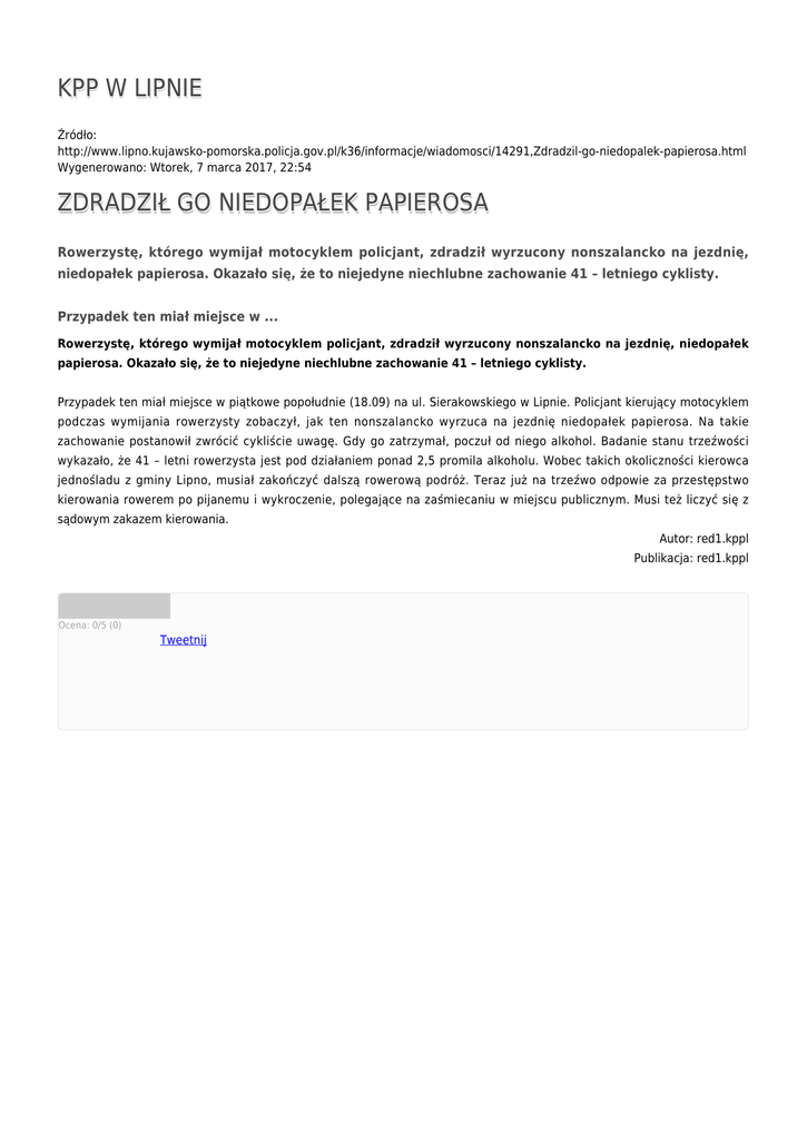 KPP W LIPNIE Źródło: http://www.lipno.kujawsko-pomorska.policja.gov.pl/k36/informacje/wiadomosci/14291,Zdradzil-go-niedopalek-papierosa.html Wygenerowano: Wtorek, 7 marca 2017, 22:54 ZDRADZIŁ GO NIEDOPAŁEK PAPIEROSA Rowerzystę, którego wymijał motocyklem policjant, zdradził wyrzucony nonszalancko na jezdnię, niedopałek papierosa. Okazało się, że to niejedyne niechlubne zachowanie 41 – letniego cyklisty. Przypadek ten miał miejsce w ... Rowerzystę, którego wymijał motocyklem policjant, zdradził wyrzucony nonszalancko na jezdnię, niedopałek papierosa. Okazało się, że to niejedyne niechlubne zachowanie 41 – letniego cyklisty. Przypadek ten miał miejsce w piątkowe popołudnie (18.09) na ul. Sierakowskiego w Lipnie. Policjant kierujący motocyklem podczas wymijania rowerzysty zobaczył, jak ten nonszalancko wyrzuca na jezdnię niedopałek papierosa. Na takie zachowanie postanowił zwrócić cykliście uwagę. Gdy go zatrzymał, poczuł od niego alkohol. Badanie stanu trzeźwości wykazało, że 41 – letni rowerzysta jest pod działaniem ponad 2,5 promila alkoholu. Wobec takich okoliczności kierowca jednośladu z gminy Lipno, musiał zakończyć dalszą rowerową podróż. Teraz już na trzeźwo odpowie za przestępstwo kierowania rowerem po pijanemu i wykroczenie, polegające na zaśmiecaniu w miejscu publicznym. Musi też liczyć się z sądowym zakazem kierowania. Autor: red1.kppl Publikacja: red1.kppl Ocena: 0/5 (0) Tweetnij