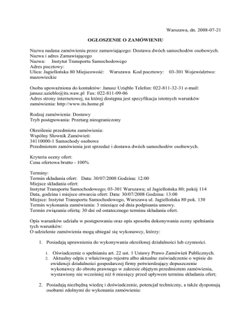 Warszawa, dn. 2008-07-21 OGŁOSZENIE O ZAMÓWIENIU Nazwa nadana zamówieniu przez zamawiającego: Dostawa dwóch samochodów osobowych. Nazwa i adres Zamawiającego Nazwa: Instytut Transportu Samochodowego Adres pocztowy: Ulica: Jagiellońska 80 Miejscowość: Warszawa Kod pocztowy: 03-301 Województwo: mazowieckie Osoba upoważniona do kontaktów: Janusz Uziębło Telefon: 022-811-32-31 e-mail: [email protected] Fax: 022-811-09-06 Adres strony internetowej, na której dostępna jest specyfikacja istotnych warunków zamówienia: http://www.its.home.pl Rodzaj zamówienia: Dostawy Tryb postępowania: Przetarg nieograniczony Określenie przedmiotu zamówienia: Wspólny Słownik Zamówień: 34110000-1 Samochody osobowe Przedmiotem zamówienia jest sprzedaż i dostawa dwóch samochodów osobowych. Kryteria oceny ofert: Cena ofertowa brutto - 100% Terminy: Termin składania ofert: Data: 30/07/2008 Godzina: 12:00 Miejsce składania ofert: Instytut Transportu Samochodowego; 03-301 Warszawa; ul Jagiellońska 80; pokój 114 Data, godzina i miejsce otwarcia ofert: Data: 30/07/2008 Godzina: 13:00 Miejsce: Instytut Transportu Samochodowego, Warszawa ul. Jagiellońska 80 pok. 130 Termin wykonania zamówienia: 3 miesiące od dnia podpisania umowy. Termin związania ofertą: 30 dni od ostatecznego terminu składania ofert. Opis warunków udziału w postępowaniu oraz opis sposobu dokonywania oceny spełniania tych warunków: O udzielenie zamówienia mogą ubiegać się wykonawcy, którzy: 1. Posiadają uprawnienia do wykonywania określonej działalności lub czynności. 1. Oświadczenie o spełnianiu art. 22 ust. 1 Ustawy Prawo Zamówień Publicznych. 2. Aktualny odpis z właściwego rejestru albo aktualne zaświadczenie o wpisie do ewidencji działalności gospodarczej firmy potwierdzający dopuszczenie wykonawcy do obrotu prawnego w zakresie objętym przedmiotem zamówienia, wystawiony nie wcześniej niż 6 miesięcy przed upływem terminu składania ofert; 2. Posiadają niezbędną wiedzę i doświadczenie, potencjał techniczny, a także dysponują osobami zdolnymi do wykonania zamówienia: W zakresie warunku wskazanego w powyższym punkcie wymagane jest posiadanie niezbędnej wiedzy i doświadczenia w zakresie sprzedaży, dostaw i serwisu samochodów osobowych. Ocena spełnienia warunku nastąpi na podstawie przedstawionych przez Wykonawcę niżej wymienionych dokumentów i oświadczeń. 1. Oświadczenie o spełnianiu art. 22 ust. 1 ustawy prawo zamówień publicznych. 2. Wykaz punktów serwisowych i adres kontaktowy pomocy technicznej w przypadku awarii - minimum 5 punktów serwisowych 3. Znajdują się w sytuacji ekonomicznej i finansowej zapewniającej wykonanie zamówienia: W zakresie niniejszego warunku wymagane jest posiadanie środków finansowych na realizację zamówienia. Ocena spełnienia warunków szczegółowych nastąpi na podstawie przedstawionych przez Wykonawcę poniższych dokumentów. 1. Oświadczenie o spełnianiu art. 22 ust. 1 Ustawy Prawo Zamówień Publicznych. Informacja o możliwości złożenia oferty wariantowej: Oferta nie może przewidywać odmiennego niż określony w Specyfikacji Istotnych Warunków Zamówienia sposobu wykonania zamówienia, zamawiający nie będzie rozpatrywać ofert wariantowych. Opis części zamówienia, jeżeli zamawiający dopuszcza składanie ofert częściowych: Zamówienie nie zostało podzielone części. Informacja na temat wadium: Wadium nie jest wymagane. Warunki uzyskania dokumentów zamówienia: Dostępne w postaci papierowej w siedzibie zamawiającego do dnia Data: 2008/07/30 Cena 10.00zł Warunki i sposób płatności: Płatność przy odbiorze wersji papierowej. Ogłoszenie z dnia 2008/07/21