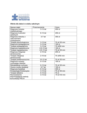 Oferta dla dzieci w wieku szkolnym Nazwa zajęć Diagnoza rozwoju intelektualnego Diagnoza trudności szkolnych Diagnoza dziecka z zaburzeniami rozwojowymi Terapia psychologiczna Diagnoza pedagogiczna Terapia pedagogiczna Diagnoza logopedyczna Terapia logopedyczna Diagnoza integracji sensorycznej Terapia integracji sensorycznej Terapia polisensoryczna Diagnoza rozwoju ruchowego dziecka Rehabilitacja ruchowa Ocena ryzyka dysleksji Diagnoza dysleksji Kinezjologia Edukacyjna Terapia taktylna Wprowadzenie wspomagającej metody komunikacji PECS Przeznaczenie 3-13 lat Cena 200 zł 6-13 lat 250 zł 3-7 lat 350 zł 3-13 lat 3-13 lat 3-13 lat 2,5-13 lat 2,5-13 lat 2-10 lat 70 zł/ 50 min 100 zł 70 zł/50 min 100 zł 70 zł/ 50 min 250 zł 2-10 lat 70 zł/50 min 10-13 lat 0-13 lat 70 zł/ 50 min 100 zł 0-13 lat 6-7 lat 9-12 lat 3-13 lat 5-13 lat 3-13 lat 70 zł/ 50 min 100 zł 300 zł 70 zł/ 50 min 70 zł 70 zł/ 50 min