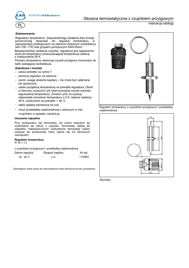 G³owica termostatyczna z czujnikiem przylgowym Instrukcja obs³ugi PL Zastosowanie: Regulatory temperatury bezpośredniego dzia³ania (bez energii pomocniczej) stosowaæ do regulacji temperatury w ogrzewaniach pod³ogowych na zaworze wlotowym rozdzielaczy serii 73E i 77E oraz grupach pompowych KAN-therm. Bezpieczeñstwo dzia³ania czujnika regulatora jest zagwarantowane do temperatury przewy¿szaj¹cej temperaturê zadan¹ o maksymalnie 30 K. Pomiaru temperatury dokonuje czujnik przylgowy mocowany do belki zasilaj¹cej rozdzielacza. Zabudowa i monta¿: – ustaw pokrêt³o na cyfrze 7. – zamocuj regulator na zaworze. – zwróæ uwagê u³o¿enie kapilary – nie mo¿e byæ za³amana lub zgnieciona – ustaw po¿¹dan¹ temperaturê na pokrêtle regulatora. Obrót w kierunku wy¿szych cyfr skali powoduje wzrost wartości regulowanej temperatury. Zmiana cyfry na wy¿sz¹ odpowiada wzrostowi temperatury o 5 K. (zakres nastawy: 30 K, oznaczenie na pokrêtle: 1 do 7) – za³ó¿ opaskê zaciskow¹ na rurê – wsuñ przek³adkê ciep³owodow¹ z u³o¿onym w niej czujnikiem w opaskê i zaciśnij j¹ Regulator temperatury z czujnikiem przylgowym i przek³adk¹ ciep³owodow¹ 28 Usuwanie odpadów Regulator temperatury M 30 x 1,5 156 112 Przy pozbywaniu siê termostatu nie wolno dopuściæ do wydostania siê cieczy z czujnika. Termostaty nale¿¹ do odpadów niebezpiecznych! Uszkodzone termostaty nale¿y zwracaæ do producenta, który zajmie siê ich fachowym usuniêciem. Zakres regulacji D³ugośæ kapilary Nr kat. 30 - 60 °C 2m 1142862 Ø 54.5 z czujnikiem przylgowym i przek³adk¹ ciep³owodow¹ Zastrzegamy sobie prawo do wprowadzania zmian technicznych bez uprzedzenia 83.7 Wymiary Temperaturregler mit Anlegefühler Einbauanleitung D Anwendungsbereich: Temperaturregler arbeiten ohne Hilfsenergie und ermöglichen die Temperaturregelung von Fußbodenheizungen. Für Montage auf dem Vorlauf-Ventil der Verteiler Serie 73E, 77E oder Pumpengruppe Fa. KAN-therm. Die Übertemperatursicherheit des Fühlerelementes beträgt 30 K über dem Einstellwert. Die Temperaturerfassung erfolgt über einen Anlegefühler, mnontiert auf dem Vorlaufbalken des Verteilers. Einbau und Montage: – Das Handrad auf Ziffer 7 einstellen. – Temperaturregler auf das Ventil schrauben. – Es ist darauf zu achten, dass das Kapillarrohr nicht geknickt oder flachgedrückt wird. – Temperaturregler auf gewünschte Temperatur einstellen. Bei Drehung in Richtung größerer Zahlenwerte ergeben sich höhere Einstellwerte. Die Änderung beträgt 5 K von Ziffer zu Ziffer. (Verstellbereich: 30 K, Kennzeichnung des Handrades: 1 bis 7) – Schlauchschelle lose um das Rohr legen. Temperaturregler mit Anlegefühler – Wärmeleitsockel gemeinsam mit Fühler in die Schelle schieben und befestigen. 28 112 B ei der Entsorgung des Thermostaten darf dieser nicht zerstört werden, um ein Austreten der Flüssigkeit aus dem Fühler zu ver hindern. Der Thermostat unterliegt der Sondermüllbehandlung! Ausgebaute/defekte Thermostate werden vom Hersteller zurückgenommen und fachgerecht entsorgt. 156 Entsorgung: Regelbereich Kapillarrohrlänge Art.-Nr. 30 - 60 C 2m 1142862 Ø 54.5 Temperaturregler: M 30 x1,5 mit Anlegefühler und Wärmeleitsockel 83.7 Technische Änderungen vorbehalten. Maße Temperature controller with contact sensor Installation Instructions GB Application: Temperature controllers work without auxiliary power and allow temperature control for underfloor heating. To be applied on the supply valves series 73E, 77E and pump stations KAN-therm. Operational reliability up to 30 K above set value. The temperature is sensed either through a contact sensor on a flow distributor. Installation and assembly: – Turn handwheel to position 7. – Screw temperature controller direct on valve body. – Please ensure that the capillary is not bent or pressed flat. – Set temperature controller to desired temperature. When turning the handwheel to higher positions, higher temperatures are obtained. The change is 5 K from position to position. (Total change of 30 K, marking of the handwheel: 1 to 7). – Position bracket around the pipe. – Place heat transfer unit together with sensor in bracket and fasten. Temperatur controller with contact sensor Disposal: Capillary length 2m Item no. 1142862 Ø 54.5 Control range 30 1 - 60 °C 112 Temperature controller M 30 x 1.5 with contact sensor, and heat transfer unit 156 28 To protect the sensor liqiud from escaping, the thermostat must not be destroyed when disposed of. The thermostat contains hazardous waste! Dismounted/defective thermostats can be returned to the manufacturer. They will be disposed of professionally. Subject to technical modification without notice. 83.7 Dimensions