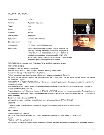Propozycja pielgrzymki 7 dniowej na ekspozycje CAŁUNU w TURYNIE (wariant bez nocnych przejazdów) Termin pielgrzymki