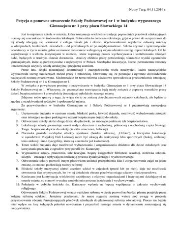 Nowy Targ, 04.11.2016 r. Petycja o ponowne utworzenie Szkoły Podstawowej nr 1 w budynku wygaszanego Gimnazjum nr 1 przy placu Słowackiego 14 Jest to najstarsza szkoła w mieście, która kontynuuje wieloletnie tradycje poprzednich placówek edukacyjnych i cieszy się szacunkiem w środowisku lokalnym. Potwierdza to coroczna rekrutacja, gdyż o prawo do uczęszczania do tej szkoły ubiegają się uczniowie z całego miasta jak i okolic. Wychowankowie regularnie odnoszą sukcesy w olimpiadach, konkursach, zawodach – od powiatowych aż po międzynarodowe. Szkoła czynnie i systematycznie uczestniczy w życiu miasta, gdzie uczniowie nieustannie wzbogacają swym udziałem szereg imprez lokalnych. Od lat współpracuje z wieloma instytucjami w mieście, które wspierają proces wychowywania i kształtowania młodych ludzi, będących w trudnym okresie dorastania. Analizy efektów pracy potwierdzają rokrocznie wyniki egzaminów gimnazjalnych, które są porównywalne z najlepszymi w Polsce. Niezbędne inwestycje, liczne, permanentne remonty i modernizacje uczyniły szkołę atrakcyjną i przyjazną uczniom. Przez lata, dzięki nieustającej determinacji i zaangażowaniu wielu nauczycieli, kadra nauczycielska wypracowała szereg skutecznych metod pracy z młodzieżą. Obawiamy się, że potencjał i ogromne doświadczenie nauczycieli zostaną zmarnowane. Siedemnaście lat temu reforma oświatowa spowodowała przekształcenie istniejącej Szkoły Podstawowej nr 1 w Gimnazjum nr 1. W związku z powyższym prosimy o przywrócenie w budynku Gimnazjum nr 1 przy placu Słowackiego 14 Szkoły Podstawowej nr 1. Wierzymy, że przemyślane rozwiązania będą miały związek z poprawą warunków pracy dzieci, bezpieczeństwem i przyszłością dorastającej młodzieży naszego miasta. Zdajemy sobie sprawę z tego, że wiąże się to ze zmianą dotychczasowych rejonów szkolnych, ale będzie to zgodne z oczekiwaniami rodziców i społeczności miasta. Za przywróceniem w budynku Gimnazjum nr 1 Szkoły Podstawowej nr 1 przemawiają następujące argumenty: 1. Usytuowanie budynku w centrum miasta, bliskość parku, łatwość dojazdu, możliwość wybudowania zatoczki oraz istniejące miejsca parkingowe uczyni bezpiecznym dojazd do szkoły. 2. Odtworzenie szkoły skróci drogę dzieci do placówki, co znacząco podniesie ich bezpieczeństwo. 3. Lokalizacja szkoły gwarantuje nawet małym dzieciom z zachodniej, północnej i wschodniej części Nowego Targu bezpieczne dojście do szkoły (ścieżka rowerowa, bulwary). 4. Placówka posiada niezbędne obiekty sportowe (boisko, siłownię, „Orlika”), a korzystna lokalizacja w sąsiedztwie Miejskiej Hali Lodowej może być okazją do reaktywacji klas sportowych (hokej, unihokej, tenis stołowy i inne dyscypliny, które są u uczniów już kształcone). 5. Teren wokół budynku daje możliwość wybudowania i zorganizowania obiektów dla dzieci młodszych oraz korzystania przez nie z ogrodów przy parafii św. Katarzyny. 6. Wyposażenie szkoły, pracownie, sale lekcyjne, bogaty księgozbiór biblioteki szkolnej, stołówka szkolna, sklepik – znacząco wpływają na realizację procesu dydaktycznego i wychowawczego. 7. Odtworzenie szkoły pozwoli innym placówkom uniknąć przepełnienia klas i zorganizowania zajęć na jedną zmianę, co mocno podkreślają twórcy reformy. 8. Bliskość szkoły muzycznej ułatwi uczniom udział w zajęciach (przed lub po nich), daje też możliwość utworzenia klas artystycznych, bo i w tej dziedzinie obecna placówka osiąga sukcesy międzynarodowe. 9. Konieczna jest kontynuacja wieloletniej współpracy z różnymi organizacjami i instytucjami działającymi na terenie miasta, co stanowi wyraźne uzupełnienie procesu kształcenia i wychowywania. 10. Położenie w pobliżu kościoła św. Katarzyny wpłynie na lepszą współpracę w zakresie wychowania religijnego. Odtworzenie Szkoły Podstawowej wraz z wejściem reformy w życie pozwoli na bardzo płynne przejście przez kolejną reformę edukacji. Jesteśmy przekonani, że nasze sugestie zostaną wzięte pod uwagę w procesie przystosowania obecnie funkcjonujących placówek szkolnych do planowanej reformy oświatowej. Proces ten będzie miał wpływ na losy kolejnych pokoleń nowotarżan i przyszłość naszego miasta w dynamicznie zmieniającej się rzeczywistości. Petycja o ponowne utworzenie Szkoły Podstawowej nr 1 w budynku wygaszanego Gimnazjum nr 1 przy placu Słowackiego 14. Nr Imię i Nazwisko Adres PESEL