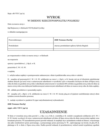 Sygn. akt VII C 34/15 WYROK W IMIENIU RZECZYPOSPOLITEJ POLSKIEJ Dnia 19 marca 2015 r. Sąd Rejonowy w Kielcach VII Wydział Cywilny w składzie następującym: Przewodniczący: SSR Tomasz Durlej Protokolant: starszy protokolant sądowy Sylwia Stępień po rozpoznaniu w dniu 12 marca 2015 r. w Kielcach na rozprawie sprawy z powództwa (...) Sp.k. w K. przeciwko C. W. i O. W. o zapłatę I. uchyla nakaz zapłaty w postepowaniu nakazowym z dnia 6 października 2014 roku w całości; II. zasądza od pozwanych C. W. i O. W. solidarnie na rzecz (...) Sp.k. w K. kwotę 257,32 zł (dwieście pięćdziesiąt siedem złotych 32/100) wraz z ustawowymi odsetkami w wysokości 13% w stosunku rocznym od dnia 18 lipca 2014 roku do dnia 22 grudnia 2014 roku i odsetkami ustawowymi w wysokości 8% od dnia 23 grudnia 2014 roku do dnia 19 marca 2015 roku oraz dalszymi każdoczesnymi ustawowymi odsetkami od dnia 20 marca 2015 roku do dnia zapłaty; III. oddala powództwo w pozostałej części; IV. zasądza od (...)Sp.k. w K. solidarnie na rzecz C. W. i O. W. kwotę 564,00 zł (pięćset sześćdziesiąt cztery) złote tytułem zwrotu kosztów procesu; V. nadaje wyrokowi w punkcie II rygor natychmiastowej wykonalności. SSR Tomasz Durlej sygn. akt: VII C 34/15 UZASADNIENIE W dniu 17 września 2014 roku powód (...) Sp. z o.o. S.K.A. z siedzibą w K. wniósł o zasądzenie solidarnie od C. W. i O. W. kwoty 14.165,57 zł wraz z ustawowymi odsetkami od dnia 18 lipca 2014 roku do dnia rzeczywistej zapłaty oraz kosztami procesu. W uzasadnieniu pozwu powód wskazał, iż znajduje się w posiadaniu weksla in blanco, wręczonego mu jako remitentowi przez pozwanego, a poręczonego przez pozwaną O. W., opiewającego na kwotę 16.462,78 zł, płatnego w K. w dniu 17 lipca 2014 roku. Nadto powód wskazał, iż przedmiotowy weksel został wypełniony zgodnie z umową o oraz zgodnie z deklaracją wekslową, podkreślając przy tym, że do zapłaty z w/w weksla pozostała kwota 14.165,57 zł – w tym kwota 13.908,25 zł tytułem kary umownej naliczonej na podstawie § 6 pkt 5 umowy o kolportaż prasy zawartej z pozwanym C. W. oraz kwota 257,32 zł – tytułem niezapłaconych faktur (k. 2-3). Nakazem zapłaty wydanym w postępowaniu nakazowym w dniu 6 października 2014 roku w sprawie o sygn. VII Nc 1141/14 Sąd Rejonowy w Kielcach nakazał, aby pozwani: C. W. i O. W. zapłacili solidarnie na rzecz (...) S.K.A. w K. kwotę 14.165,57- zł wraz z ustawowymi odsetkami w wysokości 13,00% w stosunku rocznym od dnia 18 lipca 2014 roku do dnia 6 października 2014 roku i dalszymi ustawowymi odsetkami od dnia 7 października 2014 roku do dnia zapłaty oraz kwotę 2.588,00- zł tytułem zwrotu kosztów procesu, w tym kwotę 2.400,00- zł tytułem zwrotu kosztów zastępstwa procesowego, w terminie dwóch tygodni od doręczenia niniejszego nakazu, albo wnieśli w tym terminie zarzuty (k. 35). Od powyższego nakazu zapłaty pozwani wnieśli zarzuty, zaskarżając powyższy nakaz zapłaty w całości i podnosząc, że C. W. nie wiedział o tym, iż zawarta z powodową spółka umowa o kolportaż prasy przewidywała karę umowną. Pozwani podkreślili przy tym, że w/w umowa została podpisana przez C. W. w pośpiechu w dniu 11 grudnia 2013 roku, kiedy to pozwany zupełnie nie spodziewał się, że pracownik powodowej spółki przyjedzie z w/w umowami. Nadto pozwani podnieśli, że C. W. miał około dwudziestu minut, aby zapoznać się z treścią umowy i podjąć decyzję o współpracy z powodową spółką, przy czym w przypadku, gdyby nie zdecydował się na współpracę z powódką, nie otrzymałby prasy i pozostałby bez pracy. Ponadto pozwani podnieśli, że pierwsza umowa przedstawiona C. W. do podpisu nie zawierała postanowienia o karze umownej, dlatego też C. W. – podpisując umowę o kolportaż prasy na drugi punkt prasowy - był przekonany, że kolejna przedstawiona mu do podpisu umowa o kolportaż prasy zawiera taką samą treść co umowa, przedstawiona mu do podpisu w pierwszej kolejności (k. 419-430). Na rozprawie w dniu 12 marca 2015 roku pozwani wnosili o oddalenie powództwa, wywodząc jak w zarzutach od nakazu zapłaty (k. 506). Sąd ustalił następujący stan faktyczny sprawy; Pozwany C. W. prowadzi działalność gospodarczą polegającą na sprzedaży prasy, artykułów chemicznych, książek i wyrobów tytoniowych w dwóch punktach sprzedaży w Z. – w jednym przy ul. (...) oraz w drugim punkcie sprzedaży przy ul. (...). Do dnia 7 grudnia 2012 roku C. W. odbierał prasę od spółki (...) Spółki z ograniczoną odpowiedzialnością S.K.A. z siedzibą we W.. Z uwagi jednak na to, że spółka ta z dniem 7 grudnia 2012 roku zaprzestała prowadzenia działalności gospodarczej, z pozwanym skontaktował się przedstawiciel spółki (...) S.K.A. z siedzibą w K., który poinformował C. W., że jeżeli chce dalej otrzymywać prasę dostarczaną mu dotychczas przez spółkę (...) Sp. z o.o. S.K.A. z/s we W., musi podpisać nową umowę o kolportaż prasy ze spółką (...) z uwagi na zawarte pomiędzy tymi spółkami porozumienie. W dniu 7 grudnia 2012 roku przedstawiciel spółki (...) Sp. z o.o. z/s w K. przybył w godzinach wieczornych do prowadzonego przez C. W. punktu sprzedaży prasy i przedstawił pozwanemu w/w porozumienie, z którego wynikało, że z dniem 8 grudnia 2012 roku w prawa i obowiązki (...) Sp. z o.o. S.K.A. we W., wynikające z umowy zawartej przez (...) Sp. z o.o. S.K.A. z siedzibą we W. z C. W., wstępuje (...)S.K.A. z siedzibą w K. (§1 ust. ust. 6 porozumienia). W tym samym dniu C. W. musiał też podjąć decyzję, czy decyduje się na podjęcie współpracy ze spółką (...) Sp. z o.o. w K.. Dowód: zeznania O. W. (k. 506-507), zeznania C. W. (k. 508), porozumienie z dnia 7 grudnia 2012 roku zawarte pomiędzy (...) Sp. z o.o. z/s w K. a (...) Sp. z o.o. S.K.A. z/s we W. a C. W. (k. 432) Pozwany C. W. wyraził zgodę na współpracę ze spółką (...) Sp. z o.o. z/s w K., 