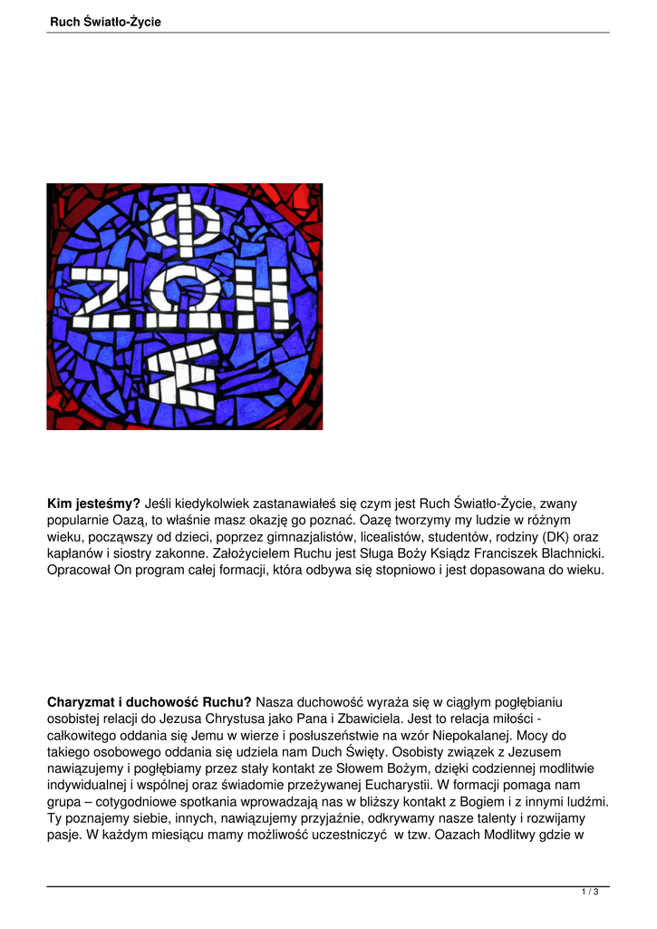 Ruch Światło-Życie Kim jesteśmy? Jeśli kiedykolwiek zastanawiałeś się czym jest Ruch Światło-Życie, zwany popularnie Oazą, to właśnie masz okazję go poznać. Oazę tworzymy my ludzie w różnym wieku, począwszy od dzieci, poprzez gimnazjalistów, licealistów, studentów, rodziny (DK) oraz kapłanów i siostry zakonne. Założycielem Ruchu jest Sługa Boży Ksiądz Franciszek Blachnicki. Opracował On program całej formacji, która odbywa się stopniowo i jest dopasowana do wieku. Charyzmat i duchowość Ruchu? Nasza duchowość wyraża się w ciągłym pogłębianiu osobistej relacji do Jezusa Chrystusa jako Pana i Zbawiciela. Jest to relacja miłości całkowitego oddania się Jemu w wierze i posłuszeństwie na wzór Niepokalanej. Mocy do takiego osobowego oddania się udziela nam Duch Święty. Osobisty związek z Jezusem nawiązujemy i pogłębiamy przez stały kontakt ze Słowem Bożym, dzięki codziennej modlitwie indywidualnej i wspólnej oraz świadomie przeżywanej Eucharystii. W formacji pomaga nam grupa – cotygodniowe spotkania wprowadzają nas w bliższy kontakt z Bogiem i z innymi ludźmi. Ty poznajemy siebie, innych, nawiązujemy przyjaźnie, odkrywamy nasze talenty i rozwijamy pasje. W każdym miesiącu mamy możliwość uczestniczyć w tzw. Oazach Modlitwy gdzie w 1/3 Ruch Światło-Życie klimacie modlitwy i wspólnoty doświadczamy radości bycia razem, szukamy odpowiedzi na pytania związane z czasem młodości, dorastania i pogłębiamy naszą wiarę. Czym są oazy wakacyjne? Ks. Franciszek Blachnicki organizował spotkania ministrantów, z których powstały oazy wakacyjne. Są to 15-dniowe rekolekcje przeżyciowe zmierzające do uformowania dojrzałych chrześcijan przez wzajemną służbę, modlitwę, zabawę oraz doświadczenie wspólnoty. Domowy Kościół (DK)To gałąź Ruchu Światło-Życie zrzeszająca małżeństwa i rodziny. Łączy on w sobie charyzmat Ruchu Światło-Życie i międzynarodowego ruchu małżeństw katolickich Equipes Notre Dame (END). Na powstanie i kształt Domowego Kościoła miała ogromny wpływ siostra Jadwiga Skudro ZNSJ, która pomagała Ks. Franciszkowi Blachnickiemu od początku tworzenia się tego Ruchu. Duchowość DK Domowy Kościół chce pomóc małżonkom w budowaniu prawdziwej jedności małżeńskiej, która jednocześnie stwarza najlepsze warunki do dobrego wychowania dzieci w duchu chrześcijańskim. Dokonuje się to poprzez dobrowolne dary – zobowiązania. Są to min modlitwa małżeńska jako wspólne stawanie przed Bogiem, modlitwa rodzinna, dialog małżeński i wynikająca z niego reguła życia (praca nad sobą) oraz udział w rekolekcjach formacyjnych. Więcej informacji znajdziesz na stronach: www.radom.oaza.pl i www.radom.oaza.pl/dk 2/3 Ruch Światło-Życie Nasz adres: ul. Malczewskiego 1 26-600 Radom e-mail: [email protected] 3/3