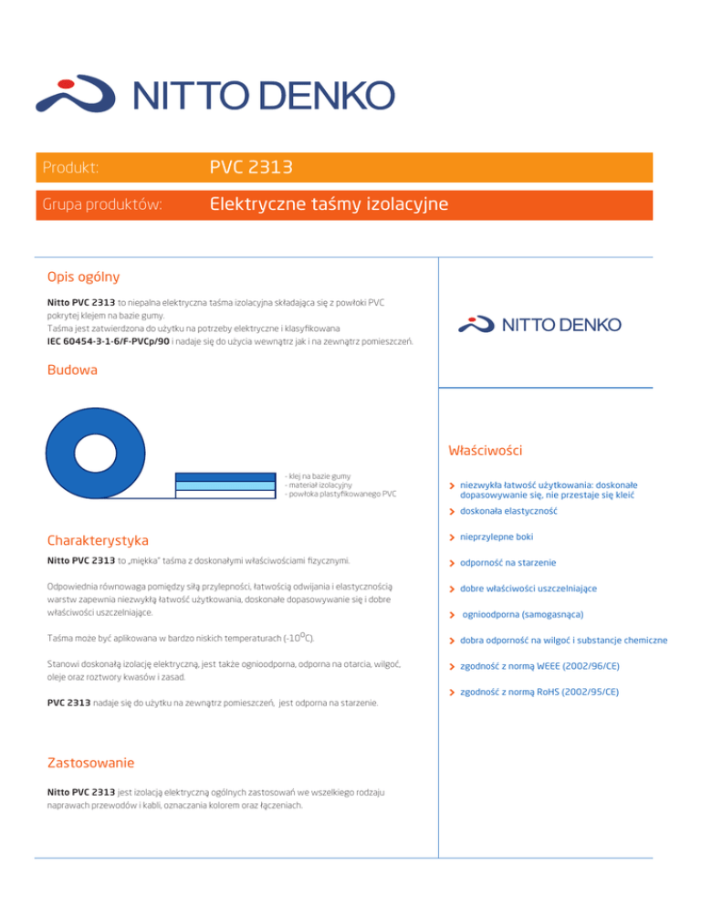 Produkt: PVC 2313 Grupa produktów: Elektryczne taśmy izolacyjne Opis ogólny Nitto PVC 2313 to niepalna elektryczna taśma izolacyjna składająca się z powłoki PVC pokrytej klejem na bazie gumy. Taśma jest zatwierdzona do użytku na potrzeby elektryczne i klasyfikowana IEC 60454-3-1-6/F-PVCp/90 i nadaje się do użycia wewnątrz jak i na zewnątrz pomieszczeń. Budowa Właściwości - klej na bazie gumy - materiał izolacyjny - powłoka plastyfikowanego PVC niezwykła łatwość użytkowania: doskonałe dopasowywanie się, nie przestaje się kleić doskonała elastyczność Charakterystyka nieprzylepne boki Nitto PVC 2313 to „miękka” taśma z doskonałymi właściwościami fizycznymi. odporność na starzenie Odpowiednia równowaga pomiędzy siłą przylepności, łatwością odwijania i elastycznością warstw zapewnia niezwykłą łatwość użytkowania, doskonałe dopasowywanie się i dobre właściwości uszczelniające. dobre właściwości uszczelniające Taśma może być aplikowana w bardzo niskich temperaturach (-10oC). Stanowi doskonałą izolację elektryczną, jest także ognioodporna, odporna na otarcia, wilgoć, oleje oraz roztwory kwasów i zasad. ognioodporna (samogasnąca) dobra odporność na wilgoć i substancje chemiczne zgodność z normą WEEE (2002/96/CE) zgodność z normą RoHS (2002/95/CE) PVC 2313 nadaje się do użytku na zewnątrz pomieszczeń, jest odporna na starzenie. Zastosowanie Nitto PVC 2313 jest izolacją elektryczną ogólnych zastosowań we wszelkiego rodzaju naprawach przewodów i kabli, oznaczania kolorem oraz łączeniach. Taśmy izolacyjne PVC 2313 Właściwości Wartość typowa Metoda testowania Grubość całkowita 0.13 mm IEC 60454-2 §4 Wytrzymałość na rozciąganie KD* 215 N/10 mm² (odcinek) IEC 60454-2 §8 28 N/10 mm szerokości Rozciągalność KD* 215 % Przylepność do stali ciągnionej beznalotowo 2.60 N/10 mm§ IEC 60454-2 §8 IEC 60454-2 §11 (czas klejenia 15 min.) Przylepność do podłoża w temperaturze pokojowej 2.50 N/10 mm IEC 60454-2 §11 w niskich temperaturach (-10oC) 3.40 N/10 mm IEC 60454-2 §12 w temperaturze pokojowej 8.0 kV IEC 60454-2 §17 w środowisku wilgotnym 8.0 kV IEC 60454-2 §18 Wytrzymałość elektryczna 11 Ohm/25mm Korozja elektrolityczna (23 °C, 40 °C i 55 °C) 1x10 Właściwości w niskich temperaturach (-10oC) brak pęknięć szerokości IEC 60454-2 §7.6 (IEC 60167) IEC 60454-2 §9 nie rozwija się, nie rozpada się Przedziurawienie przy podwyższonej temperaturze 70 °C IEC 60454-2 §10 Odporność na odrywanie od podłoża po zanurzeniu w wodzie 30 N IEC 60454-2 §13 Ognioodporność samogasnąca IEC 60454-2 §19 Maksymalna temperatura użytkowania +90 °C IEC 60454-2 §21 *KD = kierunek długości Gwarancja Gwarantuje się, że produkt w momencie dostarczenia jest wolny od defektów jeśli chodzi o użyte materiały i wykonanie i nadaje się do użycia przez okres następnych 12 miesięcy, będąc użytkowany w wyżej określonych warunkach. Dostępność Kolory: przeźroczysty, czarny, niebieski, zielony, szary, czerwony, żółty, żółto-zielony, biały, brązowy Szerokość: 12, 15, 19, 25, 30, 38 i 50 mm Długość: 10 i 30 m Średnica szpulki: 31.5 mm * Prosimy o kontakt w sprawie innych wymiarów i/lub kolorów Wskazówki odnośnie użycia Taśma powinna być aplikowana na czystą i suchą powierzchnię. Nakładaj taśmę z umiarkowaną siłą i 50% zakładką. Ogólne warunki użycia i ostrzeżenia: Na właściwości produktu mogą negatywnie wpływać takie czynniki jak struktura, stan i powierzchnia podłoża lub zanieczyszczanie znajdujące się w lub na nim, temperatura i wilgotność podczas przechowywania, warunki panujące podczas i po użyciu oraz długość użytkowania na zewnątrz pomieszczeń. Jeśli produkt jest używany razem z innym materiałem lub technologią, użytkownik powinien upewnić się co do zgodności tego produktu w takich zestawieniach i o to, czy takie zestawienie nie wpłynie negatywnie na oczekiwane działanie produktu. Ta sama zasada obowiązuje w przypadku, gdy podczas aplikacji lub po niej na produkt oddziaływają warunki ekstremalne, włączając w to długą ekspozycję na promienie słoneczne, ekstremalne temperatury czy natężenia.