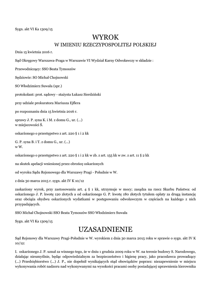 Sygn. akt VI Ka 1309/15 WYROK W IMIENIU RZECZYPOSPOLITEJ POLSKIEJ Dnia 15 kwietnia 2016 r. Sąd Okręgowy Warszawa-Praga w Warszawie VI Wydział Karny Odwoławczy w składzie : Przewodniczący: SSO Beata Tymoszów Sędziowie: SO Michał Chojnowski SO Włodzimierz Suwała (spr.) protokolant: prot. sądowy - stażysta Łukasz Sierdziński przy udziale prokuratora Mariusza Ejflera po rozpoznaniu dnia 15 kwietnia 2016 r. sprawy J. P. syna K. i M. z domu G., ur. (...) w miejscowości Ś. oskarżonego o przestępstwo z art. 220 § 1 i 2 kk G. P. syna B. i T. z domu G., ur. (...) w W. oskarżonego o przestępstwo z art. 220 § 1 i 2 kk w zb. z art. 155 kk w zw. z art. 11 § 2 kk na skutek apelacji wniesionej przez obrońcę oskarżonych od wyroku Sądu Rejonowego dla Warszawy Pragi - Południe w W. z dnia 30 marca 2015 r. sygn. akt IV K 10/12 zaskarżony wyrok, przy zastosowaniu art. 4 § 1 kk, utrzymuje w mocy; zasądza na rzecz Skarbu Państwa: od oskarżonego J. P. kwotę 120 złotych a od oskarżonego G. P. kwotę 180 złotych tytułem opłaty za drugą instancję oraz obciąża obydwu oskarżonych wydatkami w postępowaniu odwoławczym w częściach na każdego z nich przypadających. SSO Michał Chojnowski SSO Beata Tymoszów SSO Włodzimierz Suwała Sygn. akt VI Ka 1309/15 UZASADNIENIE Sąd Rejonowy dla Warszawy Pragi-Południe w W. wyrokiem z dnia 30 marca 2015 roku w sprawie o sygn. akt IV K 10/12: I. oskarżonego J. P. uznał za winnego tego, że w dniu 1 grudnia 2009 roku w W. na terenie budowy S. Narodowego, działając nieumyślnie, będąc odpowiedzialnym za bezpieczeństwo i higienę pracy, jako pracodawca prowadzący (...) Przedsiębiorstwo (...) J. P., nie dopełnił wynikających stąd obowiązków poprzez: niezapewnienie w miejscu wykonywania robót nadzoru nad wykonywanymi na wysokości pracami osoby posiadającej uprawnienia kierownika robót lub mistrza budowlanego, dopuszczenie do sytuacji, w której osoba nieposiadająca uprawnień kierownika robót lub mistrza budowalnego mogła kierować wyżej opisywanymi robotami na wysokości, niezapewnienie osoby ciężarowego przy wykonywaniu prac z udziałem żurawia wieżowego, a także nieprzeszkolenie pracowników wykonujących prace na wysokości w zakresie tych prac, w szczególności w zakresie współpracy z operatorem żurawia wieżowego, czym nieumyślnie naraził pracowników J. M. i Z. K. na bezpośrednie niebezpieczeństwo utraty życia lub ciężkiego uszczerbku na zdrowiu, czyn ten zakwalifikował jako występek z art. 220 § 1 i 2 k.k. i za ten czyn wymierzył oskarżonemu karę 6 miesięcy pozbawienia wolności, której wykonanie warunkowo zawiesił na okres 2 lat próby; II. oskarżonego G. P. uznał za winnego tego, że w dniu 1 grudnia 2009 roku w W. na terenie budowy S. Narodowego, działając nieumyślnie, będąc odpowiedzialnym za bezpieczeństwo i higienę pracy z racji wykonywanych faktycznie czynności jako osoba kierująca pracownikami z ramienia pracodawcy (...) Przedsiębiorstwa (...) J. P., podejmując się nadzoru nad pracownikami wykonującymi prace na wysokościach montażu oświetlenia przy pomocy żurawia wieżowego i kosza transportowego (...), nie dopełnił wynikającego stąd obowiązku i nie zapewnił w miejscu wykonywania robót współpracy ciężarowego – osoby uprawnionej i posiadającej kwalifikacje do podczepiania kosza transportowego i współpracy z żurawiem wieżowym, powierzając zadania ciężarowego osobie nieposiadającej kwalifikacji w tym zakresie, tj. J. M. doprowadzając do niewłaściwego podwieszenia kosza transportowego do zawiesia żurawia wieżowego i jego wypięcia się z zawiesia podczas pracy na wysokości oraz upadku na ziemię, czym nieumyślnie spowodował śmierć pracowników J. M. i Z. K. wskutek odniesionych przez nich w następstwie upadku z wysokości masywnych urazów wielonarządowych, czyn ten zakwalifikował jako występek z art. 220 § 1 i 2 k.k. w zb. z art. 155 k.k. w zw. z art. 11 § 2 k.k. i za czyn ten na podstawie art. 155 k.k. wymierzył mu karę roku pozbawienia wolności, której wykonanie warunkowo zawiesił na okres 2 lat próby; III. na podstawie at. 46 § 1 k.k. orzekł wobec oskarżonych obowiązek naprawienia wyrządzonej szkody poprzez zapłatę na rzecz J. i H. M. kwoty 5000 złotych przez każdego z oskarżonych tytułem zadośćuczynienia za doznaną krzywdę. Powyższy wyrok apelacją zaskarżył obrońca obu oskarżonych zarzucając w niej szereg naruszeń przepisów prawa procesowego mających istotny wpływ na treść orzeczenia, jak również błędy w ustaleniach faktycznych. W konsekwencji wniósł o zmianę wyroku poprzez uniewinnienie oskarżonych albo też o uchylenie zaskarżonego wyroku i przekazanie sprawy Sądowi I instancji do ponownego rozpoznania. Sąd Okręgowy zważył, co następuje. W swojej apelacji obrońca oskarżonych prowadzi jedynie polemikę z prawidłowymi ustaleniami Sądu I instancji, starając się przerzucić ciężar odpowiedzialności za wypadek z 1 grudnia 2009 roku na inne osoby. Apelacja ta jednak nie mogła zostać uwzględniona ze względu na bezzasadność podniesionych zarzutów. Większość zarzutów zawartych w apelacji obrońcy oskarżonych miała na celu wykazanie, że bezpośrednią odpowiedzialność za wypadek ponoszą nie oskarżeni, lecz operator żurawia, kierownik sekcji bądź kierownictwo budowy Stadionu (...). Należy jednak pamiętać, że to pracodawca, na gruncie art. 207 § 1 kodeksu pracy (dalej k.p.) ponosi odpowiedzialność za stan bezpieczeństwa i higieny pracy w zakładzie pracy. Na zakres odpowiedzialności pracodawcy nie wpływają obowiązki pracowników w dziedzinie bezpieczeństwa i higieny pracy oraz powierzenie wykonywania zadań służby bezpieczeństwa i higieny pracy specjalistom spoza zakładu pracy, o których mowa w art. 237( 11) § 2 k.p. Nadto pracodawca jest obowiązany chronić zdrowie i życie pracowników przez zapewnienie bezpiecznych i higieni