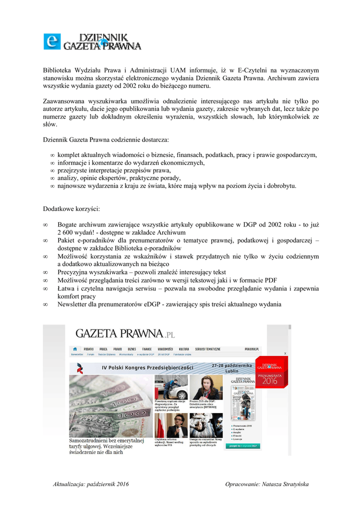 Biblioteka Wydziału Prawa i Administracji UAM informuje, iż w E-Czytelni na wyznaczonym stanowisku można skorzystać elektronicznego wydania Dziennik Gazeta Prawna. Archiwum zawiera wszystkie wydania gazety od 2002 roku do bieżącego numeru. Zaawansowana wyszukiwarka umożliwia odnalezienie interesującego nas artykułu nie tylko po autorze artykułu, dacie jego opublikowania lub wydania gazety, zakresie wybranych dat, lecz także po numerze gazety lub dokładnym określeniu wyrażenia, wszystkich słowach, lub którymkolwiek ze słów. Dziennik Gazeta Prawna codziennie dostarcza: • • • • • komplet aktualnych wiadomości o biznesie, finansach, podatkach, pracy i prawie gospodarczym, informacje i komentarze do wydarzeń ekonomicznych, przejrzyste interpretacje przepisów prawa, analizy, opinie ekspertów, praktyczne porady, najnowsze wydarzenia z kraju ze świata, które mają wpływ na poziom życia i dobrobytu. Dodatkowe korzyści: • • • • • • • Bogate archiwum zawierające wszystkie artykuły opublikowane w DGP od 2002 roku - to już 2 600 wydań! - dostępne w zakładce Archiwum Pakiet e-poradników dla prenumeratorów o tematyce prawnej, podatkowej i gospodarczej – dostępne w zakładce Biblioteka e-poradników Możliwość korzystania ze wskaźników i stawek przydatnych nie tylko w życiu codziennym a dodatkowo aktualizowanych na bieżąco Precyzyjna wyszukiwarka – pozwoli znaleźć interesujący tekst Możliwość przeglądania treści zarówno w wersji tekstowej jaki i w formacie PDF Łatwa i czytelna nawigacja serwisu – pozwala na swobodne przeglądanie wydania i zapewnia komfort pracy Newsletter dla prenumeratorów eDGP - zawierający spis treści aktualnego wydania Aktualizacja: październik 2016 Opracowanie: Natasza Stratyńska