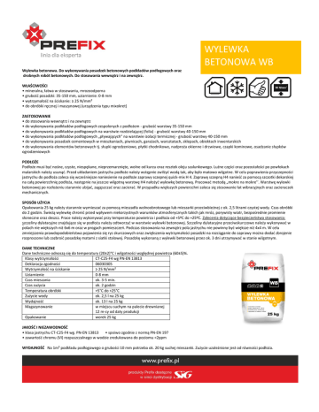 WYLEWKA BETONOWA WB Wylewka betonowa. Do wykonywania posadzek betonowych podkładów podłogowych oraz drobnych robót betonowych. Do stosowania wewnątrz i na zewnątrz. WŁAŚCIWOŚCI • mineralna, łatwa w stosowaniu, mrozoodporna • grubość posadzki: 35-150 mm, uziarnienie: 0-8 mm • wytrzymałość na ściskanie: ≥ 25 N/mm² • do obróbki ręcznej i maszynowej (urządzenia typu mixokret) ZASTOSOWANIE • do stosowania wewnątrz i na zewnątrz • do wykonywania podkładów podłogowych zespolonych z podłożem - grubość warstwy 35-150 mm • do wykonywania podkładów podłogowych na warstwie rozdzielającej (folia) - grubość warstwy 40-150 mm • do wykonywania podkładów podłogowych „pływających” na warstwie izolacji termicznej - grubość warstwy 40-150 mm • do wykonywania posadzek cementowych w mieszkaniach, piwnicach, garażach, warsztatach, sklepach, obiektach inwentarskich • do wykonywania elementów betonowych tj. słupki ogrodzeniowe, płytki chodnikowe, nadproża okienne i drzwiowe, czapki kominowe, osadzanie słupków ogrodzeniowych PODŁOŻE Podłoże musi być nośne, czyste, niespękane, nieprzemarznięte, wolne od kurzu oraz resztek oleju szalunkowego. Luźne części oraz pozostałości po powłokach malarskich należy usunąć. Przed układaniem jastrychu podłoże należy wstępnie zwilżyć wodą tak, aby było matowo wilgotne. W celu poprawienia przyczepności jastrychu do podłoża zaleca się wcześniejsze naniesienie na podłoże zaprawy sczepnej quick-mix H 4. Zaprawę sczepną H4 nanieść za pomocą szczotki dekarskiej na całą powierzchnię podłoża, następnie na jeszcze wilgotną warstwę H4 nałożyć wylewkę betonową. Pracować metodą „mokre na mokre’’. Warstwę wylewki betonowej po rozłożeniu starannie ubijać, zagęszczać oraz zacierać. W przypadku większych powierzchni zaleca się stosowanie łat wibracyjnych oraz zacieraczek mechanicznych. SPOSÓB UŻYCIA Opakowania 25 kg należy starannie wymieszać za pomocą mieszadła wolnoobrotowego lub mieszarki przeciwbieżnej z ok. 2,5 litrami czystej wody. Czas obróbki do 2 godzin. Świeżą wylewkę chronić przed wpływem niekorzystnych warunków atmosferycznych takich jak mróz, porywisty wiatr, bezpośrednie promienie słoneczne oraz deszcz. Prace należy wykonywać przy temperaturze powietrza i podłoża od +5ºC do +25ºC. Zalecenia dotyczące bezpieczeństwa stosowania: szczeliny dylatacyjne znajdujące się w podłożu należy odtworzyć w warstwie wylewki betonowej. Szczeliny dylatacyjne przeciwskurczowe należy wykonywać w polach nie większych niż 6x6 m oraz w progach pomieszczeń. Podczas stosowania na zewnątrz pola jastrychu nie powinny być większe niż 4x4 m. W celu zmniejszenia prawdopodobieństwa pojawienia się rys skurczowych oraz zwiększenia wytrzymałości posadzki na rozciąganie do zaprawy można dodać zbrojenie rozproszone lub zazbroić posadzkę matami z siatki stalowej. Posadzkę wykonaną z wylewki betonowej przez ok. 3 dni utrzymywać w stanie wilgotnym. DANE TECHNICZNE Dane techniczne odnoszą się do temperatury (20±2)°C i wilgotności względnej powietrza (60±5)%. Klasy wytrzymałości CT-C25-F4 wg PN-EN 13813 Deklaracja zgodności 06030305 Wytrzymałość na ściskanie ≥ 25 N/mm² Uziarnienie 0-8 mm Czas mieszania ok. 3-5 min. Czas zużycia ok. 2 godzin Temperatura obróbki +5°C do +25°C Zużycie wody ok. 2,5 l na 25 kg Wydajność ok. 13 l na 25 kg Magazynowanie w miejscu suchym na palecie drewnianej 12 m-cy od daty produkcji Opakowanie worek 25 kg JAKOŚĆ I NIEZAWODNOŚĆ • klasa jastrychu CT-C25-F4 wg. PN-EN 13813 • spoiwo zgodnie z normą PN-EN 197 • zawartość chromu (VI) rozpuszczalnego w wodzie zredukowana do poziomu <2ppm WYDAJNOŚĆ Na 1m² podkładu podłogowego o grubości 10 mm potrzeba ok. 20 kg suchej mieszanki. Zużycie uzależnione jest od równości podłoża.
