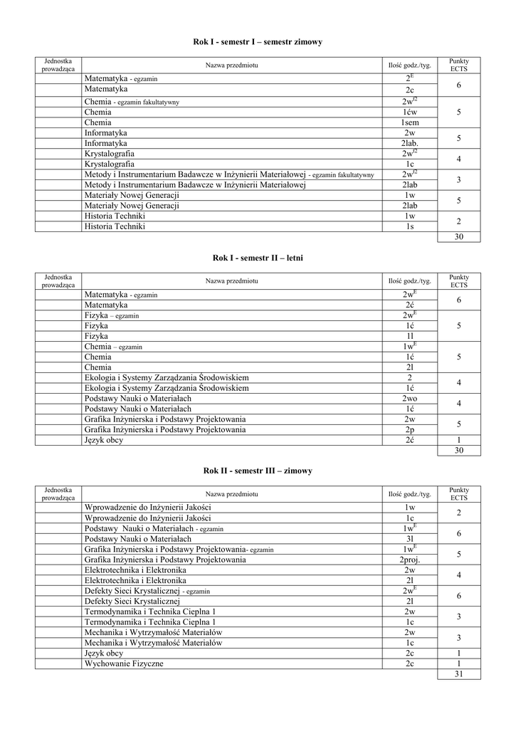 Rok I - semestr I – semestr zimowy Jednostka prowadząca Nazwa przedmiotu Matematyka - egzamin Matematyka Chemia - egzamin fakultatywny Chemia Chemia Informatyka Informatyka Krystalografia Krystalografia Metody i Instrumentarium Badawcze w Inżynierii Materiałowej - egzamin fakultatywny Metody i Instrumentarium Badawcze w Inżynierii Materiałowej Materiały Nowej Generacji Materiały Nowej Generacji Historia Techniki Historia Techniki Ilość godz./tyg. 2E 2c 2wf2 1ćw 1sem 2w 2lab. 2wf2 1c 2wf2 2lab 1w 2lab 1w 1s Punkty ECTS 6 5 5 4 3 5 2 30 Rok I - semestr II – letni Jednostka prowadząca Nazwa przedmiotu Matematyka - egzamin Matematyka Fizyka – egzamin Fizyka Fizyka Chemia – egzamin Chemia Chemia Ekologia i Systemy Zarządzania Środowiskiem Ekologia i Systemy Zarządzania Środowiskiem Podstawy Nauki o Materiałach Podstawy Nauki o Materiałach Grafika Inżynierska i Podstawy Projektowania Grafika Inżynierska i Podstawy Projektowania Język obcy Ilość godz./tyg. 2wE 2ć 2wE 1ć 1l 1wE 1ć 2l 2 1ć 2wo 1ć 2w 2p 2ć Punkty ECTS 6 5 5 4 4 5 1 30 Rok II - semestr III – zimowy Jednostka prowadząca Nazwa przedmiotu Wprowadzenie do Inżynierii Jakości Wprowadzenie do Inżynierii Jakości Podstawy Nauki o Materiałach - egzamin Podstawy Nauki o Materiałach Grafika Inżynierska i Podstawy Projektowania- egzamin Grafika Inżynierska i Podstawy Projektowania Elektrotechnika i Elektronika Elektrotechnika i Elektronika Defekty Sieci Krystalicznej - egzamin Defekty Sieci Krystalicznej Termodynamika i Technika Cieplna 1 Termodynamika i Technika Cieplna 1 Mechanika i Wytrzymałość Materiałów Mechanika i Wytrzymałość Materiałów Język obcy Wychowanie Fizyczne Ilość godz./tyg. 1w 1c 1wE 3l 1wE 2proj. 2w 2l 2wE 2l 2w 1c 2w 1c 2c 2c Punkty ECTS 2 6 5 4 6 3 3 1 1 31 Rok II - semestr IV letni Jednostka prowadząca Ilość godz./tyg. Nazwa przedmiotu 1wE 2l 1w 1ć 1w 1l 2wE 1l 2w 1l 2w 1l 2w 1l 1wE 1c 1w 1s 1ć 2ć 2ć Termodynamika i Technika Cieplna 2 – egzamin Termodynamika i Technika Cieplna 2 Mechanika i Wytrzymałość Materiałów2 Mechanika i Wytrzymałość Materiałów2 Technologia Informacyjna Technologia Informacyjna Materiały Ceramiczne - egzamin Materiały Ceramiczne Materiały Metaliczne Materiały Metaliczne Materiały Polimerowe Materiały Polimerowe Materiały Spiekane Materiały Spiekane Własności Fizykochemiczne Ciała Stałego - egzamin Własności Fizykochemiczne Ciała Stałego Recykling Materiałów Recykling Materiałów Recykling Materiałów Język obcy Wychowanie Fizyczne Str. 82 w indeksie Praktyka wakacyjna 4 tyg. Punkty ECTS 5 3 2 3 3 3 3 3 1 0 30 Termin praktyki VII-IX 2015 Rok III - semestr V zimowy Jednostka prowadząca Nazwa przedmiotu Własności Mechaniczne Materiałów - egzamin Własności Mechaniczne Materiałów Projektowanie Materiałowe i Komputerowa Nauka o Materiałach - egzamin Projektowanie Materiałowe i Komputerowa Nauka o Materiałach Metalurgia Metalurgia Kompozyty Kompozyty Odlewnictwo Odlewnictwo Spawalnictwo Spawalnictwo Rentgenografia - egzamin Rentgenografia Historia Hutnictwa Historia Hutnictwa Język obcy Ilość godz./tyg. 2wE 1lab 2wE 2lab 1w 1l 2w 1l 2w 1l 2w 1l 1wE 2l 1w 1s 2c Punkty ECTS 4 4 2 4 4 4 4 2 2 30 Rok III - semestr VI letni Specjalność: Materiały Metaliczne i Ceramiczne Jednostka prowadząca Nazwa przedmiotu Ekonomika, Organizacja i Zarządzanie w Przedsiębiorstwie Ekonomika, Organizacja i Zarządzanie w Przedsiębiorstwie Ergonomia i Higiena Pracy Ergonomia i Higiena Pracy Korozja Materiałów – egzamin Korozja Materiałów Podstawy Przeróbki Plastycznej Podstawy Przeróbki Plastycznej Obróbka Cieplna i Inżynieria Powierzchni Obróbka Cieplna i Inżynieria Powierzchni Badania Materiałów Badania Materiałów Odlewnictwo Precyzyjne Odlewnictwo Precyzyjne Podstawy Mikroskopii Elektronowej Podstawy Mikroskopii Elektronowej Nowoczesne Materiały i Technologie Nowoczesne Materiały i Technologie Technologie Areologiczne - egzamin Technologie Areologiczne Ilość godz./tyg. 2w 1ć 1w 1s 2wE 1l 2w 1l 2w 2l 2w 1l 1w 2l 2w 1l 2w 1l 2wE 1l Punkty ECTS 3 2 4 3 4 3 4 3 4 4 34 Rok IV - semestr VII zimowy Specjalność: Materiały Metaliczne i Ceramiczne Jednostka prowadząca Nazwa przedmiotu Ochrona Własności Intelektualnej Badania Nieniszczące - egzamin Badania Nieniszczące Materiały na Narzędzia Materiały na Narzędzia Seminarium Dyplomowe Przygotowanie Pracy Inżynierskiej (projektu inżynierskiego) Ilość godz./tyg. Punkty ECTS 1s 2wE 1l 2w 1l 2s 2 4 4 2 15 27