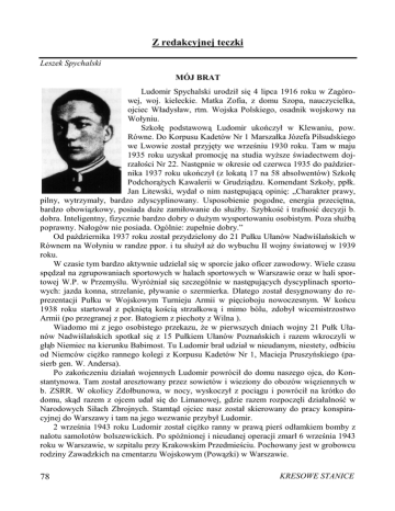 Z redakcyjnej teczki Leszek Spychalski MÓJ BRAT Ludomir Spychalski urodził się 4 lipca 1916 roku w Zagórowej, woj. kieleckie. Matka Zofia, z domu Szopa, nauczycielka, ojciec Władysław, rtm. Wojska Polskiego, osadnik wojskowy na Wołyniu. Szkołę podstawową Ludomir ukończył w Klewaniu, pow. Równe. Do Korpusu Kadetów Nr 1 Marszałka Józefa Piłsudskiego we Lwowie został przyjęty we wrześniu 1930 roku. Tam w maju 1935 roku uzyskał promocję na studia wyższe świadectwem dojrzałości Nr 22. Następnie w okresie od czerwca 1935 do października 1937 roku ukończył (z lokatą 17 na 58 absolwentów) Szkołę Podchorążych Kawalerii w Grudziądzu. Komendant Szkoły, ppłk. Jan Litewski, wydał o nim następującą opinię: „Charakter prawy, pilny, wytrzymały, bardzo zdyscyplinowany. Usposobienie pogodne, energia przeciętna, bardzo obowiązkowy, posiada duże zamiłowanie do służby. Szybkość i trafność decyzji b. dobra. Inteligentny, fizycznie bardzo dobry o dużym wysportowaniu osobistym. Poza służbą poprawny. Nałogów nie posiada. Ogólnie: zupełnie dobry.” Od października 1937 roku został przydzielony do 21 Pułku Ułanów Nadwiślańskich w Równem na Wołyniu w randze ppor. i tu służył aż do wybuchu II wojny światowej w 1939 roku. W czasie tym bardzo aktywnie udzielał się w sporcie jako oficer zawodowy. Wiele czasu spędzał na zgrupowaniach sportowych w halach sportowych w Warszawie oraz w hali sportowej W.P. w Przemyślu. Wyróżniał się szczególnie w następujących dyscyplinach sportowych: jazda konna, strzelanie, pływanie o szermierka. Dlatego został desygnowany do reprezentacji Pułku w Wojskowym Turnieju Armii w pięcioboju nowoczesnym. W końcu 1938 roku startował z pękniętą kością strzałkową i mimo bólu, zdobył wicemistrzostwo Armii (po przegranej z por. Batogiem z piechoty z Wilna ). Wiadomo mi z jego osobistego przekazu, że w pierwszych dniach wojny 21 Pułk Ułanów Nadwiślańskich spotkał się z 15 Pułkiem Ułanów Poznańskich i razem wkroczyli w głąb Niemiec na kierunku Babimost. Tu Ludomir brał udział w nieudanym, niestety, odbiciu od Niemców ciężko rannego kolegi z Korpusu Kadetów Nr 1, Macieja Pruszyńskiego (pasierb gen. W. Andersa). Po zakończeniu działań wojennych Ludomir powrócił do domu naszego ojca, do Konstantynowa. Tam został aresztowany przez sowietów i wieziony do obozów więziennych w b. ZSRR. W okolicy Zdołbunowa, w nocy, wyskoczył z pociągu i powrócił na krótko do domu, skąd razem z ojcem udał się do Limanowej, gdzie razem rozpoczęli działalność w Narodowych Siłach Zbrojnych. Stamtąd ojciec nasz został skierowany do pracy konspiracyjnej do Warszawy i tam na jego wezwanie przybył Ludomir. 2 września 1943 roku Ludomir został ciężko ranny w prawą pierś odłamkiem bomby z nalotu samolotów bolszewickich. Po spóźnionej i nieudanej operacji zmarł 6 września 1943 roku w Warszawie, w szpitalu przy Krakowskim Przedmieściu. Pochowany jest w grobowcu rodziny Zawadzkich na cmentarzu Wojskowym (Powązki) w Warszawie. 78 KRESOWE STANICE Pochwała dla Polonii na Łotwie Polacy zamieszkali na Łotwie są w większości potomkami osadników z odległych czasów kiedy to Inflanty od 1561 roku należały do Polski, a hetman Jan Karol Chodkiewicz pokonał w 1605 roku pod Kirchholmem (obecnie Salaspils) kilkakrotnie liczniejszych Szwedów. Ich patriotyzm i polszczyzna są godne pochwały. Członek Zarządu naszego Stowarzyszenia po raz kolejny odwiedził Rygę we wrześniu bieżącego roku. Jest pasjonatem żeglarstwa morskiego, toteż podróż do Rygi odbył pod żaglami jachtu. W mesie załoga jachtu spotkała się z przedstawicielami Związku Polaków na Łotwie. Dzieci z polskich szkół podstawowych zwiedziły jacht pod polską banderą. Dzieci z Polskiej Szkoły w Rydze zwiedziły nasz jacht. W następnym numerze przybliżymy naszym Czytelnikom historię i niektóre obecne problemy polskich środowisk na Łotwie. A.T. WAŻNE! Wszyscy którzy wraz z nowym numerem biuletynu otrzymają deklarację członkowską proszeni są o jej dokładne wypełnienie w celu uzupełnienia naszej ewidencji danych osobowych oraz przesłanie na adres Stowarzyszenia. KRESOWE STANICE 79 POMNIK ADAMA MICKIEWICZA W GRODNIE 29 października 1998 roku w Grodnie przed siedzibą Związku Polaków na Białorusi odsłonięto pomnik naszego wieszcza Adama Mickiewicza. Na uroczystość zostali zaproszeni przedstawiciele naszego stowarzyszenia. W obecności licznie przybyłych delegacji z Polski, Litwy, Białorusi, władz lokalnych i mieszkańców Grodna odsłonięcia dokonał twórca popiersia. Na pomniku widnieje napis w języku białoruskim i polskim: ADAMOWI MICKIEWICZOWI WDZIĘCZNI RODACY 1998 W następnym numerze KRESOWYCH STANIC ukaże się obszerna relacja z pobytu naszej delegacji na Białorusi. J.S. Pomnik Adama Mickiewicza w Grodnie POSZUKIWANIA •Pan Jerzy Baluch, syn Józefa Balucha, zamieszkały obecnie w Warszawie (kod 02582, ul Wiktorska 90 m 24) prosi o kontakt wszystkich z osady Maczkowce koło Jezioran Polskich, gm. Połonka, pow Łuck na Wołyniu. •Pani Zofia Wilk zamieszkała w Warszawie (kod 00-743, ul. Nabielaka 2 m 33) poszukuje rodziny Antoniego Kojka i Stanisława Polaka wywiezionych 10 II 1940 r na posiołek Małyje Izby w obłasti Archangielsk. Poszukiwani mieszkali w osadzie Nowosiółki, gm. Roś, pow. Wołkowysk, woj. białostockie. •M.H.Rybczyńscy zamieszkali: 935 East 171 St Sreet, South Holland, CHICAGO, ILINOIS 60473-3501, USA, poszukują rodziny Krogulców (Argentyna, Buenos Aires): Zygmunta Krogulca lat 75-78 żołnierza I Dywizji Pancernej, 10-ty Pułk Strzelców Konnych, jego żony Bożeny z domu Frankowskiej, lat ok. 70 z Warszawy, uczestniczki Powstania Warszawskiego, więżnia obozu Oberlangen. P. Kroulce mieli dwóch synów. •Filomena Michałowska-Bykowska poszukuje Eleonory Masalskiej z d. Sawickiej, urodzonej w1913 r. w Holszanach woj. wileńskie. De