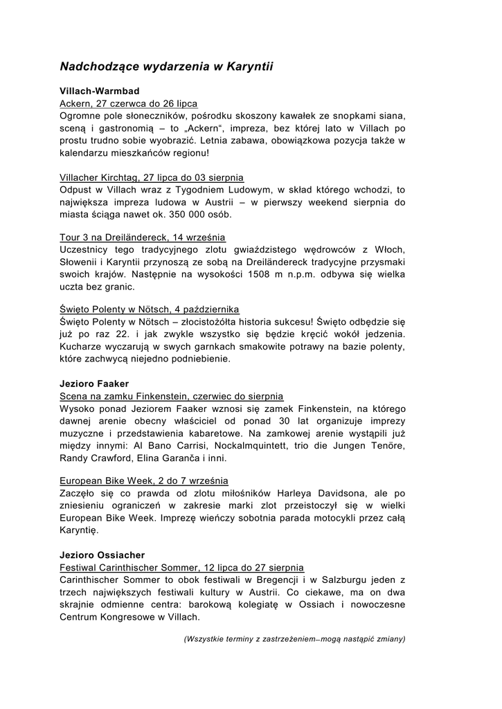 Nadchodzące wydarzenia w Karyntii Villach-Warmbad Ackern, 27 czerwca do 26 lipca Ogromne pole słoneczników, pośrodku skoszony kawałek ze snopkami siana, sceną i gastronomią – to „Ackern“, impreza, bez której lato w Villach po prostu trudno sobie wyobrazić. Letnia zabawa, obowiązkowa pozycja także w kalendarzu mieszkańców regionu! Villacher Kirchtag, 27 lipca do 03 sierpnia Odpust w Villach wraz z Tygodniem Ludowym, w skład którego wchodzi, to największa impreza ludowa w Austrii – w pierwszy weekend sierpnia do miasta ściąga nawet ok. 350 000 osób. Tour 3 na Dreiländereck, 14 września Uczestnicy tego tradycyjnego zlotu gwiaździstego wędrowców z Włoch, Słowenii i Karyntii przynoszą ze sobą na Dreiländereck tradycyjne przysmaki swoich krajów. Następnie na wysokości 1508 m n.p.m. odbywa się wielka uczta bez granic. Święto Polenty w Nötsch, 4 października Święto Polenty w Nötsch – złocistożółta historia sukcesu! Święto odbędzie się już po raz 22. i jak zwykle wszystko się będzie kręcić wokół jedzenia. Kucharze wyczarują w swych garnkach smakowite potrawy na bazie polenty, które zachwycą niejedno podniebienie. Jezioro Faaker Scena na zamku Finkenstein, czerwiec do sierpnia Wysoko ponad Jeziorem Faaker wznosi się zamek Finkenstein, na którego dawnej arenie obecny właściciel od ponad 30 lat organizuje imprezy muzyczne i przedstawienia kabaretowe. Na zamkowej arenie wystąpili już między innymi: Al Bano Carrisi, Nockalmquintett, trio die Jungen Tenöre, Randy Crawford, Elina Garanča i inni. European Bike Week, 2 do 7 września Zaczęło się co prawda od zlotu miłośników Harleya Davidsona, ale po zniesieniu ograniczeń w zakresie marki zlot przeistoczył się w wielki European Bike Week. Imprezę wieńczy sobotnia parada motocykli przez całą Karyntię. Jezioro Ossiacher Festiwal Carinthischer Sommer, 12 lipca do 27 sierpnia Carinthischer Sommer to obok festiwali w Bregencji i w Salzburgu jeden z trzech największych festiwali kultury w Austrii. Co ciekawe, ma on dwa skrajnie odmienne centra: barokową kolegiatę w Ossiach i nowoczesne Centrum Kongresowe w Villach. Informacja i rezerwacje: Region Villach Tourismus GmbH Töbringer Straße 1 • 9523 Villach-Landskron, Österreich Tel.: +43 / (0)4242 / 42000 – 56 • Fax DW: 42 e-mail: [email protected] • www.region-villach.at Nasze cyfrowe archiwum zdjęć oraz cały kalendarz wydarzeń znajdą Państwo pod adresem: www.region-villach.at