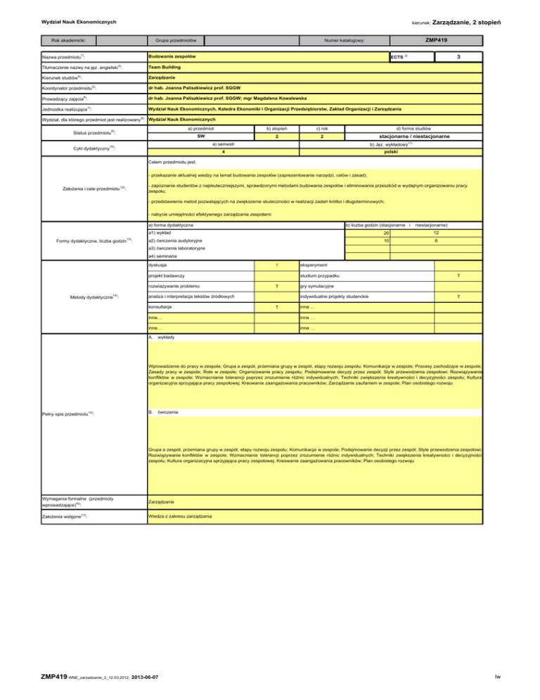 Wydział Nauk Ekonomicznych kierunek: Rok akademicki: Grupa przedmiotów Nazwa przedmiotu1): Budowanie zespołów Tłumaczenie nazwy na jęz. angielski 3): Team Building Kierunek studiów4): Zarządzanie 5) Zarządzanie, 2 stopień ZMP419 Numer katalogowy: ECTS 3 2) dr hab. Joanna Paliszkiewicz prof. SGGW Koordynator przedmiotu : 6) Prowadzący zajęcia : dr hab. Joanna Paliszkiewicz prof. SGGW; mgr Magdalena Kowalewska Jednostka realizująca 7): Wydział Nauk Ekonomicznych, Katedra Ekonomiki i Organizacji Przedsiębiorstw, Zakład Organizacji i Zarządzania Wydział, dla którego przedmiot jest realizowany 8): Wydział Nauk Ekonomicznych Status przedmiotu 9): a) przedmiot b) stopień c) rok d) forma studiów SW 2 2 stacjonarne / niestacjonarne Cykl dydaktyczny10): a) semestr b) Jęz. wykładowy11) 4 polski Celem przedmiotu jest: - przekazanie aktualnej wiedzy na temat budowania zespołów (zaprezentowanie narzędzi, celów i zasad); Założenia i cele przedmiotu 12) : - zapoznanie studentów z najskuteczniejszymi, sprawdzonymi metodami budowania zespołów i eliminowania przeszkód w wydajnym organizowaniu pracy zespołu; - przedstawienie metod pozwalających na zwiększenie skuteczności w realizacji zadań krótko i długoterminowych; - nabycie umiejętności efektywnego zarządzania zespołami a) forma dydaktyczna Formy dydaktyczne, liczba godzin13): b) liczba godzin (stacjonarne i niestacjonarne) a1) wykład 20 12 a2) ćwiczenia audytoryjne 10 6 a3) ćwiczenia laboratoryjne a4) seminaria dyskusja T projekt badawczy rozwiazywanie problemu Metody dydaktyczne14): T gry symulacyjne T inne … indywidualne projekty studenckie analiza i interpretacja tekstów źródłowych konsultacje eksperyment studium przypadku inne… inne … inne… inne … A. T T wykłady Wprowadzenie do pracy w zespole; Grupa a zespół, przemiana grupy w zespół, etapy rozwoju zespołu; Komunikacja w zespole; Procesy zachodzące w zespole; Zasady pracy w zespole; Role w zespole; Organizowanie pracy zespołu; Podejmowanie decyzji przez zespół; Style przewodzenia zespołowi; Rozwiązywanie konfliktów w zespole; Wzmacnianie tolerancji poprzez zrozumienie różnic indywidualnych; Techniki zwiększenia kreatywności i decyzyjności zespołu; Kultura organizacyjna sprzyjająca pracy zespołowej; Kreowanie zaangażowania pracowników; Zarządzanie zaufaniem w zespole; Plan osobistego rozwoju Pełny opis przedmiotu 15): B. ćwiczenia Grupa a zespół, przemiana grupy w zespół, etapy rozwoju zespołu; Komunikacja w zespole; Podejmowanie decyzji przez zespół; Style przewodzenia zespołowi; Rozwiązywanie konfliktów w zespole; Wzmacnianie tolerancji poprzez zrozumienie różnic indywidualnych; Techniki zwiększenia kreatywności i decyzyjności zespołu; Kultura organizacyjna sprzyjająca pracy zespołowej; Kreowanie zaangażowania pracowników; Plan osobistego rozwoju Wymagania formalne (przedmioty wprowadzające)16): Zarządzanie Założenia wstępne17): Wiedza z zakresu zarządzania ZMP419 WNE_zarzadzanie_2_12.03.2012, 2013-06-07 lw Wydział Nauk Ekonomicznych kierunek: Efekty kształcenia 18): (z kolejnymi numerami, 01, 02, 03 itd.) 01 - student potrafi ocenić, które działania wpływają pozytywnie na budowanie zespołów; 05 - 02 - student ma umiejętność wykorzystywania metod, umożliwiających efektywne zarządzanie zespołami 06 - 03 - posiada świadomość, jak budować efektywne zespoły 07 - 04 -student potrafi zidentyfikować najważniejsze zasady zarządzania zespołami 08 - kolokwium na zajęciach ćwiczeniowych Sposób weryfikacji efektów kształcenia 19) : 01, 02, 03,04 praca pisemna przygotowywana w ramach pracy własnej studenta ocena wynikająca z obserwacji w trakcie zajęć ocena eksperymentów wykonywanych w trakcie zajęć przygotowanie zespołowej analizy zdefiniowanego problemu ocena wystąpień i prezentacji w trakcie zajęć 02 test komputerowy egzamin ustny inne.. okresowe prace pisemne Waga w % 50% praca pisemna przygotowywana w ramach pracy własnej studenta 10% ocena eksperymentów wykonywanych w trakcie zajęć imienne karty oceny studenta inne.. Element oceny ocena wykonania zadania projektowego na zdefiniowany temat ocena wynikająca z obserwacji w trakcie zajęć Waga w % 10% 10% przygotowanie zespołowej analizy zdefiniowanego problemu 10% obserwacja w trakcie dyskusji zdefiniowanego problemu (aktywność) egzamin pisemny test egzamin ustny inne.. inne… inne.. Miejsce realizacji zajęć22): 02 inne.. kolokwium na zajęciach ćwiczeniowych ocena wystąpień i prezentacji w trakcie zajęć 03 treść pytań egzaminacyjnych z oceną T inne… Element oceny 02, 03,04 inne.. T złożone projekty prezentacje Elementy i wagi mające wpływ na ocenę końcową21): obserwacja w trakcie dyskusji zdefiniowanego problemu (aktywność) egzamin pisemny inne… Forma dokumentacji osiągniętych efektów kształcenia 20): ocena wykonanie zadania projektowego na zdefiniowany temat Zarządzanie, 2 stopień 10% sala dydaktyczna Literatura podstawowa i uzupełniająca23): a) podstawowa 1. Maddux R.B., Budowanie zespołu, wyd. One Press 2006 b) uzupełniająca Adair J., Anatomia biznesu. Budowanie Zespołu, Wyd. Emka, Warszawa 2001 Heidema J.M., McKenzie C., Budowanie zespołu z pasją, Rebis Dom Wydawniczy, 2007 Kossowska M., Sołtysińska I., Budowanie zespołów.; Materiały szkoleniowe – ćwiczenia, formularze, wskazówki dla prowadzącego, Oficyna Ekonomiczna, Grudzień 2005 UWAGI24): ZMP419 WNE_zarzadzanie_2_12.03.2012, 2013-06-07 lw