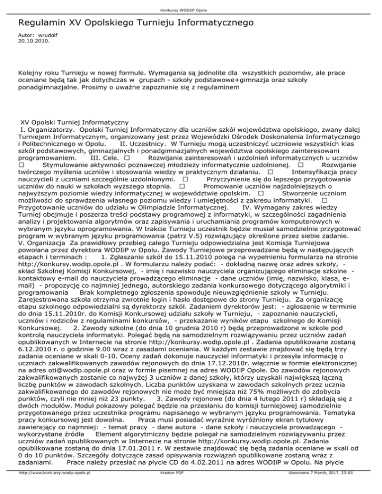 Konkursy WODIiP Opole Regulamin XV Opolskiego Turnieju Informatycznego Autor: wrudolf 20.10.2010. Kolejny roku Turnieju w nowej formule. Wymagania są jednolite dla wszystkich poziomów, ale prace oceniane będą tak jak dotychczas w grupach - szkoły podstawowe+gimnazja oraz szkoły ponadgimnazjalne. Prosimy o uważne zapoznanie się z regulaminem XV Opolski Turniej Informatyczny I. Organizatorzy. Opolski Turniej Informatyczny dla uczniów szkół województwa opolskiego, zwany dalej Turniejem Informatycznym, organizowany jest przez Wojewódzki Ośrodek Doskonalenia Informatycznego i Politechnicznego w Opolu. II. Uczestnicy. W Turnieju mogą uczestniczyć uczniowie wszystkich klas szkół podstawowych, gimnazjalnych i ponadgimnazjalnych województwa opolskiego zainteresowani programowaniem. III. Cele. · Rozwijanie zainteresowań i uzdolnień informatycznych u uczniów · Stymulowanie aktywności poznawczej młodzieży informatycznie uzdolnionej. · Rozwijanie twórczego myślenia uczniów i stosowania wiedzy w praktycznym działaniu. · Intensyfikacja pracy nauczycieli z uczniami szczególnie uzdolnionymi. · Przyczynienie się do lepszego przygotowania uczniów do nauki w szkołach wyższego stopnia. · Promowanie uczniów najzdolniejszych o najwyższym poziomie wiedzy informatycznej w województwie opolskim. · Stworzenie uczniom możliwości do sprawdzenia własnego poziomu wiedzy i umiejętności z zakresu informatyki. · Przygotowanie uczniów do udziału w Olimpiadzie Informatycznej. IV. Wymagany zakres wiedzy Turniej obejmuje i poszerza treści podstawy programowej z informatyki, w szczególności zagadnienia analizy i projektowania algorytmów oraz zapisywania i uruchamiania programów komputerowych w wybranym języku oprogramowania. W trakcie Turnieju uczestnik będzie musiał samodzielnie przygotować program w wybranym języku programowania (patrz V.5) rozwiązujący określone przez siebie zadanie. V. Organizacja Za prawidłowy przebieg całego Turnieju odpowiedzialna jest Komisja Turniejowa powołana przez dyrektora WODIiP w Opolu. Zawody Turniejowe przeprowadzane będą w następujących etapach i terminach : 1. Zgłaszanie szkół do 15.11.2010 polega na wypełnieniu formularza na stronie http://konkursy.wodip.opole.pl . W formularzu należy podać: - dokładną nazwę oraz adres szkoły, skład Szkolnej Komisji Konkursowej, - imię i nazwisko nauczyciela organizującego eliminacje szkolne kontaktowy e-mail do nauczyciela prowadzącego eliminacje - dane uczniów (imię, nazwisko, klasa, email) - propozycję co najmniej jednego, autorskiego zadania konkursowego dotyczącego algorytmiki i programowania Brak kompletnego zgłoszenia spowoduje nieuwzględnienie szkoły w Turnieju. Zarejestrowana szkoła otrzyma zwrotnie login i hasło dostępowe do strony Turnieju. Za organizację etapu szkolnego odpowiedzialni są dyrektorzy szkół. Zadaniem dyrektorów jest: - zgłoszenie w terminie do dnia 15.11.2010r. do Komisji Konkursowej udziału szkoły w Turnieju, - zapoznanie nauczycieli, uczniów i rodziców z regulaminami konkursów, - przekazanie wyników etapu szkolnego do Komisji Konkursowej. 2. Zawody szkolne (do dnia 10 grudnia 2010 r) będą przeprowadzone w szkole pod kontrolą nauczyciela informatyki. Polegać będą na samodzielnym rozwiązywaniu przez uczniów zadań opublikowanych w Internecie na stronie http://konkursy.wodip.opole.pl . Zadania opublikowane zostaną 6.12.2010 r. o godzinie 9.00 wraz z zasadami oceniania. W każdym zestawie znajdować się będą trzy zadania oceniane w skali 0-10. Oceny zadań dokonuje nauczyciel informatyki i przesyła informację o uczniach zakwalifikowanych zawodów rejonowych do dnia 17.12.2010r. włącznie w formie elektronicznej na adres [email protected] oraz w formie pisemnej na adres WODIiP Opole. Do zawodów rejonowych zakwalifikowanych zostanie co najwyżej 3 uczniów z danej szkoły, którzy uzyskali największą łączną liczbę punktów w zawodach szkolnych. Liczba punktów uzyskana w zawodach szkolnych przez ucznia zakwalifikowanego do zawodów rejonowych nie może być mniejsza niż 75% możliwych do zdobycia punktów, czyli nie mniej niż 23 punkty. 3. Zawody rejonowe (do dnia 4 lutego 2011 r) składają się z dwóch modułów. Moduł pokazowy polegać będzie na przesłaniu do komisji turniejowej samodzielnie przygotowanego przez uczestnika programu napisanego w wybranym języku programowania. Tematyka pracy konkursowej jest dowolna. Praca musi posiadać wyraźnie wyróżniony ekran tytułowy zawierający co najmniej: - temat pracy - dane autora - dane szkoły i nauczyciela prowadzącego wykorzystane źródła Element algorytmiczny będzie polegał na samodzielnym rozwiązywaniu przez uczniów zadań opublikowanych w Internecie na stronie http://konkursy.wodip.opole.pl. Zadania opublikowane zostaną do dnia 17.01.2011 r. W zestawie znajdować się będą zadania oceniane w skali od 0 do 10 punktów. Szczegóły dotyczące zasad opisywania rozwiązań opublikowane zostaną wraz z zadaniami. Prace należy przesłać na płycie CD do 4.02.2011 na adres WODIiP w Opolu. Na płycie http://www.konkursy.wodip.opole.pl Kreator PDF Utworzono 7 March, 2017, 23:03 Konkursy WODIiP Opole należy umieścić następujące foldery: - BIN – zawierający gotowy do uruchomienia program z wszystkimi niezbędnymi bibliotekami - KOD – zawierający pełny kod źródłowy programu ze wszystkimi niezbędnymi komentarzami - OPIS – zawierający plik OPIS.TXT ze szczegółowym opisem pracy, wykorzystanych algorytmów i narzędzi - ZADANIA – folder zawierający rozwiązania zadań z elementu algorytmicznego zgodny z opublikowanym opisem Informacje o uczestnikach zakwalifikowanych do finału będą umieszczone na stronie konkursu do dnia 1 marca 2011 r. Do etapu finałowego zakwalifikowani zostaną uczestnicy, którzy uzyskali nie mniej niż 85% możliwych do zdobycia punktów z tym, że zakwalifikowanych zostanie co najwyżej 16 uczniów