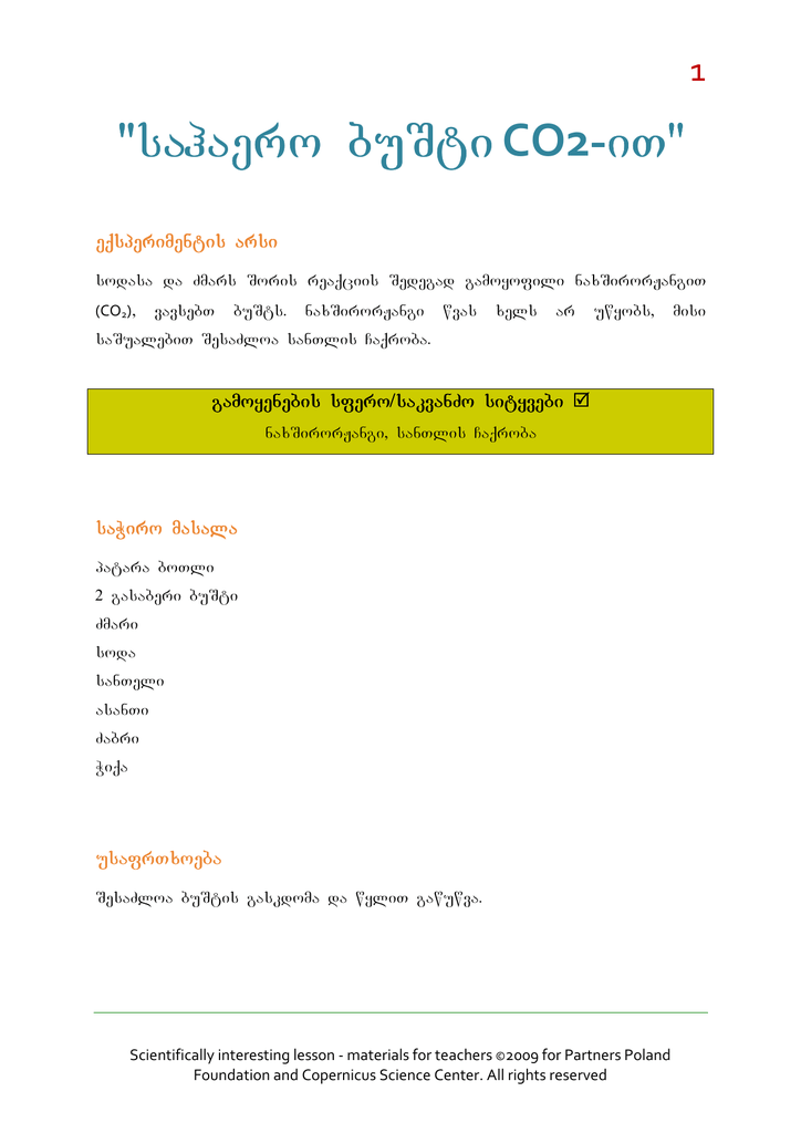 1 "sahaero buSti CO2--iT" eqsperimentis arsi sodasa da Zmars Soris reaqciis Sedegad gamoyofili naxSirorJangiT (CO2), vavsebT buSts. naxSirorJangi wvas xels ar uwyobs, saSualebiT SesaZloa sanTlis Caqroba. gamoyenebis sfero/sakvanZo sityvebi naxSirorJangi, sanTlis Caqroba saWiro masala patara boTli 2 gasaberi buSti Zmari soda sanTeli asanTi Zabri Wiqa usafrTxoeba SesaZloa buStis gaskdoma da wyliT gawuwva. Scientifically interesting lesson - materials for teachers ©2009 for Partners Poland Foundation and Copernicus Science Center. All rights reserved misi 2 ganxorcieleba boTlSi Zmari CavasxaT. buStSi Zabris meSveobiT soda CavyaroT. raodenoba eqsperimentuli gziT unda davadginoT. boTlis Tavze buSti CamovacvaT da soda buStidan boTlSi CavyaroT. reaqcia Zmarsa da sodas Soris swrafad midis, amitom saWiroa buStis daWera. garkveuli drois Semdeg buSti aivseba airiT. aseTi buStiT SesaZloa sxvadasxva eqsperimentis Catareba. magaliTad: vavsebT meore buSts haeriT (daaxloebiT imave zomaze), da vadarebT, romeli ufro swrafad vardeba (SedarebiT swrafad vardeba is, romeic CO2-iTaa avsebuli) CO2-iT savse buSti CavcaloT WiqaSi, davxaroT Wiqa anTebul sanTelze da naxSirorJangi als Caaqrobs. ganmarteba Zmari ZmarmJavas wyalxsnaria CH3COOH. gawmendili soda NaHCO3 marilia - bikarbonati. Zmrisa da sodis SereviT xdeba reaqcia, ris Sedegad warmoiqmneba natriumis acetati da naxSirorJangi. ZmarmJava + sodis bikarbonati = natriumis acetati + naxSirmJava anu: CH3COOH + NaHCO3 = CH3COONa + H2CO3 SedarebiT Zlieri ZmarmJava sakuTari marilidan naxSirmJavas gamoaZevebs. wyalxsnarSi naxSirmJava myisierad iSleba H2CO3 = H2O + CO2 naxSirorJangi (naxSirbadis IV oqsidi) CO2 - haerze mZime airia, araalebadia (ar iwvis) da amitom misi daxmarebiT SesaZloa CavaqroT cecxli, rodesac Wiqidan mas anTebul sanTels “davasxamT”. Scientifically interesting lesson - materials for teachers ©2009 for Partners Poland Foundation and Copernicus Science Center. All rights reserved 3 gasaTvaliswinebeli momentebi sanTlis davxaroT Caqroba Tu sanTelze ver moxerxda boTli. masSi buStis SigTavsiT, moTavsebuli SegviZlia naxSirorJangi “daesxmeba” da Caaqrobs cecxls. Scientifically interesting lesson - materials for teachers ©2009 for Partners Poland Foundation and Copernicus Science Center. All rights reserved
