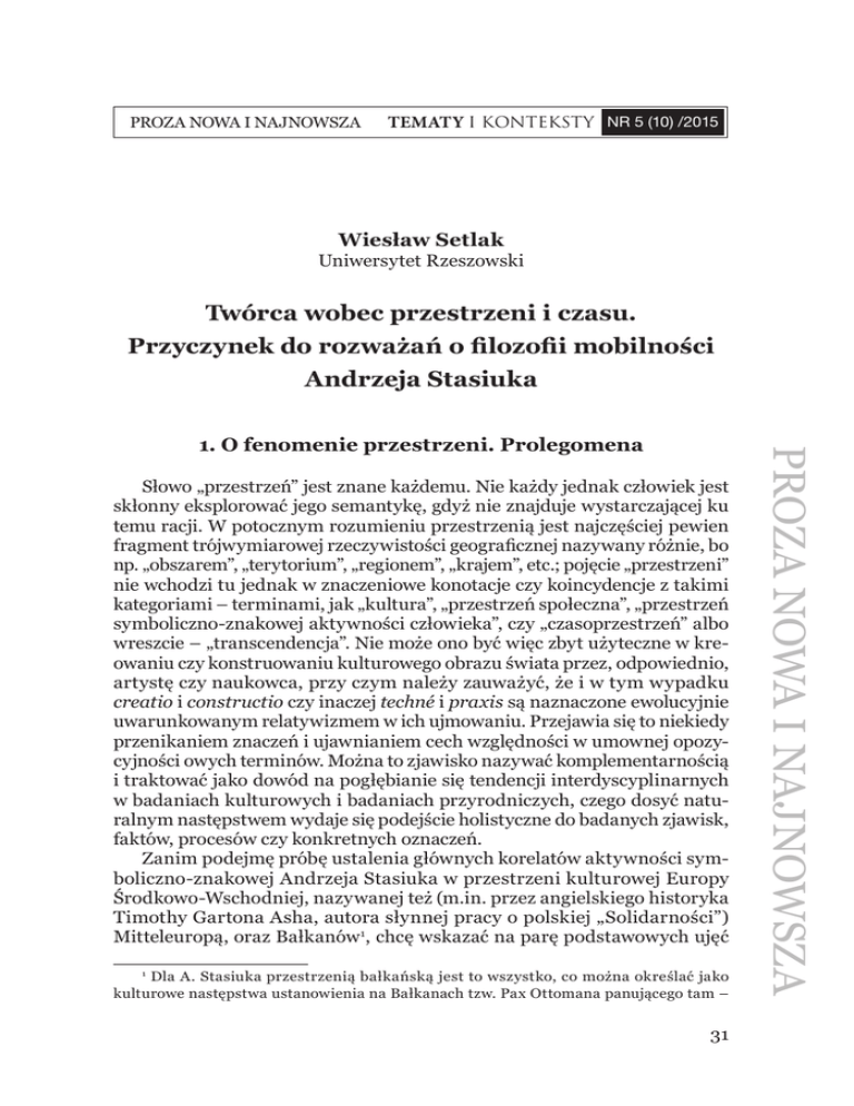 PROZA NOWA I NAJNOWSZA TEMATY I KONTEKSTY NR 5 (10) /2015 Wiesław Setlak Uniwersytet Rzeszowski Twórca wobec przestrzeni i czasu. Przyczynek do rozważań o filozofii mobilności Andrzeja Stasiuka Słowo „przestrzeń” jest znane każdemu. Nie każdy jednak człowiek jest skłonny eksplorować jego semantykę, gdyż nie znajduje wystarczającej ku temu racji. W potocznym rozumieniu przestrzenią jest najczęściej pewien fragment trójwymiarowej rzeczywistości geograficznej nazywany różnie, bo np. „obszarem”, „terytorium”, „regionem”, „krajem”, etc.; pojęcie „przestrzeni” nie wchodzi tu jednak w znaczeniowe konotacje czy koincydencje z takimi kategoriami – terminami, jak „kultura”, „przestrzeń społeczna”, „przestrzeń symboliczno-znakowej aktywności człowieka”, czy „czasoprzestrzeń” albo wreszcie – „transcendencja”. Nie może ono być więc zbyt użyteczne w kreowaniu czy konstruowaniu kulturowego obrazu świata przez, odpowiednio, artystę czy naukowca, przy czym należy zauważyć, że i w tym wypadku creatio i constructio czy inaczej techné i praxis są naznaczone ewolucyjnie uwarunkowanym relatywizmem w ich ujmowaniu. Przejawia się to niekiedy przenikaniem znaczeń i ujawnianiem cech względności w umownej opozycyjności owych terminów. Można to zjawisko nazywać komplementarnością i traktować jako dowód na pogłębianie się tendencji interdyscyplinarnych w badaniach kulturowych i badaniach przyrodniczych, czego dosyć naturalnym następstwem wydaje się podejście holistyczne do badanych zjawisk, faktów, procesów czy konkretnych oznaczeń. Zanim podejmę próbę ustalenia głównych korelatów aktywności symboliczno-znakowej Andrzeja Stasiuka w przestrzeni kulturowej Europy Środkowo-Wschodniej, nazywanej też (m.in. przez angielskiego historyka Timothy Gartona Asha, autora słynnej pracy o polskiej „Solidarności”) Mitteleuropą, oraz Bałkanów1, chcę wskazać na parę podstawowych ujęć 1 Dla A. Stasiuka przestrzenią bałkańską jest to wszystko, co można określać jako kulturowe następstwa ustanowienia na Bałkanach tzw. Pax Ottomana panującego tam – 31 PROZA NOWA I NAJNOWSZA 1. O fenomenie przestrzeni. Prolegomena Wiesław Setlak kategorii przestrzeni funkcjonujących w tradycji nauk innych niż humanistyczne. Zacznę więc od szeroko rozumianego przyrodoznawstwa, którego rozwój nie byłby możliwy bez inspiracji kopernikańskiej. To bowiem, co dała światu wpierw myśl Mikołaja Kopernika, czyli ogólną wizję przestrzeni Kosmosu i mechanizmów nią rządzących (teoria heliocentryczna), a później Renè Descartesa (Kartezjusza), czyli metodę pozwalającą na racjonalne badanie rzeczywistości, uważać można za fundament nowożytnej nauki. Kopernikanizm, wyłożony w dziele De revolutionibus orbium coelestium (O obrotach sfer niebieskich, 1543), znalazł rychło uznanie u takich myślicieli, jak Giordano Bruno, Johannes Kepler czy Galileusz, by w wiekach późniejszych włączyć się w potężny nurt tych nauk ścisłych, które przyczyniły się do powstania nowoczesnej astrofizyki i kosmologii. Z kolei kartezjanizm, z jego ontologią (cogito ergo sum), epistemologią (sceptycyzm poznawczy) i metafizyką (dualizm duszy i ciała), wywarł kapitalny wpływ między innymi na idealizm George’a Berkeleya, filozofię przyrody Isaaca Newtona czy metafizykę Immanuela Kanta. Warto w tym miejscu zacytować, zresztą swoistość języka niejako zmusza do tego, stwierdzenia następujące: W substracie kopernikańskim nie wybieramy miejsca. Miejsca są współzmiennicze. Substrat kopernikański z definicji bazuje na ziarnistości i antyrozróżnialności. Nie wybieramy żadnego punktu. Wszystkie punkty są jednakowo traktowane. Przestrzeń kosmiczna jest bez stratyfikacji. Świat jest ogólnie kowariantny. Jest tym, co pozostaje po odrzuceniu zmienniczości, jest tym, co jest niezmiennicze2. W opowieściach Jadąc do Babadag (2006), Nie ma ekspresów przy żółtych drogach (2013) i Wschód (2014), które wstępnie i umownie pozwolę sobie zaliczyć do nurtu „podróżniczego” jego twórczości, można doszukiwać się śladów myślenia kosmograficznego, nie przybiera ono jednak aż tak wyrafinowanych form, jak w powyższej charakterystyce „substratu kopernikańskiego”, nader zresztą mętnej i zdającej się przy tym upajać swoją nieczytelnością mającą uchodzić za scjentyzm. W prozie Stasiuka nie brakuje tropów dowodzących niemałej erudycji autora i poświadczających głębię czytelniczych doświadczeń. Na jego hipotetyczną kosmografię składają się nie tyle lektury, co doświadczenia z detalicznie dokumentowanych podróży. Autor Wschodu i innych opowieści woli rejestry przypominające niekiedy „ekonomikę” językową Kafki, ale i też porównywalnie często kojarzące się z toposem „podróży sentymentalnej”. Andrzej Stasiuk zdaje się z centrum w tureckim Stambule – przez kilkaset lat, od zdobycia Konstantynopola przez Turków w 1453 r. przez czas podbojów Sulejmana Wspaniałego w pierwszej połowie XVI w. po upadek imperium osmańskiego w 1922 r. w rezultacie rewolucji ruchu Młodych Turków pod wodzą Kemala Atatürka i śmierci ostatniego władcy osmańskiego, sułtana Mehmeda VI. Należy dodać, że demontażowi imperium przysłużył się wzrost nacjonalizmu bałkańskiego w XIX w. Por. M. Todorova, Bałkany wyobrażone, przeł. P. Szymór i M. Budzińska, Wołowiec 2008, s. 378 i n. 2 M. Zabierowski, Przestrzeń w kosmografii fraktalnej [w:] Przestrzeń w nauce współczesnej, t. 1, red. S. Symotiuk i G. Nowak, Lublin 1998, s. 77. 32 Twórca wobec przestrzeni i czasu. Przyczynek do rozważań o filozofii mobilności… poruszać w rytmie dialektyki czułości i nieufności po świecie, w którym aktom poznania towarzyszą przepojone melancholią konstatacje epistemologicznej niepewności (tuszowane nieco brawurą wypowiedzi) i przeczucie, że jeg