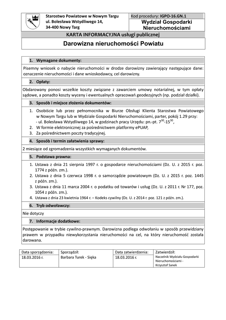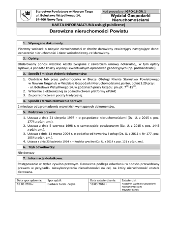 Starostwo Powiatowe w Nowym Targu ul. Bolesława Wstydliwego 14, 34-400 Nowy Targ Kod procedury: IGPO-16.GN.1 Wydział Gospodarki Nieruchomościami KARTA INFORMACYJNA usługi publicznej Darowizna nieruchomości Powiatu 1. Wymagane dokumenty: Pisemny wniosek o nabycie nieruchomości w drodze darowizny zawierający następujące dane: oznaczenie nieruchomości i dane wnioskodawcy, cel darowizny. 2. Opłaty: Obdarowany ponosi wszelkie koszty związane z zawarciem umowy notarialnej, w tym opłaty sądowe, a ponadto koszty wyceny i ewentualnych opracowań geodezyjnych (np. podział działki). 3. Sposób i miejsce złożenia dokumentów: 1. Osobiście lub przez pełnomocnika w Biurze Obsługi Klienta Starostwa Powiatowego w Nowym Targu lub w Wydziale Gospodarki Nieruchomościami, parter, pokój 1.29 przy: - ul. Bolesława Wstydliwego 14, w godzinach pracy Urzędu: pn.-pt. 730-1530, 2. W formie elektronicznej za pośrednictwem platformy ePUAP, 3. Za pośrednictwem poczty tradycyjnej. 4. Sposób i termin załatwienia sprawy: 2 miesiące od zgromadzenia wszystkich wymaganych dokumentów. 5. Podstawa prawna: 1. Ustawa z dnia 21 sierpnia 1997 r. o gospodarce nieruchomościami (Dz. U. z 2015 r. poz. 1774 z późn. zm.). 2. Ustawa z dnia 5 czerwca 1998 r. o samorządzie powiatowym (Dz. U. z 2015 r. poz. 1445 z późn. zm.). 3. Ustawa z dnia 11 marca 2004 r. o podatku od towarów i usług (Dz. U. z 2011 r. Nr 177, poz. 1054 z późn. zm.). 4. Ustawa z dnia 23 kwietnia 1964 r. – Kodeks cywilny (Dz. U. z 2014 r. poz. 121 z późn. zm.). 6. Tryb odwoławczy: Nie dotyczy 7. Informacje dodatkowe: Postępowanie w trybie cywilno-prawnym. Darowizna podlega odwołaniu w sposób przewidziany prawem w przypadku niewykorzystania nieruchomości na cel, na który nieruchomość została darowana. Data sporządzenia: 18.03.2016 r. Sporządził: Barbara Turek - Sięka Data zatwierdzenia: 18.03.2016 r. Zatwierdził: Naczelnik Wydziału Gospodarki Nieruchomościami Krzysztof Sanek