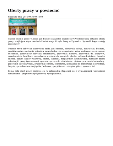 Oferty pracy w powiecie! Napisano dnia: 2016-09-30 09:10:00 Chcesz zmienić pracę? A może już dłuższy czas jesteś bezrobotny? Przedstawiamy aktualne oferty pracy, znajdujące się w zasobach Powiatowego Urzędu Pracy w Zgorzelcu. Sprawdź, kogo szukają pracodawcy! Obecnie trwa nabór na stanowiska takie jak: barman, kierownik sklepu, konsultant, kucharz, manikiurzystka, mechanik pojazdów samochodowych, organizator usług konferencyjnych, pomoc kuchenna, pomocniczy robotnik szklarniowy, pracownik biurowy, pracownik ds. kredytów, przedstawiciel handlowy, sprzedawca, asystent ds. protetyki słuchu, cukiernik-piekarz, doradca klienta, kasjer, kasjer walutowy, kelner, laborant, magazynier, kosmetyczka, manager działu rekrutacji i pracy tymczasowej, operator sprzętu do odśnieżania, piekarz, pracownik budowlany, pracownik inwentaryzacji, pracownik ochrony, sekretarka, specjalista ds. marketingu i sprzedaży, florysta, sprzedawca w stacji paliw, bufetowa, specjalista ds. zakupów, pilarz, spawacz, itd. Pełna lista ofert pracy znajduje się w załączniku. Zapoznaj się z wymaganiami, warunkami zatrudnienia i proponowaną wysokością wynagrodzenia.