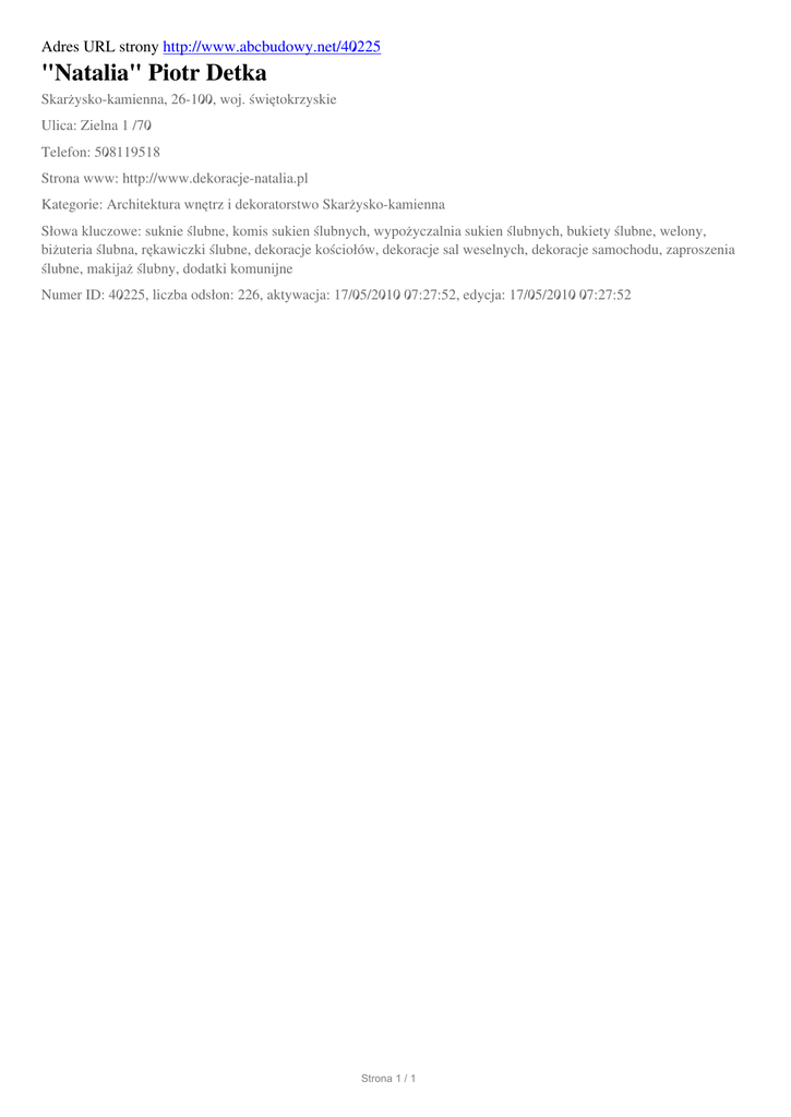 Adres URL strony http://www.abcbudowy.net/40225 "Natalia" Piotr Detka Skarżysko-kamienna, 26-100, woj. świętokrzyskie Ulica: Zielna 1 /70 Telefon: 508119518 Strona www: http://www.dekoracje-natalia.pl Kategorie: Architektura wnętrz i dekoratorstwo Skarżysko-kamienna Słowa kluczowe: suknie ślubne, komis sukien ślubnych, wypożyczalnia sukien ślubnych, bukiety ślubne, welony, biżuteria ślubna, rękawiczki ślubne, dekoracje kościołów, dekoracje sal weselnych, dekoracje samochodu, zaproszenia ślubne, makijaż ślubny, dodatki komunijne Numer ID: 40225, liczba odsłon: 226, aktywacja: 17/05/2010 07:27:52, edycja: 17/05/2010 07:27:52 Strona 1 / 1