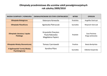 Olimpiady przedmiotowe dla uczniów szkół ponadgimnazjalnych rok szkolny 2009/2010 NAZWA OLIMPIADY / KONKURSU ZAKWALIFIKOWANI DO ETAPU CENTRALNEGO WYNIK OPIEKUN Olimpiada Biologiczna Katarzyna Karwacka finalistka Angelika Stańczyk Olimpiada Filozoficzna Agnieszka Pietruczuk laureatka Wojciech Gierczak Olimpiada Literatury i Języka Polskiego Krzysztofa Charyton Paula Rakowska Magdalena Papierz finalistki Ewa Piechota Kinga Jankowska Olimpiada Wiedzy Ekonomicznej Tomasz Czerniawski finalista Beata Berdyńska II Ogólnopolski Turniej Wiedzy Psychologicznej Karolina Pilarz laureatka Elżbieta Kacperska WYNIKI KONKURSÓW DLA SZKÓŁ PONADGIMNAZJALNYCH 2009/2010 NAZWA KONKURSU IMIĘ I NAZWISKO WYNIKI OPIEKUNOWIE III Konkurs Dziennikarski Bliżej niż myślisz” Agata Semeniuk wyróżnienie Mirosława Majzel Piotr Kuligowski Jakub Okoński Wojciech Smok Piotr Kuligowski Marta Kasyk Łukasz Rdzeń Karol Federowicz Michał Sklyar laureat IV miejsca drużynowo III miejsce Lilianna Stochmal LII Międzyszkolny Turniej Fizyczny LI Międzyszkolne Zawody Matematyczne III Konkurs Geograficzno‐Nautologiczny wyróżnienie VI Konkurs Wiedzy Ekonomicznej „Być przedsiębiorczym” Karolina Wiktorowska wyróżnienie Bożena Gusar II Wojewódzki Konkurs Języków Obcych ‐ Język angielski Anna Niedźwiedź wyróżnienie Tomasz Obiała Karolina Wiktorowska Piotr Surma Karolina Wiktorowska II m. w woj. IV m. w woj. VIII m. Agnieszka Czarnowska Mistrzostwa Pierwszej Pomocy Angelik Ciepła Małgorzat Heimrot Kaja Kłos Karolina Szumska Alicja Lisowska III m. Krystyna Domańska Młodzież Zapobiega Pożarom Piotr Patyk Michał Maćkowski Maksymilian Bojek II m. Konkurs Wiedzy z Upowszechniania Międzynarodowego Prawa Humanitarnego Konkurs Papieski Radosław Pokora VI miejsce zespołowo Izabela Fertała Beata Kamińska Łucja Niewiadomska Izabela Fertała Katarzyna Kowalik Bożena Gusar Krystyna Domańska Krystyna Domańska