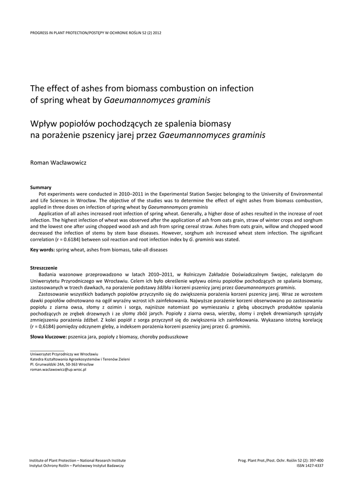 PROGRESS IN PLANT PROTECTION/POSTĘPY W OCHRONIE ROŚLIN 52 (2) 2012 The effect of ashes from biomass combustion on infection of spring wheat by Gaeumannomyces graminis Wpływ popiołów pochodzących ze spalenia biomasy na porażenie pszenicy jarej przez Gaeumannomyces graminis Roman Wacławowicz Summary Pot experiments were conducted in 2010–2011 in the Experimental Station Swojec belonging to the University of Environmental and Life Sciences in Wrocław. The objective of the studies was to determine the effect of eight ashes from biomass combustion, applied in three doses on infection of spring wheat by Gaeumannomyces graminis Application of all ashes increased root infection of spring wheat. Generally, a higher dose of ashes resulted in the increase of root infection. The highest infection of wheat was observed after the application of ash from oats grain, straw of winter crops and sorghum and the lowest one after using chopped wood ash and ash from spring cereal straw. Ashes from oats grain, willow and chopped wood decreased the infection of stems by stem base diseases. However, sorghum ash increased wheat stem infection. The significant correlation (r = 0.6184) between soil reaction and root infection index by G. graminis was stated. Key words: spring wheat, ashes from biomass, take-all diseases Streszczenie Badania wazonowe przeprowadzono w latach 2010–2011, w Rolniczym Zakładzie Doświadczalnym Swojec, należącym do Uniwersytetu Przyrodniczego we Wrocławiu. Celem ich było określenie wpływu ośmiu popiołów pochodzących ze spalania biomasy, zastosowanych w trzech dawkach, na porażenie podstawy źdźbła i korzeni pszenicy jarej przez Gaeumannomyces graminis. Zastosowanie wszystkich badanych popiołów przyczyniło się do zwiększenia porażenia korzeni pszenicy jarej. Wraz ze wzrostem dawki popiołów odnotowano na ogół wyraźny wzrost ich zainfekowania. Najwyższe porażenie korzeni obserwowano po zastosowaniu popiołu z ziarna owsa, słomy z ozimin i sorga, najniższe natomiast po wymieszaniu z glebą ubocznych produktów spalania pochodzących ze zrębek drzewnych i ze słomy zbóż jarych. Popioły z ziarna owsa, wierzby, słomy i zrębek drewnianych sprzyjały zmniejszeniu porażenia źdźbeł. Z kolei popiół z sorga przyczynił się do zwiększenia ich zainfekowania. Wykazano istotną korelację (r = 0,6184) pomiędzy odczynem gleby, a indeksem porażenia korzeni pszenicy jarej przez G. graminis. Słowa kluczowe: pszenica jara, popioły z biomasy, choroby podsuszkowe Uniwersytet Przyrodniczy we Wrocławiu Katedra Kształtowania Agroekosystemów i Terenów Zieleni Pl. Grunwaldzki 24A, 50-363 Wrocław [email protected] Institute of Plant Protection – National Research Institute Instytut Ochrony Roślin – Państwowy Instytut Badawczy Prog. Plant Prot./Post. Ochr. Roślin 52 (2): 397-400 ISSN 1427-4337 398 The effect of ashes from biomass on spring wheat infection / Wpływ popiołów z biomasy na porażenie pszenicy jarej Wstęp / Introduction Surowce roślinne wykorzystywane do celów energetycznych mogą wykazywać znaczne zróżnicowanie z punktu widzenia wartości energetycznej, ale także powstałe z nich popioły mają różny skład, właściwości, a także inna jest procentowa zawartość powstałego z nich popiołu (Kalembasa 2006; Kowalczyk-Juśko 2009; Piekarczyk i wsp. 2011a). Popioły z biomasy są jednymi z najstarszych nawozów mineralnych, zawierają niemal wszystkie składniki odżywcze oprócz azotu. Już od czasów wczesnohistorycznych popiół był stosowany w rolnictwie jako nawóz (Piekarczyk i wsp. 2011b). Rolnicze zagospodarowanie odpadów ze spalania wymaga jednak starannej analizy i rozważnej oceny. Z jednej strony popioły są źródłem składników pokarmowych dla roślin (makro- i mikroelementy), mają także właściwości odkwaszające (substytut nawozów wapniowych). Z drugiej strony zauważa się pewne niedogodności związane z zastosowaniem tego odpadu (ze względu na formę), a także zawartości w nich substancji szkodliwych (metale ciężkie) (Stout i wsp. 1997; Chojnacka i wsp. 2006; Górecka i wsp. 2006; Eichler-Loebermann 2006). Wartość odkwaszająca popiołów wynika z dużej koncentracji w nich węglanu wapnia i magnezu (Stout i wsp. 1997; Górecka i wsp. 2006; Piotrowski i UliaszBocheńczyk 2008). Alkaliczne pH popiołów powoduje, że mogą być także atrakcyjną alternatywą dla tradycyjnych nawozów odkwaszających. Wysokie pH popiołu nie zawsze jednak świadczy o skuteczności odkwaszającej, zależy to od wielu czynników, np. właściwości popiołu – ziarnistości, uwodnienia, granulacji, rozpuszczalności w wodzie, zawartości szeregu związków, a także buforowości gleby. Z tego względu wprowadzanie popiołów do gleby wymaga rozważnego stosowania, gdyż możliwe jest uszkodzenie struktury biologicznej gleby ze względu na dużą reaktywność popiołu, a także zmniejszenie populacji dżdżownic (Lickacz 2002; Górecka i wsp. 2006). W literaturze brak jest badań nad oddziaływaniem popiołu ze spalania biomasy na porażenie roślin przez patogeny powodujące choroby podsuszkowe, natomiast dobrze rozpoznany jest wpływ nawozów wapniowych na uszkodzenie roślin przez choroby podstawy źdźbła, choć poglądy autorów nie są jednoznaczne. Jedni uważają, że wapnowanie gleby wpływa na zwiększenie porażenia roślin przez Gaeumannomyces graminis (Glynne 1935; Reis i wsp. 1983; Coventry i Kollmorgen 1987; Murray i wsp. 1987; Ownley i wsp. 1992), inni natomiast po corocznym wprowadzeniu do gleby 0,7 t Ca stwierdzili obniżenie porażenia jęczmienia jarego przez choroby podstawy źdźbła (Blecharczyk i wsp. 2005). Z kolei Glenn i Sivasithamparam (1991) uważają, że wapnowanie gleby nie wykazuje jednoznacznego oddziaływania na tę grupę patogenów. Marks i wsp. (2004) dowodzą natomiast, że działanie wapna uzależnione jest od wcześniejszego ugniecenia gleby. Jeśli rola była nieugn