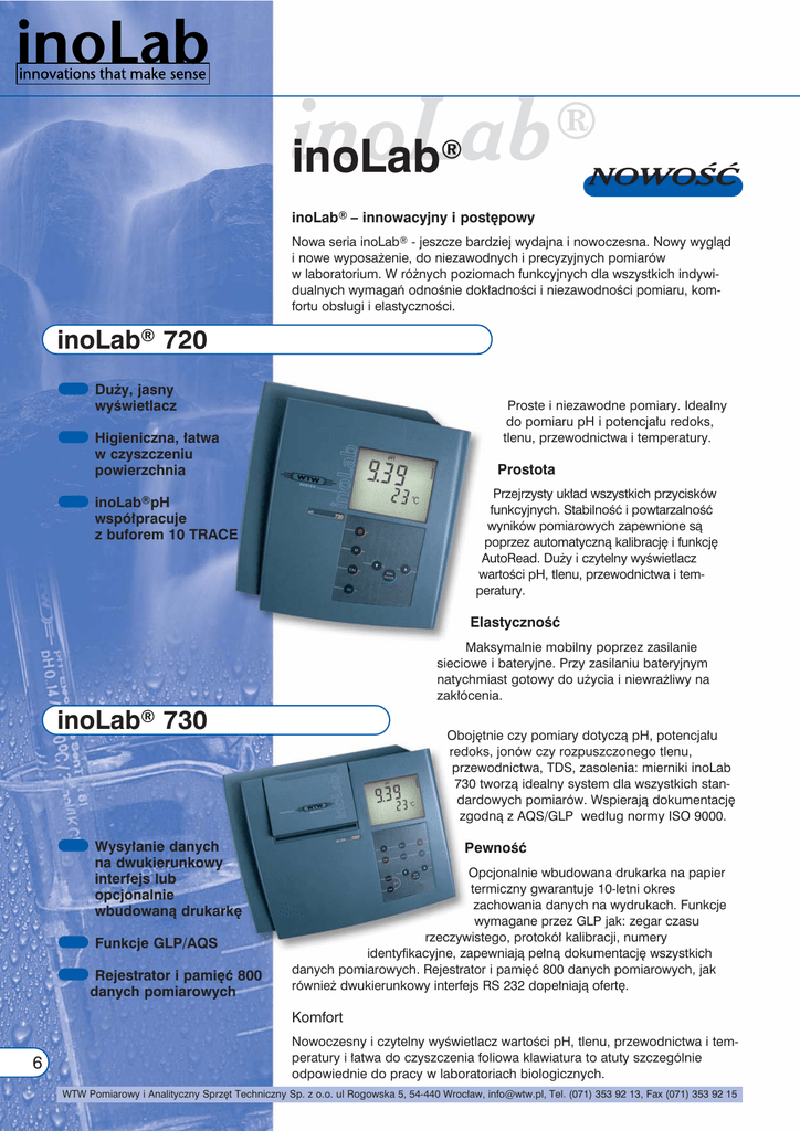 inoLab inoLab ® ® NOWOŚĆ inoLab® – innowacyjny i postępowy Nowa seria inoLab® - jeszcze bardziej wydajna i nowoczesna. Nowy wygląd i nowe wyposażenie, do niezawodnych i precyzyjnych pomiarów w laboratorium. W różnych poziomach funkcyjnych dla wszystkich indywidualnych wymagań odnośnie dokładności i niezawodności pomiaru, komfortu obsługi i elastyczności. inoLab® 720 Duży, jasny wyświetlacz Proste i niezawodne pomiary. Idealny do pomiaru pH i potencjału redoks, tlenu, przewodnictwa i temperatury. Higieniczna, łatwa w czyszczeniu powierzchnia Prostota Przejrzysty układ wszystkich przycisków funkcyjnych. Stabilność i powtarzalność wyników pomiarowych zapewnione są poprzez automatyczną kalibrację i funkcję AutoRead. Duży i czytelny wyświetlacz wartości pH, tlenu, przewodnictwa i temperatury. inoLab®pH współpracuje z buforem 10 TRACE Elastyczność Maksymalnie mobilny poprzez zasilanie sieciowe i bateryjne. Przy zasilaniu bateryjnym natychmiast gotowy do użycia i niewrażliwy na zakłócenia. inoLab® 730 Wysyłanie danych na dwukierunkowy interfejs lub opcjonalnie wbudowaną drukarkę Funkcje GLP/AQS Rejestrator i pamięć 800 danych pomiarowych Obojętnie czy pomiary dotyczą pH, potencjału redoks, jonów czy rozpuszczonego tlenu, przewodnictwa, TDS, zasolenia: mierniki inoLab 730 tworzą idealny system dla wszystkich standardowych pomiarów. Wspierają dokumentację zgodną z AQS/GLP według normy ISO 9000. Pewność Opcjonalnie wbudowana drukarka na papier termiczny gwarantuje 10-letni okres zachowania danych na wydrukach. Funkcje wymagane przez GLP jak: zegar czasu rzeczywistego, protokół kalibracji, numery identyfikacyjne, zapewniają pełną dokumentację wszystkich danych pomiarowych. Rejestrator i pamięć 800 danych pomiarowych, jak również dwukierunkowy interfejs RS 232 dopełniają ofertę. Komfort 6 Nowoczesny i czytelny wyświetlacz wartości pH, tlenu, przewodnictwa i temperatury i łatwa do czyszczenia foliowa klawiatura to atuty szczególnie odpowiednie do pracy w laboratoriach biologicznych. WTW Pomiarowy i Analityczny Sprzęt Techniczny Sp. z o.o. ul Rogowska 5, 54-440 Wrocław, [email protected], Tel. (071) 353 92 13, Fax (071) 353 92 15 inoLab® inoLab® 740/750 Opis ogólny mierników inoLab® Inteligencja Obszerne ujęcie danych Funkcje pomiarowe do wymagającej analityki laboratoryjnej Aktywny boks wielofunkcyjny posiada wszystkie funkcje pomiarowe, liczne możliwości rozbudowy, przyłącza, gniazda wtykowe i galwanicznie oddzielony interfejs do sterowania poprzez PC lub terminal. Przyciskami Run/Enter i AutoRead pomiar uruchamiany jest bezpośrednio na miejscu pracy. Zintegrowana elektronika natychmiast przetwarza sygnały pomiarowe i przygotowuje je do komunikacji z pozostałymi urządzeniami peryferyjnymi. Mieniki kieszonkowe Obsługa poprzez PC lub terminal VARIO InoLab® 740 można połączyć bezpośrednio z PC. Dołączone do miernika oprogramowanie z rozwijanym menu ułatwia konfigurację i kalibrację. Znajdujący się w dostawie pakiet programu „inoLab® pilot“ zapewnia pełną dwukierunkową komunikację miernika z komputerem, nadzoruje pomiar, przeprowadza transmisję danych i ich zapis na komputerze. Dokumentacja wyników przeprowadzona w formie tabelarycznej lub graficznej dostępna jest w dwóch trybach: bezpośrednim - online i pośrednim, z pamięci komputera offline. ProfiLine 197i Komunikatywność Ready to go Zestaw SET dla inoLab® 740 składa się z inteligentnego boksu wielofunkcyjnego, terminala oraz z oprogramowania „MultiLab pilot“, czujniki do wyboru oraz bogate wyposażenie. WTW Pomiarowy i Analityczny Sprzęt Techniczny Sp. z o.o. ul Rogowska 5, 54-440 Wrocław, [email protected], Tel. (071) 353 92 13, Fax (071) 353 92 15 7 ProfiLine Przenośne mierniki ProfiLine 197i Wytrzymały, wodoszczelny Precyzyjny, wszechstronny Do pomiarów głębinowych do 100 m Niezniszczalny i wodoszczelny, niezawodny i pewny: Niezniszczalny i wodoszczelny, niezawodny i pewny: Przenośne urządzenia ProfiLine 197i ze względu na swoją obudowę i dane techniczne znajdują się w ekstra klasie - zarówno mierników terenowych, jak i w laboratoryjnych. Urządzenia te cechuje wysoka wytrzymałość i odporność na uderzenia. Aparaty te są zarówno odporne na zachlapania strumieniem wody (IP 66), jak i na zanurzenia (IP 67). Do głębokich pomiarów dostępna jest specjalna armatura z kablem dł. do 100m. Wbudowany akumulator zapewniający do 600 godzin pracy, pasek do zawieszania, uchwyt do przenoszenia i ustawiania aparatu, jak również wbudowany kołczan na elektrody czynią z ProfiLine 197i wielofunkcyjny miernik do pomiarów terenowych i laboratoryjnych. ProfiLine 197i przekonuje do siebie danymi technicznymi, przenoszeniem danych za pomocą oprogramowania MultiLab® pilot jak również obszernym wyposażeniem ze specjalnymi funkcjami. ProfiLine jest odpowiedni do wszystkich pomiarów: obojętnie czy do pH, rozpuszczonego tlenu, przewodnictwa. Przykład: głębinowy pomiar tlenu Armatura głębinowa TA 197 Oxi ze zintegrowanym czujnikiem temperatury, kabel do 100 m z wodoszczelną wtyczką (IP 67), stalowe uzbrojenie i odkręcalny kosz ochronny, odporna na ciśnienie, pasująca do 2“ otworów wiertniczych. 8 Mieszadło bateryjne BR 325 do profilowych i głębinowych pomiarów. WTW Pomiarowy i Analityczny Sprzęt Techniczny Sp. z o.o. ul Rogowska 5, 54-440 Wrocław, [email protected], Tel. (071) 353 92 13, Fax (071) 353 92 15 inoLab® Przenośne i kieszonkowe mierniki Mieniki kieszonkowe ProfiLine 197i Mierniki kieszonkowe serii 315i, 330i i 340i zapewniają niezawodność pomiaru w trudnych warunkach terenowych. Te urządzenia, ważące zaledwie 400 g, są odporne na zachlapanie strumieniem wody wg IP 66, a także spełniają wymagania IP 67. Mierniki kieszonkowe 315i VARIO Proste Prosta obsługa oznacza unikanie błędów. Wszystkie przyciski funkcyjne serii 315i można obsługiwać także w rękawi