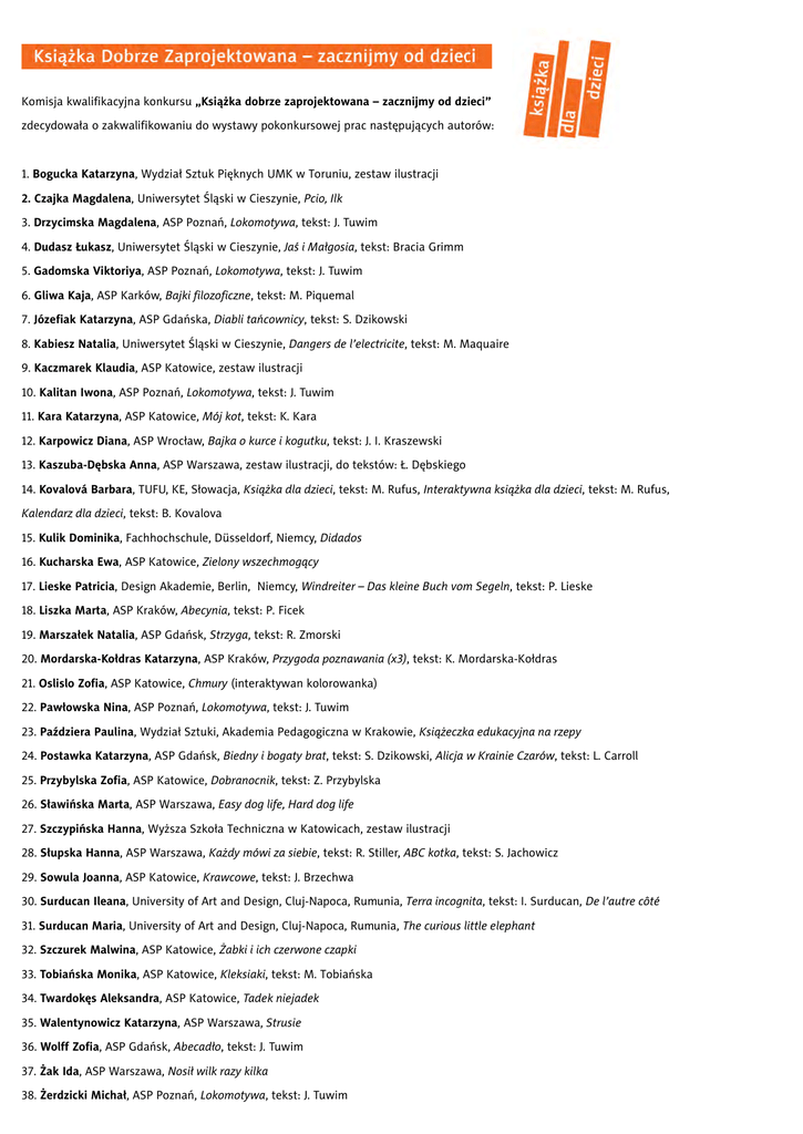 Komisja kwalifikacyjna konkursu „Książka dobrze zaprojektowana – zacznijmy od dzieci” zdecydowała o zakwalifikowaniu do wystawy pokonkursowej prac następujących autorów: 1. Bogucka Katarzyna, Wydział Sztuk Pięknych UMK w Toruniu, zestaw ilustracji 2. Czajka Magdalena, Uniwersytet Śląski w Cieszynie, Pcio, Ilk 3. Drzycimska Magdalena, ASP Poznań, Lokomotywa, tekst: J. Tuwim 4. Dudasz Łukasz, Uniwersytet Śląski w Cieszynie, Jaś i Małgosia, tekst: Bracia Grimm 5. Gadomska Viktoriya, ASP Poznań, Lokomotywa, tekst: J. Tuwim 6. Gliwa Kaja, ASP Karków, Bajki filozoficzne, tekst: M. Piquemal 7. Józefiak Katarzyna, ASP Gdańska, Diabli tańcownicy, tekst: S. Dzikowski 8. Kabiesz Natalia, Uniwersytet Śląski w Cieszynie, Dangers de l’electricite, tekst: M. Maquaire 9. Kaczmarek Klaudia, ASP Katowice, zestaw ilustracji 10. Kalitan Iwona, ASP Poznań, Lokomotywa, tekst: J. Tuwim 11. Kara Katarzyna, ASP Katowice, Mój kot, tekst: K. Kara 12. Karpowicz Diana, ASP Wrocław, Bajka o kurce i kogutku, tekst: J. I. Kraszewski 13. Kaszuba-Dębska Anna, ASP Warszawa, zestaw ilustracji, do tekstów: Ł. Dębskiego 14. Kovalová Barbara, TUFU, KE, Słowacja, Książka dla dzieci, tekst: M. Rufus, Interaktywna książka dla dzieci, tekst: M. Rufus, Kalendarz dla dzieci, tekst: B. Kovalova 15. Kulik Dominika, Fachhochschule, Düsseldorf, Niemcy, Didados 16. Kucharska Ewa, ASP Katowice, Zielony wszechmogący 17. Lieske Patricia, Design Akademie, Berlin, Niemcy, Windreiter – Das kleine Buch vom Segeln, tekst: P. Lieske 18. Liszka Marta, ASP Kraków, Abecynia, tekst: P. Ficek 19. Marszałek Natalia, ASP Gdańsk, Strzyga, tekst: R. Zmorski 20. Mordarska-Kołdras Katarzyna, ASP Kraków, Przygoda poznawania (x3), tekst: K. Mordarska-Kołdras 21. Oslislo Zofia, ASP Katowice, Chmury (interaktywan kolorowanka) 22. Pawłowska Nina, ASP Poznań, Lokomotywa, tekst: J. Tuwim 23. Paździera Paulina, Wydział Sztuki, Akademia Pedagogiczna w Krakowie, Książeczka edukacyjna na rzepy 24. Postawka Katarzyna, ASP Gdańsk, Biedny i bogaty brat, tekst: S. Dzikowski, Alicja w Krainie Czarów, tekst: L. Carroll 25. Przybylska Zofia, ASP Katowice, Dobranocnik, tekst: Z. Przybylska 26. Sławińska Marta, ASP Warszawa, Easy dog life, Hard dog life 27. Szczypińska Hanna, Wyższa Szkoła Techniczna w Katowicach, zestaw ilustracji 28. Słupska Hanna, ASP Warszawa, Każdy mówi za siebie, tekst: R. Stiller, ABC kotka, tekst: S. Jachowicz 29. Sowula Joanna, ASP Katowice, Krawcowe, tekst: J. Brzechwa 30. Surducan Ileana, University of Art and Design, Cluj-Napoca, Rumunia, Terra incognita, tekst: I. Surducan, De l’autre côté 31. Surducan Maria, University of Art and Design, Cluj-Napoca, Rumunia, The curious little elephant 32. Szczurek Malwina, ASP Katowice, Żabki i ich czerwone czapki 33. Tobiańska Monika, ASP Katowice, Kleksiaki, tekst: M. Tobiańska 34. Twardokęs Aleksandra, ASP Katowice, Tadek niejadek 35. Walentynowicz Katarzyna, ASP Warszawa, Strusie 36. Wolff Zofia, ASP Gdańsk, Abecadło, tekst: J. Tuwim 37. Żak Ida, ASP Warszawa, Nosił wilk razy kilka 38. Żerdzicki Michał, ASP Poznań, Lokomotywa, tekst: J. Tuwim