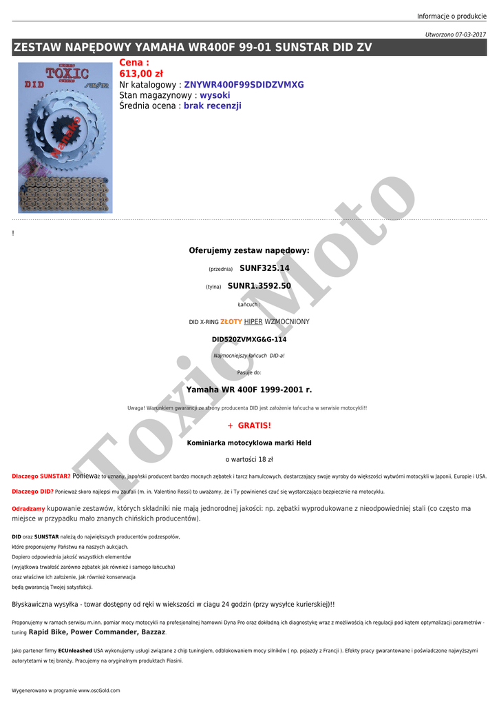 Informacje o produkcie Utworzono 07-03-2017 ZESTAW NAPĘDOWY YAMAHA WR400F 99-01 SUNSTAR DID ZV Cena : 613,00 zł ot o Nr katalogowy : ZNYWR400F99SDIDZVMXG Stan magazynowy : wysoki Średnia ocena : brak recenzji ! Oferujemy zestaw napędowy: (przednia) SUNR1.3592.50 M (tylna) SUNF325.14 Łańcuch : DID X-RING ZŁOTY HIPER WZMOCNIONY DID520ZVMXG&G-114 c Najmocniejszy łańcuch DID-a! Pasuje do: xi Yamaha WR 400F 1999-2001 r. Uwaga! Warunkiem gwarancji ze strony producenta DID jest założenie łańcucha w serwisie motocykli!! To + GRATIS! Kominiarka motocyklowa marki Held o wartości 18 zł Dlaczego SUNSTAR? Ponieważ to uznany, japoński producent bardzo mocnych zębatek i tarcz hamulcowych, dostarczający swoje wyroby do większości wytwórni motocykli w Japonii, Europie i USA. Dlaczego DID? Ponieważ skoro najlepsi mu zaufali (m. in. Valentino Rossi) to uważamy, że i Ty powinieneś czuć się wystarczająco bezpiecznie na motocyklu. Odradzamy kupowanie zestawów, których składniki nie mają jednorodnej jakości: np. zębatki wyprodukowane z nieodpowiedniej stali (co często ma miejsce w przypadku mało znanych chińskich producentów). DID oraz SUNSTAR należą do największych producentów podzespołów, które proponujemy Państwu na naszych aukcjach. Dopiero odpowiednia jakość wszystkich elementów (wyjątkowa trwałość zarówno zębatek jak również i samego łańcucha) oraz właściwe ich założenie, jak również konserwacja będą gwarancją Twojej satysfakcji. Błyskawiczna wysyłka - towar dostępny od ręki w wiekszości w ciagu 24 godzin (przy wysyłce kurierskiej)!! Proponujemy w ramach serwisu m.inn. pomiar mocy motocykli na profesjonalnej hamowni Dyna Pro oraz dokładną ich diagnostykę wraz z możliwością ich regulacji pod kątem optymalizacji parametrów tuning Rapid Bike, Power Commander, Bazzaz. Jako partener firmy ECUnleashed USA wykonujemy usługi związane z chip tuningiem, odblokowaniem mocy silników ( np. pojazdy z Francji ). Efekty pracy gwarantowane i poświadczone najwyższymi autorytetami w tej branży. Pracujemy na oryginalnym produktach Piasini. Wygenerowano w programie www.oscGold.com c xi To M ot o