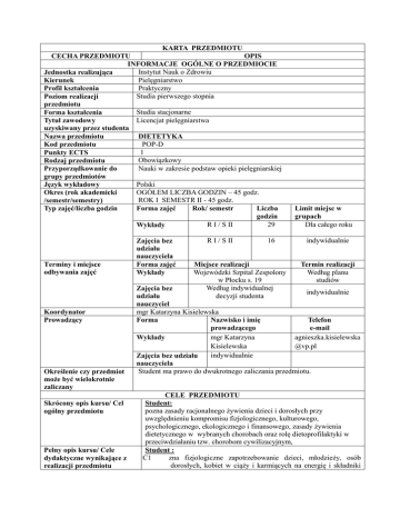 KARTA PRZEDMIOTU CECHA PRZEDMIOTU OPIS INFORMACJE OGÓLNE O PRZEDMIOCIE Instytut Nauk o Zdrowiu Jednostka realizująca Pielęgniarstwo Kierunek Praktyczny Profil kształcenia Studia pierwszego stopnia Poziom realizacji przedmiotu Studia stacjonarne Forma kształcenia Licencjat pielęgniarstwa Tytuł zawodowy uzyskiwany przez studenta Nazwa przedmiotu DIETETYKA POP-D Kod przedmiotu 1 Punkty ECTS Obowiązkowy Rodzaj przedmiotu Nauki w zakresie podstaw opieki pielęgniarskiej Przyporządkowanie do grupy przedmiotów Polski Język wykładowy OGÓŁEM LICZBA GODZIN – 45 godz. Okres (rok akademicki ROK I SEMESTR II - 45 godz. /semestr/semestry) Typ zajęć/liczba godzin Forma zajęć Rok/ semestr Liczba godzin R I / S II 29 Wykłady Terminy i miejsce odbywania zajęć Koordynator Prowadzący Określenie czy przedmiot może być wielokrotnie zaliczany Skrócony opis kursu/ Cel ogólny przedmiotu Pełny opis kursu/ Cele dydaktyczne wynikające z realizacji przedmiotu Zajęcia bez udziału nauczyciela Forma zajęć Wykłady R I / S II 16 Miejsce realizacji Wojewódzki Szpital Zespolony w Płocku s. 19 Według indywidualnej decyzji studenta Limit miejsc w grupach Dla całego roku indywidualnie Termin realizacji Według planu studiów Zajęcia bez indywidualnie udziału nauczyciel mgr Katarzyna Kisielewska Forma Nazwisko i imię Telefon prowadzącego e-mail mgr Katarzyna agnieszka.kisielewska Wykłady Kisielewska @vp.pl indywidualnie Zajęcia bez udziału nauczyciela Student ma prawo do dwukrotnego zaliczania przedmiotu. CELE PRZEDMIOTU Student: pozna zasady racjonalnego żywienia dzieci i dorosłych przy uwzględnieniu kompromisu fizjologicznego, kulturowego, psychologicznego, ekologicznego i finansowego, zasady żywienia dietetycznego w wybranych chorobach oraz rolę dietoprofilaktyki w przeciwdziałaniu tzw. chorobom cywilizacyjnym, Student : C1 zna fizjologiczne zapotrzebowanie dzieci, młodzieży, osób dorosłych, kobiet w ciąży i karmiących na energię i składniki odżywcze (białko, tłuszcze, węglowodany, składniki mineralne, witaminy, błonnik pokarmowy), C2 omawia zasady leczenia żywienia (żywienie dojelitowe i pozajelitowe), jak również zasady żywienia w wybranych chorobach, C3 posiada umiejętności rozpoznania i prowadzenia edukacji żywieniowej, C4 rozumie zakres udziału pielęgniarki w leczeniu żywieniowym, C5 umie opracować i przeprowadzić wywiad żywieniowy umożliwiający ocenę błędów w żywieniu, C6 posiada umiejętności dokonania oceny stanu odżywienia z wykorzystaniem metod antropometrycznych i biochemicznych, C7 dostrzega indywidualizm pacjenta, C8 wdraża zasady etyki zawodowej. WYMAGANIA WSTĘPNE Podstawy anatomii i fizjologii człowieka, biochemii i biologii Wymagania wstępne prac na poziomie szkoły ponadgimnazjalnej. pisemnych EFEKTY KSZTAŁCENIA PRZEDMIOT Wykaz uzyskanych Student: umiejętności/ efekty uczenia się W1. definiuje zapotrzebowanie (ilościowe i jakościowe) organizmu na składniki pokarmowe niezbędne - WIEDZA do utrzymania życia w warunkach zdrowia i choroby. W2. wymienia zasady żywienia osób zdrowych w różnym wieku i charakteryzuje istotę żywienia dojelitowego i pozajelitowego. W3. zna zasady profilaktyki i leczenia dietetycznego oraz powikłań dietoterapii. Wykaz uzyskanych Student: umiejętności/ efekty uczenia się U1 pomaga choremu w jedzeniu, wydalaniu, poruszaniu się i dbaniu o higienę osobistą. - UMIEJĘTNOŚCI U2. wykorzystuje różne techniki karmienia pacjenta. U3.ocenia stan odżywienia organizmu z wykorzystaniem metod antropometrycznych, biochemicznych i badania podmiotowego U4. prowadzi poradnictwo w zakresie żywienia dorosłych oraz dzieci zdrowych. U5. stosuje wybrane diety terapeutyczne w otyłości, niedożywieniu, cukrzycy, hyperlipidemii, nadciśnieniu tętniczym, chorobach serca i naczyń krwionośnych, trzustki i wątroby. Wykaz uzyskanych Student: umiejętności/ efekty uczenia się K1. systematycznie wzbogaca wiedzę zawodową i kształtuje umiejętności dążąc do profesjonalizmu, – KOMPETENCJE SPOŁECZNE EFEKTY KSZTAŁCENIA WYKŁADY Wykaz uzyskanych umiejętności/ Student: W1. charakteryzuje składniki odżywcze i ich znaczenie w efekty uczenia się - WIEDZA organizmie, W2. omawia normy żywienia i wyżywienia, W3. wymienia ilościowe i jakościowe błędy Polaków, W4. charakteryzuje zasady planowania i oceny żywienia różnych grup ludności oraz zasady planowania i układania jadłospisów dla osób zdrowych, W5. wymienia zasady oceny stanu odżywienia, W6. omawia i charakteryzuje diety, W7. wyjaśnia konsekwencje niedożywienia, W8. odróżnia zasady żywienia człowieka w różnych stanach chorobowych. Wykaz uzyskanych umiejętności/ Student: U1. przeprowadza ocenę stanu odżywienia oraz jadłospisu, efekty uczenia się U2. planuje jadłospisy dla osób zdrowych, UMIEJĘTNOŚCI U3. rozpoznaje przyczyny ilościowych i jakościowych błędów żywieniowych, U4. rozpoznaje, planuje i przeprowadza edukację żywieniową, U5. planuje dietę leczniczą w podstawowych jednostkach chorobowych, U6. monitoruje chorego żywionego dojelitowe i parenteralne, U7. opracowuje wywiad żywieniowy. Wykaz uzyskanych umiejętności/ Student: K1. wykazuje postawę otwartości w kontaktach interpersonalnych, efekty uczenia się – KOMPETENCJE SPOLECZNE K2. uwzględnia indywidualne potrzeby pacjenta, K3. wykazuje zainteresowanie rozwojem zawodowym, K4. przestrzega zasad określonych w standardach i procedurach żywienia człowieka zdrowego i chorego. TREŚCI PROGRAMOWE FORMA ZAJĘĆ TEMAT LICZBA SUMA GODZIN GODZIN 1. Procesy energetyczne i gospodarka wodna w 3 Wykłady 29 organizmie. Składniki odżywcze i ich znaczenie w organizmie. 2. Normy żywienia i wyżywienia. Zróżnicowanie diet 3 dzieci i dorosłych. 3. Ilościowe i jakościowe błędy żywieniowe Polaków. 4. Zasady planowania i oceny żywienia różnych grup ludności. Zasady planowania i układania jadłospisów dla osób zdrowych. 5. Zasa
