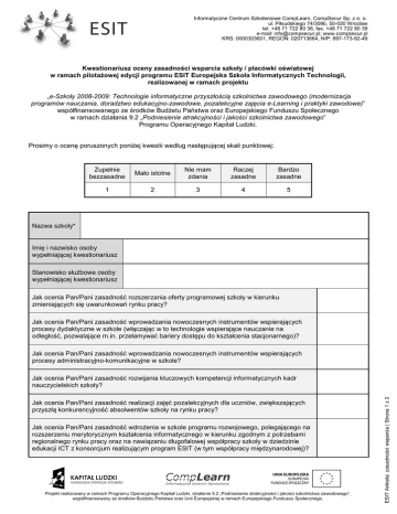 Informatyczne Centrum Szkoleniowe CompLearn, CompSecur Sp. z o. o. ul. Piłsudskiego 74/309b, 50-020 Wrocław tel. +48 71 722 80 38, fax. +48 71 722 80 39 e-mail: [email protected]; www.compsecur.pl KRS: 0000303601, REGON: 020713664, NIP: 897-173-92-49 Kwestionariusz oceny zasadności wsparcia szkoły / placówki oświatowej w ramach pilotażowej edycji programu ESIT Europejska Szkoła Informatycznych Technologii, realizowanej w ramach projektu „e-Szkoły 2008-2009: Technologie informatyczne przyszłością szkolnictwa zawodowego (modernizacja programów nauczania, doradztwo edukacyjno-zawodowe, pozalekcyjne zajęcia e-Learning i praktyki zawodowe)” współfinansowanego ze środków Budżetu Państwa oraz Europejskiego Funduszu Społecznego w ramach działania 9.2 „Podniesienie atrakcyjności i jakości szkolnictwa zawodowego” Programu Operacyjnego Kapitał Ludzki. Prosimy o ocenę poruszonych poniżej kwestii według następującej skali punktowej: Zupełnie bezzasadne Mało istotne Nie mam zdania Raczej zasadne Bardzo zasadne 1 2 3 4 5 Nazwa szkoły* Imię i nazwisko osoby wypełniającej kwestionariusz Stanowisko służbowe osoby wypełniającej kwestionariusz Jak ocenia Pan/Pani zasadność rozszerzania oferty programowej szkoły w kierunku zmieniających się uwarunkowań rynku pracy? Jak ocenia Pan/Pani zasadność wprowadzania nowoczesnych instrumentów wspierających procesy dydaktyczne w szkole (włączając w to technologie wspierające nauczanie na odległość, pozwalające m.in. przełamywać bariery dostępu do kształcenia stacjonarnego)? Jak ocenia Pan/Pani zasadność wprowadzania nowoczesnych instrumentów wspierających procesy administracyjno-komunikacyjne w szkole? Jak ocenia Pan/Pani zasadność realizacji zajęć pozalekcyjnych dla uczniów, zwiększających przyszłą konkurencyjność absolwentów szkoły na rynku pracy? Jak ocenia Pan/Pani zasadność wdrożenia w szkole programu rozwojowego, polegającego na rozszerzeniu merytorycznym kształcenia informatycznego w kierunku zgodnym z potrzebami regionalnego rynku pracy oraz na nawiązaniu długofalowej współpracy szkoły w dziedzinie edukacji ICT z konsorcjum realizującym program ESIT (w tym współpracy międzynarodowej)? Projekt realizowany w ramach Programu Operacyjnego Kapitał Ludzki, działanie 9.2 „Podniesienie atrakcyjności i jakości szkolnictwa zawodowego”, współfinansowany ze środków Budżetu Państwa oraz Unii Europejskiej w ramach Europejskiego Funduszu Społecznego. ESIT Ankieta zasadności wsparcia | Strona 1 z 2 Jak ocenia Pan/Pani zasadność rozwijania kluczowych kompetencji informatycznych kadr nauczycielskich szkoły? Informatyczne Centrum Szkoleniowe CompLearn, CompSecur Sp. z o. o. ul. Piłsudskiego 74/309b, 50-020 Wrocław tel. +48 71 722 80 38, fax. +48 71 722 80 39 e-mail: [email protected]; www.compsecur.pl KRS: 0000303601, REGON: 020713664, NIP: 897-173-92-49 Jak ocenia Pan/Pani zasadność wdrożenia w szkole platformy e-learning dla wsparcia procesów nauczania wraz z przeszkoleniem kadr nauczycielskich w zakresie obsługi systemu (włączając ocenę możliwości wsparcia uczniów dotkniętych barierami utrudnionego dostępu do kształcenia realizowanego w szkole w trybie stacjonarnym)? Jak ocenia Pan/Pani zasadność wdrożenia w szkole sieciowych aplikacji administracyjnych dla wsparcia procesów zarządzania i komunikacji wewnętrznej wraz z przeszkoleniem kadr nauczycielskich i administracyjnych? Jak ocenia Pan/Pani zasadność wdrożenia w szkole programu akredytacyjnego Europejskiego Instytutu Certyfikacji Informatycznej EITCI z siedzibą w Brukseli w zakresie standaryzacji zawodowego kształcenia informatycznego w Unii Europejskiej oraz utworzenia Szkolnego Centrum Zawodowej Certyfikacji Informatycznej EITCI? Jak ocenia Pan/Pani zasadność objęcia nauczycieli specjalistycznymi szkoleniami i doradztwem w zakresie kierunków merytorycznej modernizacji kształcenia zawodowego w obszarze informatycznym oraz wykorzystania technologii informatycznych dla wspierania procesów nauczania w trybie zdalnym? Jak ocenia Pan/Pani zasadność objęcia nauczycieli wsparciem ich udziału w seminariach i konferencjach zagranicznych w dziedzinie technologii informatycznych w ramach realizacji w programie ESIT komponentu współpracy ponadnarodowej z Instytutem EITCI w Brukseli? Jak ocenia Pan/Pani zasadność objęcia nauczycieli programem zawodowej certyfikacji informatycznej nauczycieli wdrażanym przez Instytut EITCI w Brukseli (umożliwiającym otrzymanie przez wszystkich nauczycieli szkoły europejskich certyfikatów informatycznych, dokumentujących, odpowiedni w procesach nauczania, poziom kompetencji informatycznych)? Jak ocenia Pan/Pani zasadność objęcia uczniów szkoły procedurą nadania międzynarodowych zawodowych certyfikatów informatycznych Europejskiego Instytutu Certyfikacji Informatycznej EITCI w Brukseli po ukończeniu specjalnego szkolenia e-learning realizowanego jako zajęcia pozalekcyjne w Internecie na platformie e-learning? Jak ocenia Pan/Pani zasadność objęcia uczniów szkoły informatycznym programem stażowym we Wrocławiu realizowanym z elementami telepracy przy wyposażeniu w służbowe komputery przenośne? Jak ocenia Pan/Pani zasadność objęcia uczniów szkoły programem doradztwa edukacyjnozawodowego, prowadzonego przez specjalistów w trybie zdalnym przez Internet? Projekt realizowany w ramach Programu Operacyjnego Kapitał Ludzki, działanie 9.2 „Podniesienie atrakcyjności i jakości szkolnictwa zawodowego”, współfinansowany ze środków Budżetu Państwa oraz Unii Europejskiej w ramach Europejskiego Funduszu Społecznego. ESIT Ankieta zasadności wsparcia | Strona 2 z 2 * W przypadku zespołu szkół należy wypełnić osobne formularze dla poszczególnych typów placówek (zasadnicza szkoła zawodowa, technikum, liceum i inne).