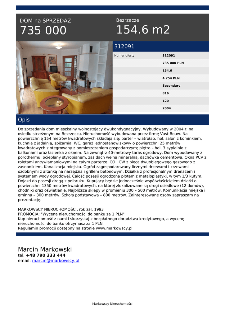 DOM na SPRZEDAŻ 735 000 Bezrzecze 154.6 m2 312091 Numer oferty 312091 735 000 PLN 154.6 4 754 PLN Secondary 816 120 2004 Opis Do sprzedania dom mieszkalny wolnostojący dwukondygnacyjny. Wybudowany w 2004 r. na osiedlu strzeżonym na Bezrzeczu. Nieruchomość wybudowana przez firmę Vast Bouw. Na powierzchnię 154 metrów kwadratowych składają się: parter – wiatrołap, hol, salon z kominkiem, kuchnia z jadalnią, spiżarnia, WC, garaż jednostanowiskowy o powierzchni 25 metrów kwadratowych zintegrowany z pomieszczeniem gospodarczym; piętro – hol, 3 sypialnie z balkonami oraz łazienka z oknem. Na zewnątrz 40-metrowy taras ogrodowy. Dom wybudowany z porothermu, ocieplany styropianem, zaś dach wełną mineralną, dachówka cementowa. Okna PCV z roletami antywłamaniowymi na całym parterze. CO i CW z pieca dwuobiegowego gazowego z zasobnikiem. Kanalizacja miejska. Ogród zagospodarowany licznymi drzewami i krzewami ozdobnymi z altanką na narzędzia i grillem betonowym. Działka z profesjonalnym drenażem i systemem wody ogrodowej. Całość posesji ogrodzona płotem z metaloplastyki, w tym 1/3 kutym. Dojazd do posesji drogą z polbruku. Kupujący będzie jednocześnie współwłaścicielem działki o powierzchni 1350 metrów kwadratowych, na której zlokalizowane są drogi osiedlowe (12 domów), chodniki oraz oświetlenie. Najbliższe sklepy w promieniu 300 – 500 metrów. Komunikacja miejska i gminna – 300 metrów. Szkoła podstawowa – 800 metrów. Zainteresowane osoby zapraszam na prezentację. MARKOWSCY NIERUCHOMOŚCI, rok zał. 1993 PROMOCJA: "Wycena nieruchomości do banku za 1 PLN" Kup nieruchomość z nami i skorzystaj z bezpłatnego doradztwa kredytowego, a wycenę nieruchomości do banku otrzymasz za 1 PLN. Regulamin promocji dostępny na stronie www.markowscy.pl Marcin Markowski tel. +48 790 333 444 email: [email protected] Markowscy Nieruchomości Powered by TCPDF (www.tcpdf.org)