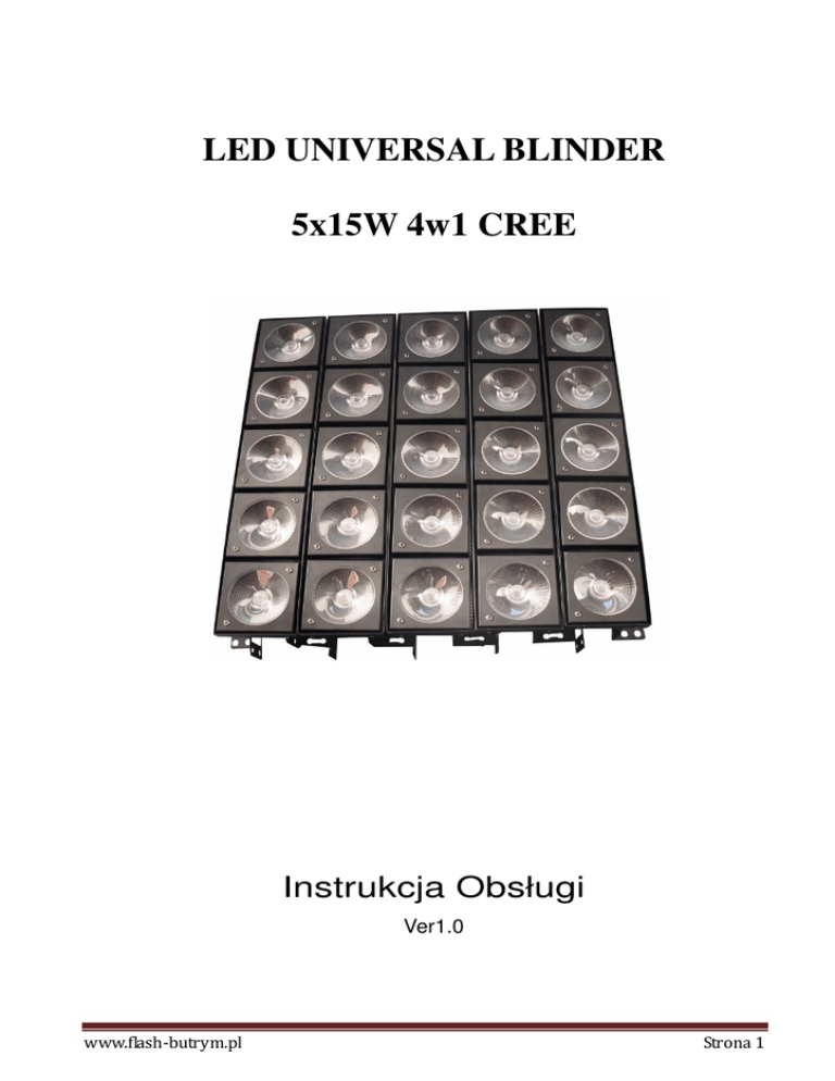 LED UNIVERSAL BLINDER 5x15W 4w1 CREE Instrukcja Obsługi Ver1.0 www.flash-butrym.pl Strona 1 Zawartość 1. Wstęp 1.1 Lista zawartości 1. 2 In st ru kc je roz p ak ow an i a 1.3 Zasilanie 1.4 Instrukcje bezpieczeństwa 2. Wprowadzenie 2.1 Funkcje 2. 2 K ana ł y D MX 3. Uruchomienie 3.1 Wymiana bezpiecznika 3. 2 Łą cz eni e os prz ęt u Dane kabli Kab e l D MX 3.3 Sterowanie 3-Pinowe a 5-Pinowe 3.4 Ustawianie szeregowego połączenia DMXowego 3.5 Łączenie Master/Slave 3.6 Umiejscowienie 4. Instrukcje Użytkowania 4.1 Nawigacja panelu kontrolnego 4. 2 Ma p a Me nu Tryb DMX 4. 3 Wart oś ci ka na łów D MX 5. Specyfikacje techniczne www.flash-butrym.pl Strona 2 1. Wstęp 1.1 Lista zawartości Nazwa Ilość LED Matrix Light 1 szt. Kabel zasilający 1 szt. 1.2 Instrukcje rozpa kowania Przy otrzymaniu sprzętu, należy delikatnie wyjąć go z kartonu, sprawdzić zawartość aby upewnić się że wszystkie rzeczy znajdują się w zestawie, i dotarły nieuszkodzone. Należy niezwłocznie poinformować dostawcę, jeżeli jakiegolwiek części, bądź opakowanie noszą ślady fizycznego uszkodzenia. Zaleca się zachowanie oryginalnego opakowania na wypadek gdyby osprzęt trzeba było wysłać z powrotem do dostawcy, w celu wymiany bądź serwisowania. 1.3 Zasilanie Aby ok reślić wymagania zasilania da nego sp rzętu , należy spojrzeć na tylnie panel, na k tórym nale ży odszuk ać I odc zytać tabliczk ę znamionową. Prąd podan y na tablic zce jest ś rednim prądem, po bieranym p rzy standardowej prac y urząd zenia. W szys tk ie urząd zenia muszą b yć zasilane be zpośrednio z sie ci zasilającej. Odrad za się zasilanie poprze z opornicę , nawet je żeli jej napięcie znamionowe odpowiada wymaganemu prze z głowicę. Uwaga! Należy upewnić się że przełącznik zasilania odpowiada podłączonej sieci. Niedopilnowanie podłączenia odpowiedniego zasilania, pod odpowiedni jego wybór może doprowadzić do uszkodzenia urządzenia. Wszystkie urządzenia muszę być podłączone pod prawidłowo uziemione źródła zasilania 1.4 Instrukcje bezpieczeństwa Proszę dokładnie przestudiować tę instrukcję, gdyż zawiera ona ważne informacje dotyczące podłączenia, użytkowania I konserwacji urządzenia. www.flash-butrym.pl Strona 3 Zaleca sie zachowanie tej instrukcji. Jeżeli ta głowica zostanie sprzedana innemu urzytkownikowi, zaleca się aby instrukcja również została do głowicy dołączona. Zawsze należy sprawdzać czy podłaczone jest odpowiednie napięcie, nie przekraczajace maksymalnego napięcia wskazanego do zasilania tego urządzenia. Produkt ten jest przeznaczony wyłacznie do pracy wewnętrznej. Nie należy narażać głowicy na zmoczenie lub zawilgocenie. Należy upewnić się że w pobliżu pracującej głowicy nie znajdują się żadne łatwopalne materiały lub substancje. Głowica ta powinna pracować w pomieszczeniach o odpowiedniej wentylacji, w odległości co najmniej 50 cm od jakichkolwiek powierzchni. Zaleca się regularne sprawdzanie otworów wentylacyjnych urządzenia. Zawsze należy upewniać sie że urządzenie jest odłączone od zasilania przed serwisowaniem czy wymianą bezpiecznika. Wymieniając bezpiecznik należy upewnić się że wymieniamy go na dokładnie taki sam. Nigdy nie należy nosić głowicy za górną część obudowy, do tego celu służą uchwyty po bokach urządzenia. Maksymalna temperatura otoczenia to 40℃ , praca w wyższych temperaturach może uszkodzić głowicę. Głowicy nigdy nie należy próbować napirawiać samemu. Naprawy dokonywane przez nieprzeszkolone osoby mogą prowadzić do jeszcze cięższych uszkodzeń. W razie usterek należy skontaktować się z lokalnym dostawcą, w kwestii serwisowania urządzenia. Zaleca sie sprawdzanie przewodu zasilajacego przed każdorazowym włączeniem urządzenia. Nigdy nie należy odłączać zasilania poprzez mocne pociąganie za wtyk zasilania. Należy unikać bezpośedniego kontaktu wiązki światła z oczami. 2. Wprowadzenie 2.1 Funkcje 15 kanałowe sterowanie z DMXa Pan :540°/ 630° Tilt:270°. Różne tryby strobowanie. Różne tryby wygaszania (Dimmer 0-100%). Wyświetlacz LCD Reset do ustawień fabrycznych. Opcja odwrócenia Pan/tilt . Dodatkowe wiatraki chłodzące. www.flash-butrym.pl Strona 4 2.2 Kanały DMX Kanał 24CH 8CH 1 2 3 4 5 6 Dimmer Strobo Wybór Funkcji Szybkość Funckji Red(pierwszy led) Green(pierwszy led) Dimmer Strobo Wybór Funkcji Szybkość Funckji Red(wszystkie) Green(wszystkie) 7 8 9 10 11 12 13 14 15 16 17 18 19 20 21 22 23 24 Blue(pierwszy led) White(pierwszy led) Red(drugi led) Gree(drugi led) Blue(drugi led) White(drugi led ) Red(trzeci led) Green(trzeci led) Blue(trzeci led) White( trzeci led) Red(czwarty led) Green(czwarty led) Blue(czwarty led) White(czwarty led) Red(piąty led) Green(piąty led) Blue(piąty led) White(piąty led) Blue(wszystkie) White(wszystkie) 3. Uruchomienie 3.1 Łączenie osprzętu Aby połączyć głowice w szereg wymagany będzie kabel szeregowy DMX'owy, zarówno dla sterowania z DMXa, jak i trybu Auto w konfiguracji Master/Slave. Maksymalna zalacana długość przewodu sygnałowego to 500 www.flash-butrym.pl Strona 5 metrów. Maxymalna zalecana ilość głowic w jednym ciągu sygnałowym to 32 sztuki. Połączenie sygna łowe Należy uzywać kabla belden 9841 lub podobnych, które spełniają normy EIA RS-485. Standardowe kable mikrofonowe nie zapewniają odpowiedniego przesyłu danych sygnałowych DMX, na dalsze odległości. Kable powinny mieć następujące charakterystyki: maksymalną pojemność między przewodami-30 pF/30 cm. Maksymalną pojemność między przewodem a izolacją -55 pF/30 cm. Maksymalną rezystancję of 20 Om/300m. Nominalną impedancję rzędu 100-140 Om. 3.2 Połączenie z DMX Urządzenia należy połączyć ze sobą 3 pinowym kablem sygnałowym tak, jak na wskazanym poniżej obrazku. Urządzenie może pracować w każdej pozycji, o ile zapewniona jest odpowiednia wentylacja. 4. Instrukcj