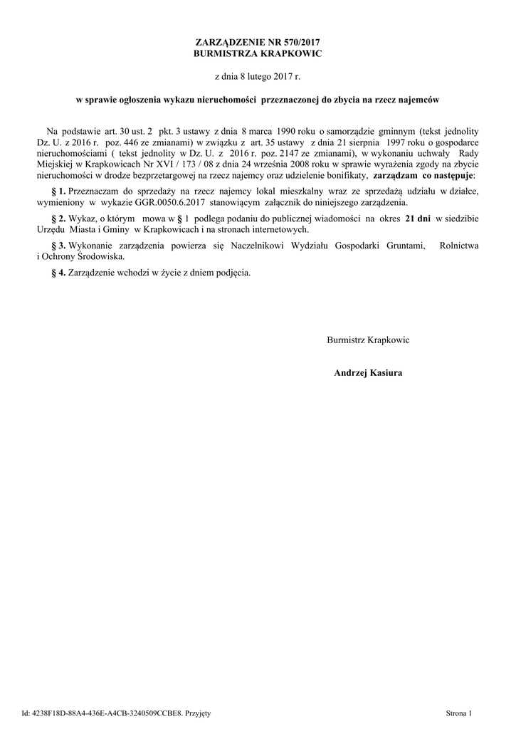 ZARZĄDZENIE NR 570/2017 BURMISTRZA KRAPKOWIC z dnia 8 lutego 2017 r. w sprawie ogłoszenia wykazu nieruchomości przeznaczonej do zbycia na rzecz najemców Na podstawie art. 30 ust. 2 pkt. 3 ustawy z dnia 8 marca 1990 roku o samorządzie gminnym (tekst jednolity Dz. U. z 2016 r. poz. 446 ze zmianami) w związku z art. 35 ustawy z dnia 21 sierpnia 1997 roku o gospodarce nieruchomościami ( tekst jednolity w Dz. U. z 2016 r. poz. 2147 ze zmianami), w wykonaniu uchwały Rady Miejskiej w Krapkowicach Nr XVI / 173 / 08 z dnia 24 września 2008 roku w sprawie wyrażenia zgody na zbycie nieruchomości w drodze bezprzetargowej na rzecz najemcy oraz udzielenie bonifikaty, zarządzam co następuje: § 1. Przeznaczam do sprzedaży na rzecz najemcy lokal mieszkalny wraz ze sprzedażą udziału w działce, wymieniony w wykazie GGR.0050.6.2017 stanowiącym załącznik do niniejszego zarządzenia. § 2. Wykaz, o którym mowa w § 1 podlega podaniu do publicznej wiadomości na okres 21 dni w siedzibie Urzędu Miasta i Gminy w Krapkowicach i na stronach internetowych. § 3. Wykonanie zarządzenia powierza się Naczelnikowi Wydziału Gospodarki Gruntami, i Ochrony Środowiska. Rolnictwa § 4. Zarządzenie wchodzi w życie z dniem podjęcia. Burmistrz Krapkowic Andrzej Kasiura Id: 4238F18D-88A4-436E-A4CB-3240509CCBE8. Przyjęty Strona 1 Nr GGR.0050.6.2017 Załącznik do Zarządzenia Nr 570/2017 Burmistrza Krapkowic z dnia 8 lutego 2017 roku W y k a z lokali mieszkalnych z udziałem w działce przeznaczonych do sprzedaży na rzecz najemcy Lp Położenie nieruchomości Oznaczenie nieruchomości Numer Księgi Wieczystej Przeznaczenie Nieruchomości I sposób jej zagospodarowania Cena nieruchomości w zł. Opis nieruchomości lokal mieszkalny nr 1 o powierzchni użytkowej 35,41 m Krapkowice 1 dz. nr 277/16 k.m. 5 ul. Parkowa 8C 0,0886 ha OP1S/0006649 1/6 Nieruchomość wolna jest od obciążeń i zobowiązań wobec osób trzecich brak aktualnego planu zagospodarowania przestrzennego 2 wraz z przynależną piwnicą nr 1C o powierzchni użytkowej 13,37 m 2 80 udział /1000 części w prawie własności części wspólnych budynku lokal mieszkalny 38 710,00 w tym udział w działce gruntowej 5 360,00 i działki 277/16 z mapy 5 o powierzchni 0,0886 ha Niniejszy wykaz zostaje wywieszony na tablicy ogłoszeń na okres 21 dni w siedzibie Urzędu Miasta i Gminy w Krapkowicach przy ul. 3 Maja 17 i 21 i na stronach internetowych. Termin złożenia wniosku przez osoby, którym przysługuje pierwszeństwo w nabyciu nieruchomości na podstawie art. 34 ust.1 pkt 1 i 2 ustawy z dnia 21 sierpnia 1997 roku o gospodarce nieruchomościami upływa z dniem 28 marca 2017 roku. Burmistrz Krapkowic Andrzej Kasiura Id: 4238F18D-88A4-436E-A4CB-3240509CCBE8. Przyjęty Strona 2