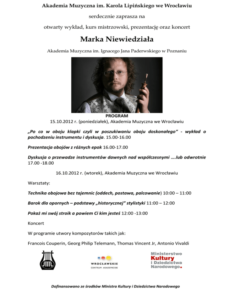 Akademia Muzyczna im. Karola Lipińskiego we Wrocławiu serdecznie zaprasza na otwarty wykład, kurs mistrzowski, prezentację oraz koncert Marka Niewiedziała Akademia Muzyczna im. Ignacego Jana Paderwskiego w Poznaniu PROGRAM 15.10.2012 r. (poniedziałek), Akademia Muzyczna we Wrocławiu „Po co w oboju klapki czyli w poszukiwaniu oboju doskonałego” - wykład o pochodzeniu instrumentu i dyskusja. 15.00-16.00 Prezentacja obojów z różnych epok 16.00-17.00 Dyskusja o przewadze instrumentów dawnych nad współczesnymi ….lub odwrotnie 17.00 -18.00 16.10.2012 r. (wtorek), Akademia Muzyczna we Wrocławiu Warsztaty: Technika obojowa bez tajemnic (oddech, postawa, palcowanie) 10:00 – 11:00 Barok dla opornych – podstawy „historycznej” stylistyki 11:00 – 12:00 Pokaż mi swój stroik a powiem Ci kim jesteś 12:00 -13:00 Koncert W programie utwory kompozytorów takich jak: Francois Couperin, Georg Philip Telemann, Thomas Vincent Jr, Antonio Vivaldi Dofinansowano ze środków Ministra Kultury i Dziedzictwa Narodowego