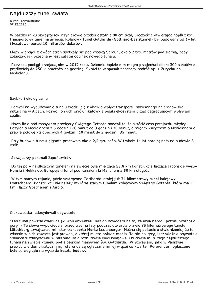 StudentBuduje.pl - Portal Studentów Budownictwa Najdłuższy tunel świata Autor: Administrator 07.12.2010. W październiku szwajcarscy inżynierowie przebili ostatnie 80 cm skał, uroczyście otwierając najdłuższy transportowy tunel na świecie. Kolejowy Tunel Gottharda (Gotthard-Basistunnel) był budowany od 14 lat i kosztował ponad 10 miliardów dolarów. Ekipy wiercące z dwóch stron spotkały się pod wioską Serdun, około 2 tys. metrów pod ziemią, żeby zobaczyć jak przebijany jest ostatni odcinek nowego tunelu. Pierwsze pociągi przejadą nim w 2017 roku. Dziennie będzie nim mogło przejechać około 300 składów z prędkością do 250 kilometrów na godzinę. Skróci to w sposób znaczący podróż np. z Zurychu do Mediolanu. Szybko i ekologicznie Pomysł na wybudowanie tunelu zrodził się z obaw o wpływ transportu naziemnego na środowisko naturalne w Alpach. Pozwoli on uchronić unikatowy alpejski ekosystem przed degradującym wpływem spalin. Nowa linia pod masywem przełęczy Świętego Gotarda pozwoli także skrócić czas przejazdu między Bazyleą a Mediolanem z 5 godzin i 20 minut do 3 godzin i 30 minut, a między Zurychem a Mediolanem o prawie połowę - z obecnych 4 godzin i 10 minut do 2 godzin i 35 minut. Przy budowie tunelu-giganta pracowało około 2,5 tys. osób. W trakcie 14 lat prac zginęło na budowie 8 osób. Szwajcarzy pokonali Japończyków Do tej pory najdłuższym tunelem na świecie była mierząca 53,8 km konstrukcja łącząca japońskie wyspy Honsiu i Hokkaido. Europejski tunel pod kanałem la Manche ma 50 km długości W tym samym rejonie, gdzie wydrążono Gottharda istniej już 34-kilometrowy tunel kolejowy Loetschberg. Konstrukcji nie należy mylić ze starym tunelem kolejowym Świętego Gotarda, który ma 15 km i łączy Göschenen z Airolo. Ciekawostka- zdecydowali obywatele "Ten tunel powstał dzięki dzięki woli obywateli. Jest on dowodem na to, że wola narodu potrafi przenosić góry" - Te słowa wypowiedział przed trzema laty podczas otwarcia prawie 35 kilometrowego tunelu Lötschberg szwajcarski minister transportu Moritz Leuenberger. Można się pokusić o stwierdzenie, że to właśnie w nich zawarta jest prawda, o której milczą polskie media. To nie politycy, lecz właśnie obywatele Szwajcarii zdecydowali w referendum o rozbudowie sieci kolejowej i budowie m.in. tego najdłuższego tunelu na świecie -tunelu pod alpejskim masywem Św. Gottharda. W Szwajcarii, jako w Państwie prawdziwie demokratycznym, referenda są ogłaszane mniej więcej co kwartał. Referendum ogłaszane było ze względu na wysokie koszta budowy. http://studentbuduje.pl Kreator PDF Utworzono 7 March, 2017, 23:04